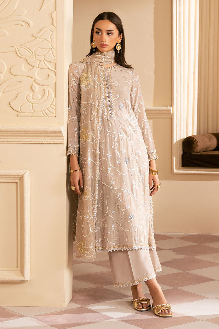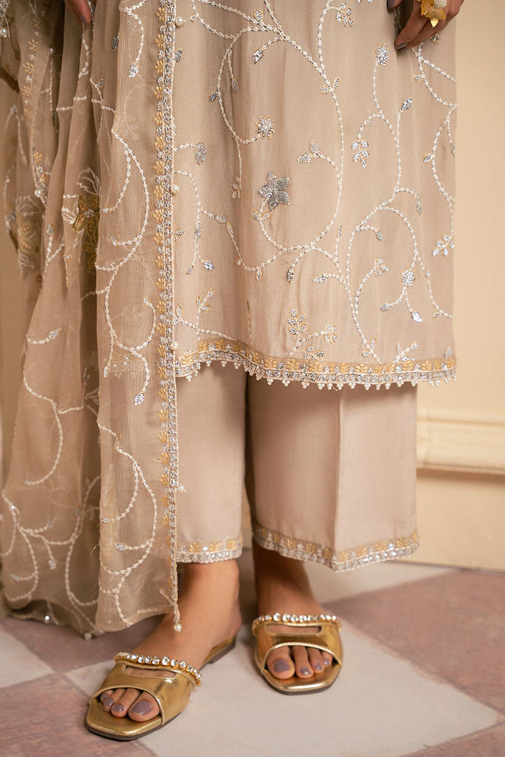 SHIRT Style straight(chiffon) Front heavily sequin embroidered, back plain dyed Neckline round with hand-embellished buttons Sleeves sequin embroidered TROUSER Silk dyed with embroidered borders culottes DUPATTA Chiffon sequin embroidered dupatta