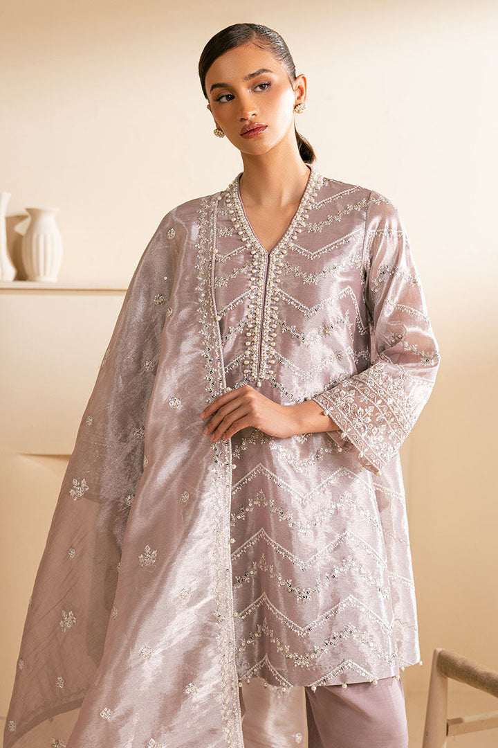 This 3-piece LILAC HAZE outfit features an A-line shirt with intricate sequin and pearl embroidery, as well as a high neck band with hand embellished details. The dyed and embroidered tapered shalwar creates a flattering silhouette, while the tissue dupatta adds a touch of elegance with its sequin embroidery.