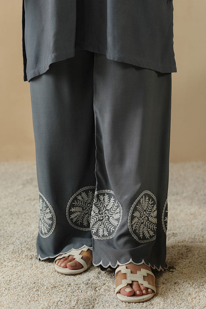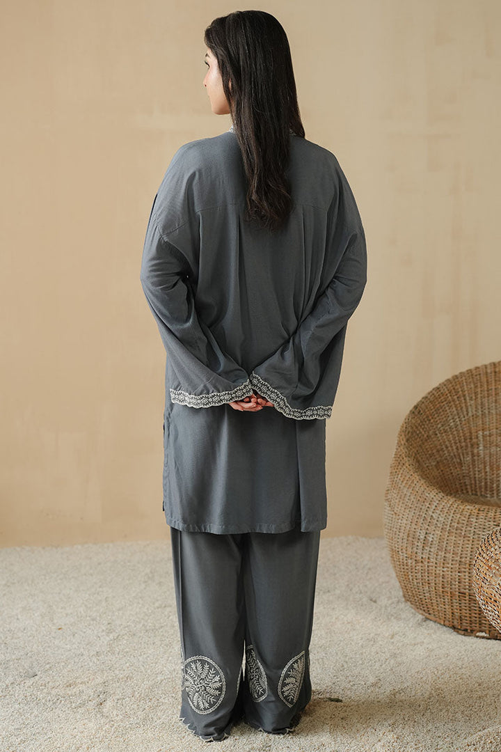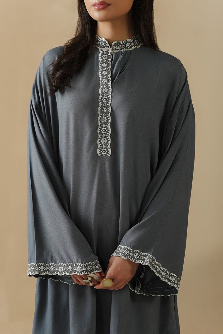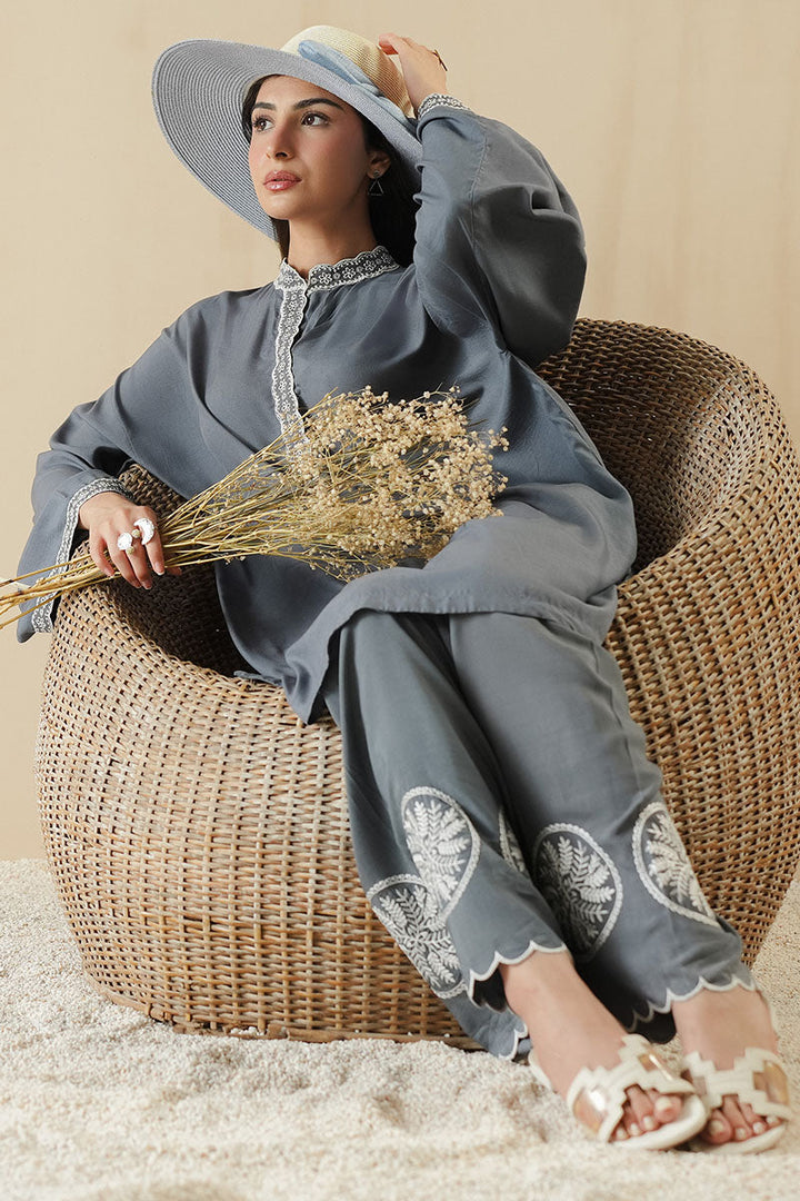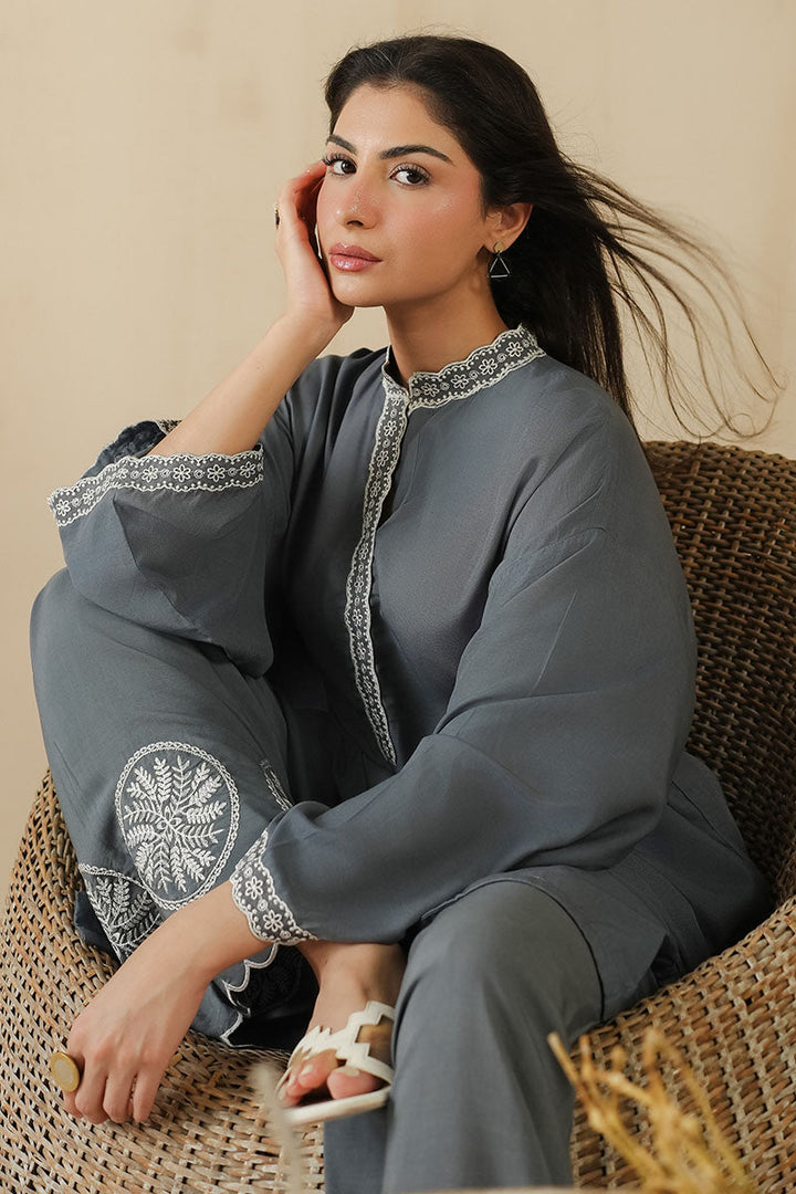 - This elegant two-piece set features an A-line boxy fit shirt with a plain dyed front and back, highlighted by an embroidered neckline band and placket for a refined touch. The box sleeves are finished with an embroidered border, adding subtle detail and sophistication. Complementing the shirt, the blended lawn trousers offer a comfortable, long box silhouette adorned with delicate embroidery, combining style and ease for a polished, expert look.