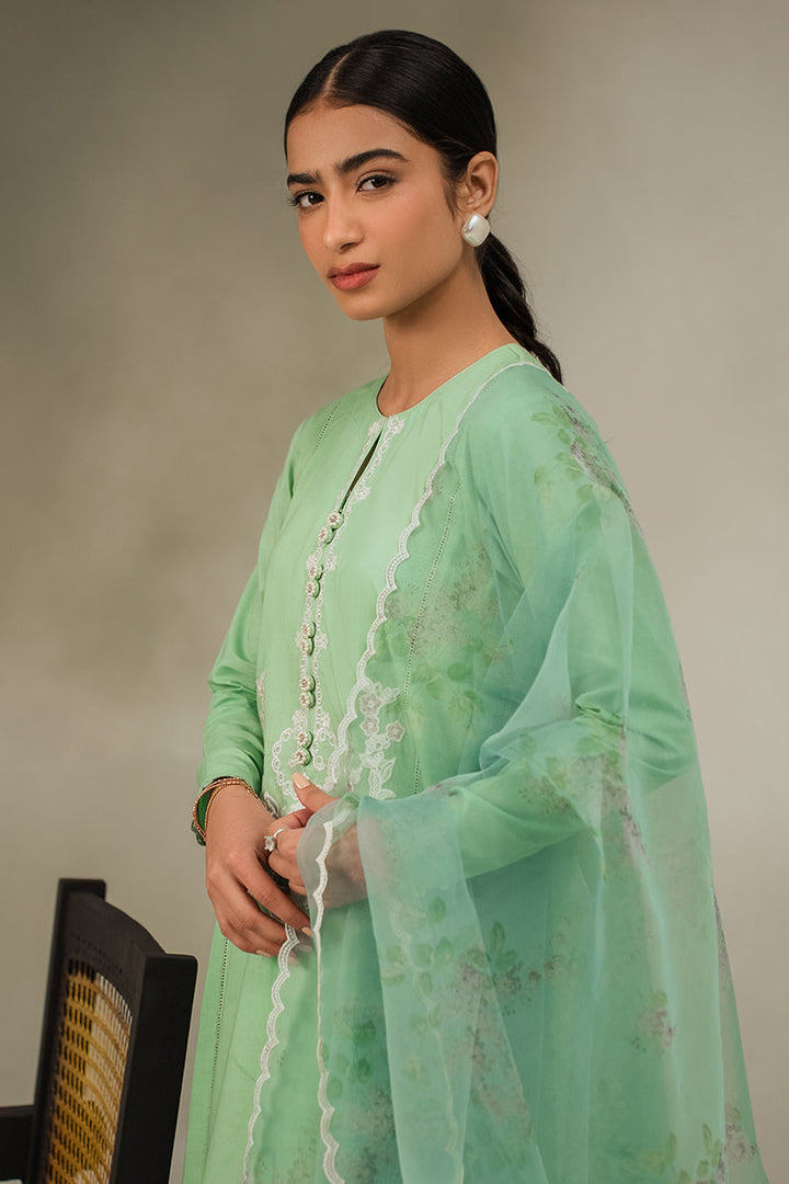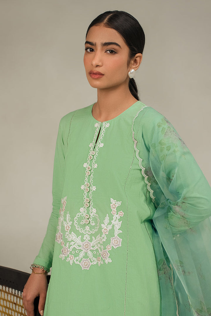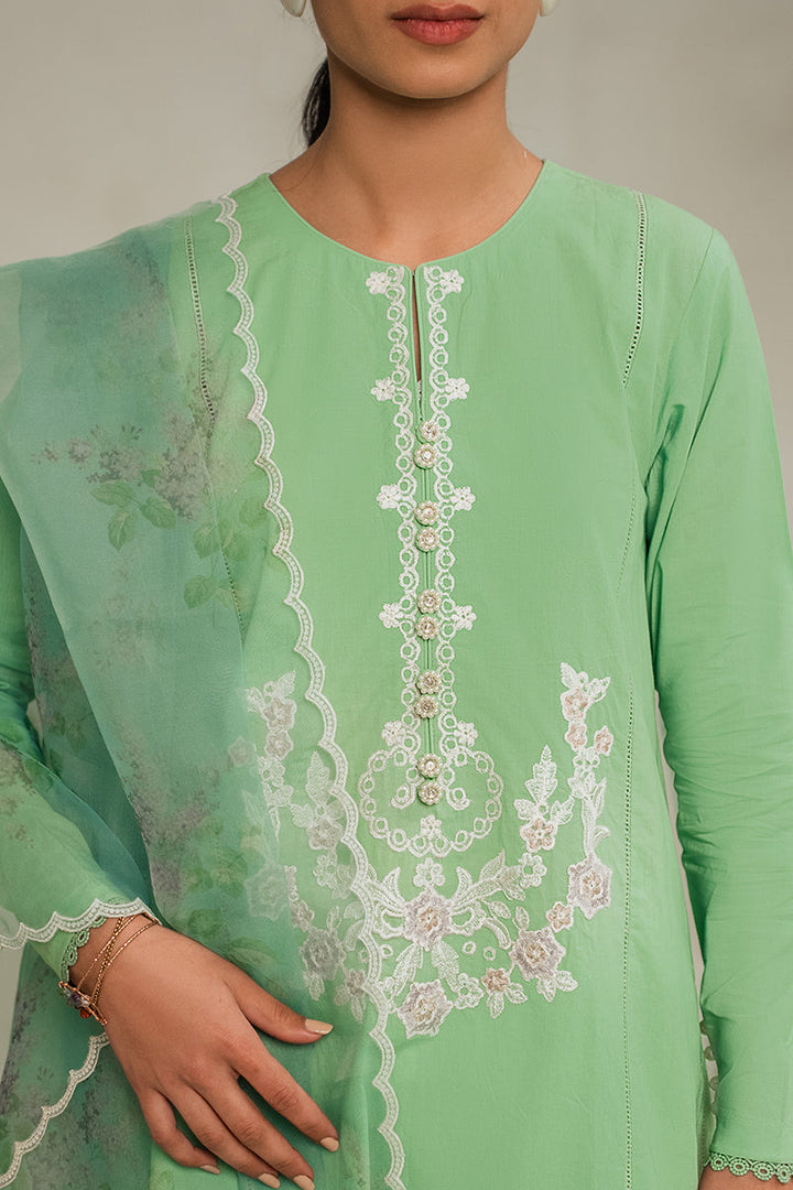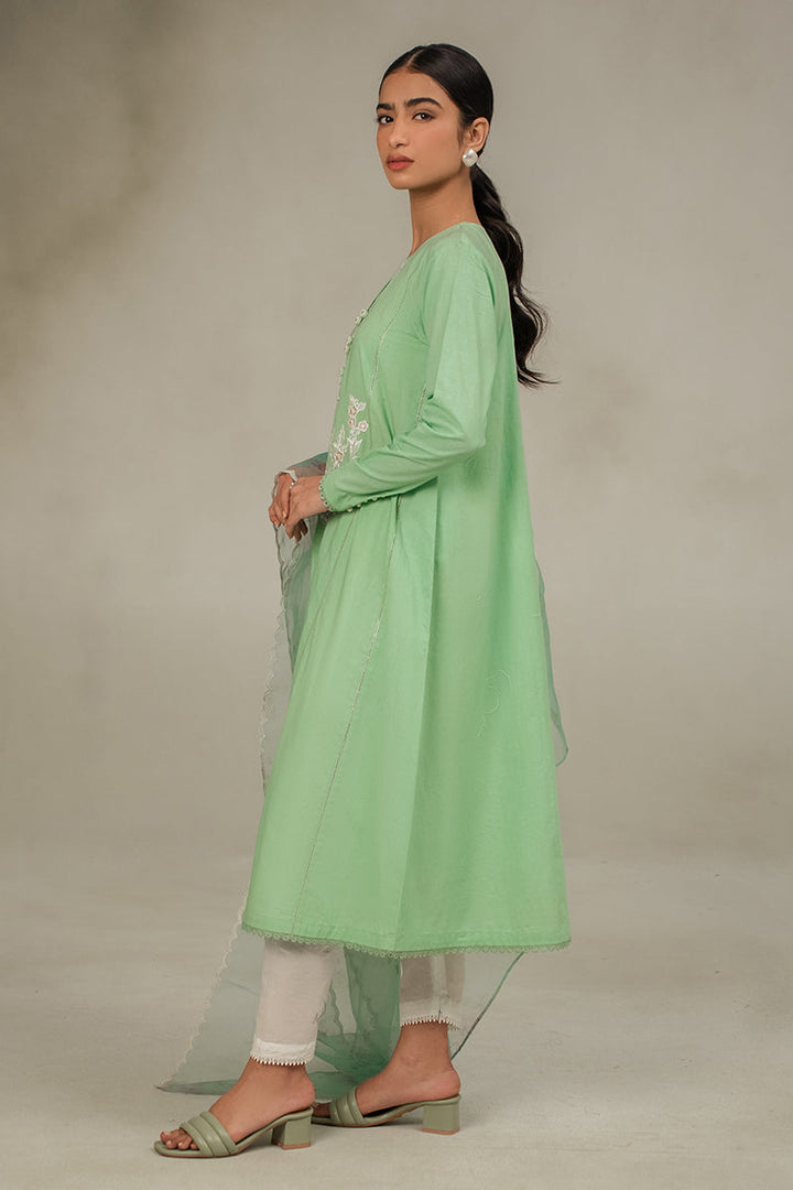 - Discover the elegance of our Morning Mist 2-piece set. Featuring a stylish a-line panelled design, front embroidery, and round neck with buttons, this set offers a sophisticated look. The fitted sleeves are embellished with lace and pearl buttons, and the organza embroidered and printed dupatta adds a touch of charm. Perfect for any occasion.