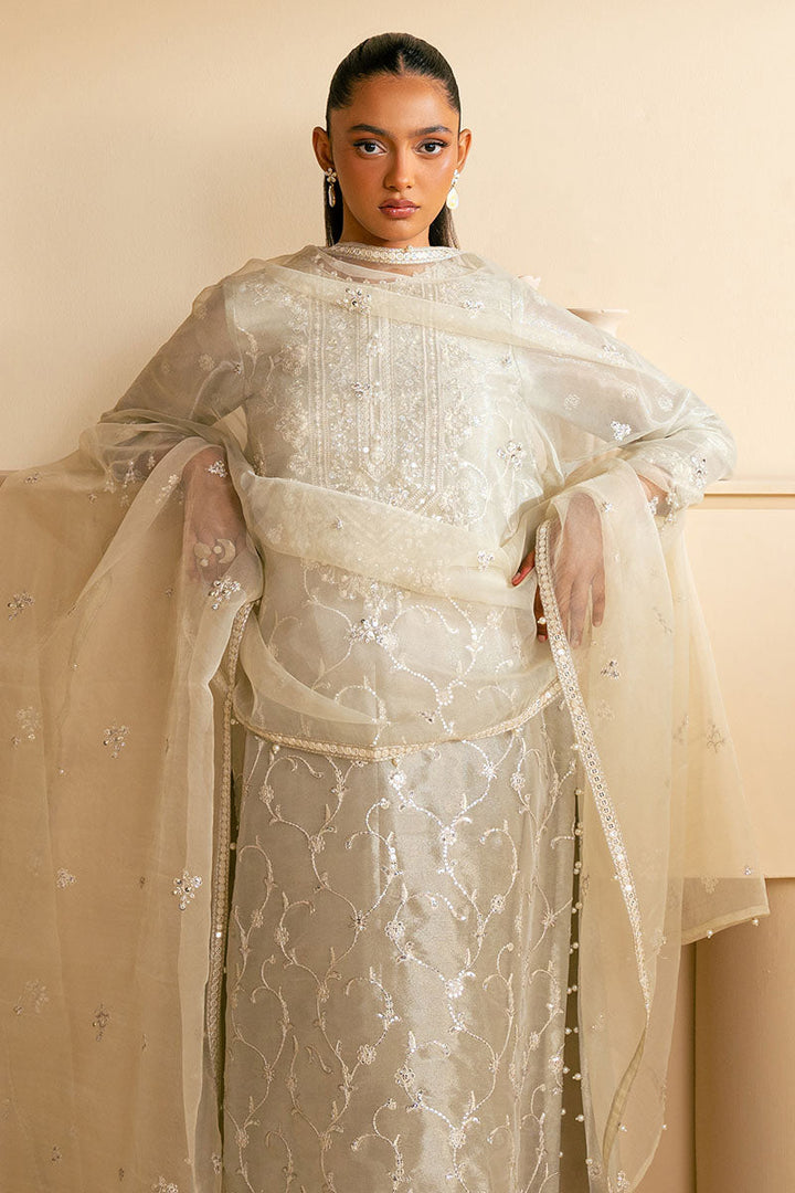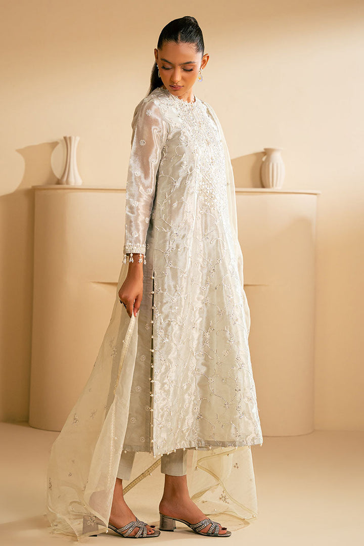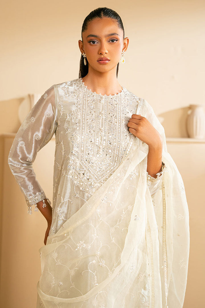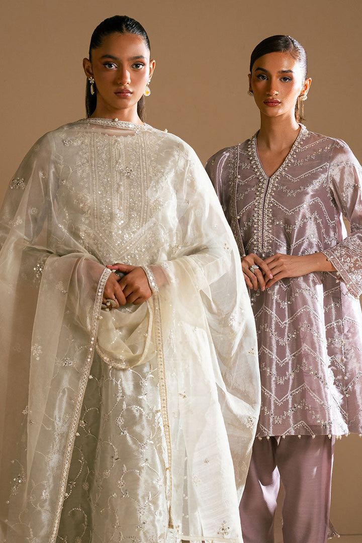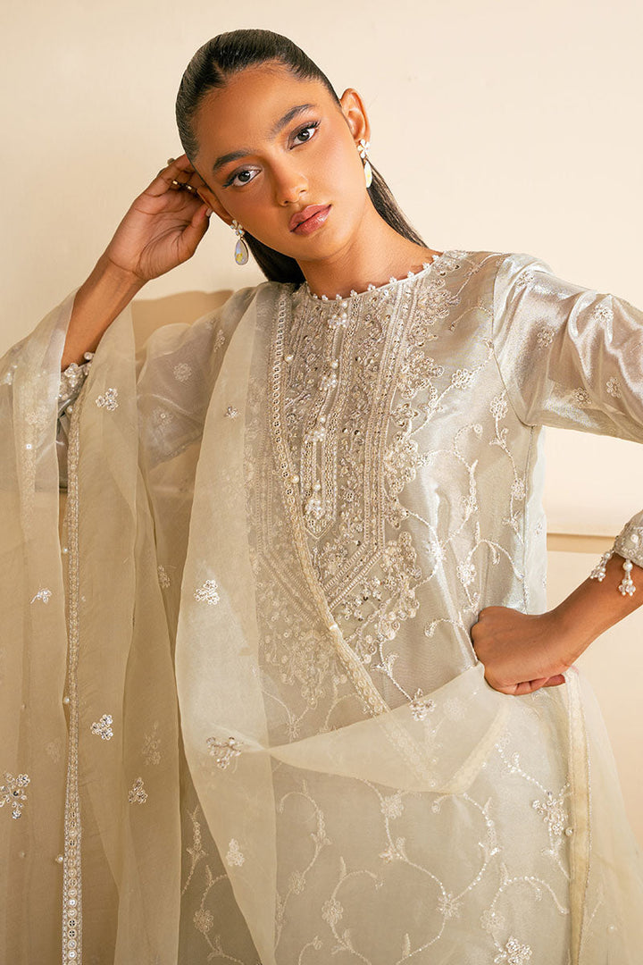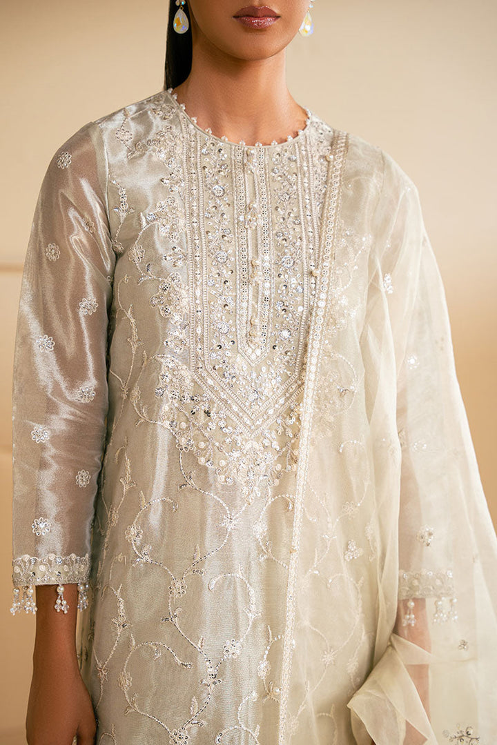The MYSTIC MINT-2PC set features a stylish and elegant straight tissue shirt with sequin embroidery and hand embellished details on the front, back, and neckline. The sleeves also showcase intricate sequin embroidery with hand embellished details. The organza dupatta is beautifully embellished with sequins and adds a touch of glam to the overall look.