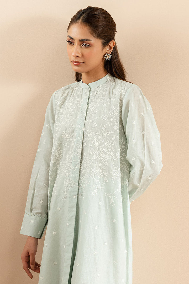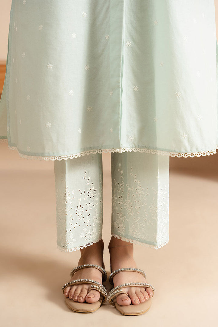 The MYSTIC TIDE-2 PC (SHIRT & TROUSER) offers a long open shirt design with double placket, made of lawn fabric. It features an embroidered and lace detail hem, while the back is dyed with a yoke and pleat design, also including lace detail. The neckline features a standing band collar and the sleeves are embroidered with a cuff and tasseling detail. The trousers are dyed and feature an embroidered box design.