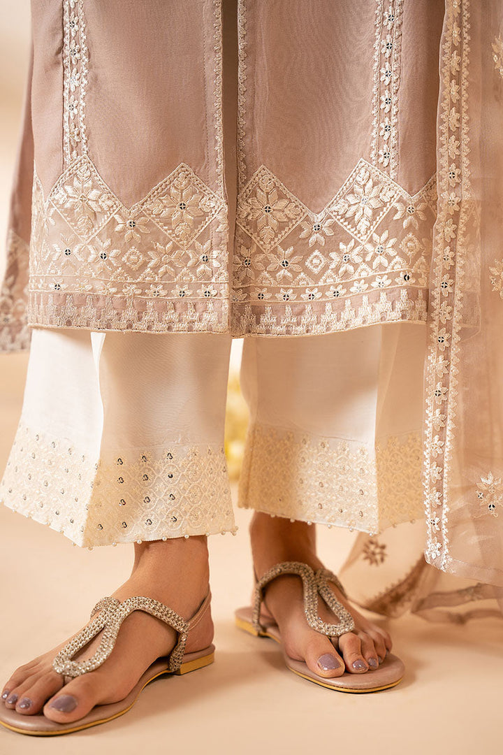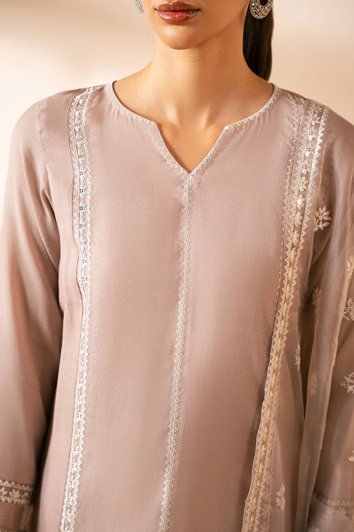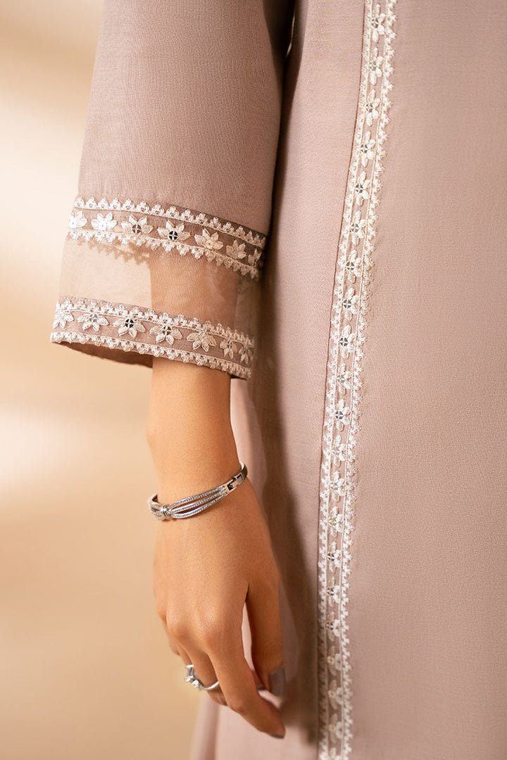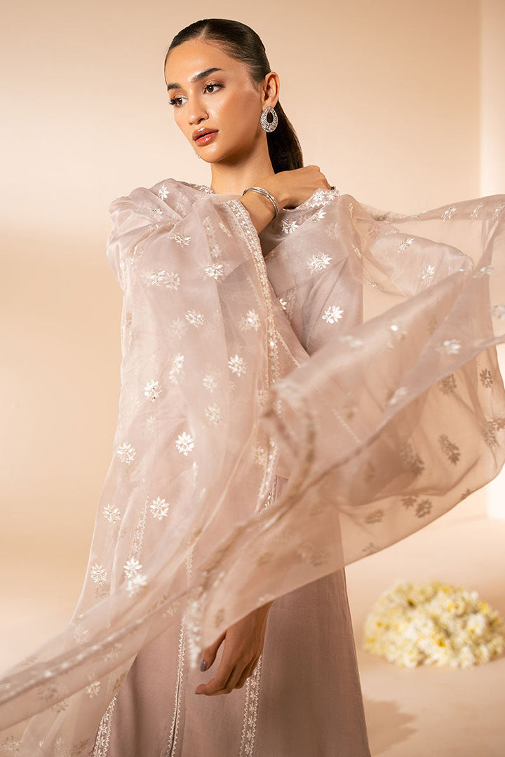 This ORCHID DUST-2PC set features a stylish A-line shirt with a front opening and embroidered panel and hem. The crew neck and straight sleeves also showcase elegant embroidery. The poly organza embroidered dupatta completes the look with a touch of sophistication. Enhance your wardrobe with this fancy yarn ensemble.