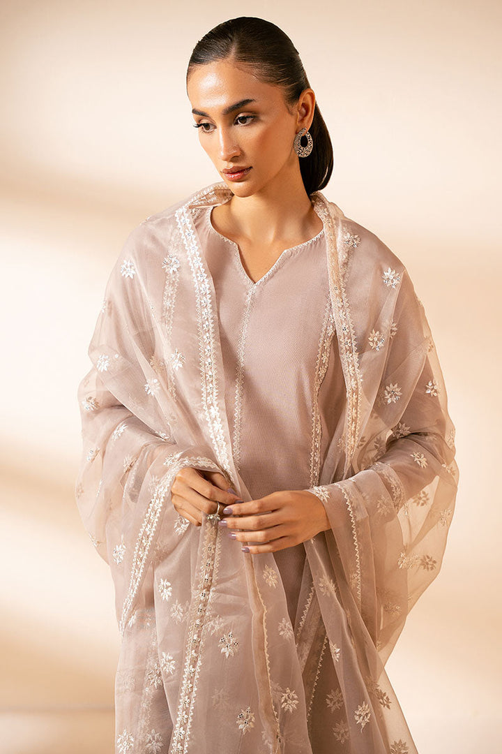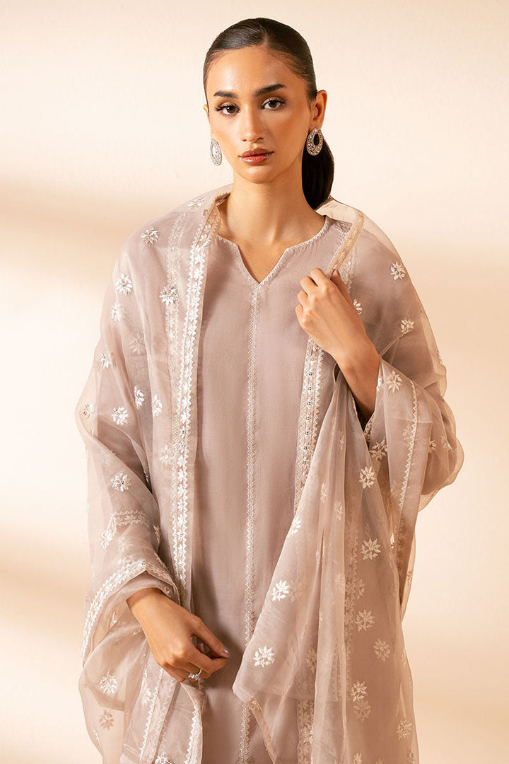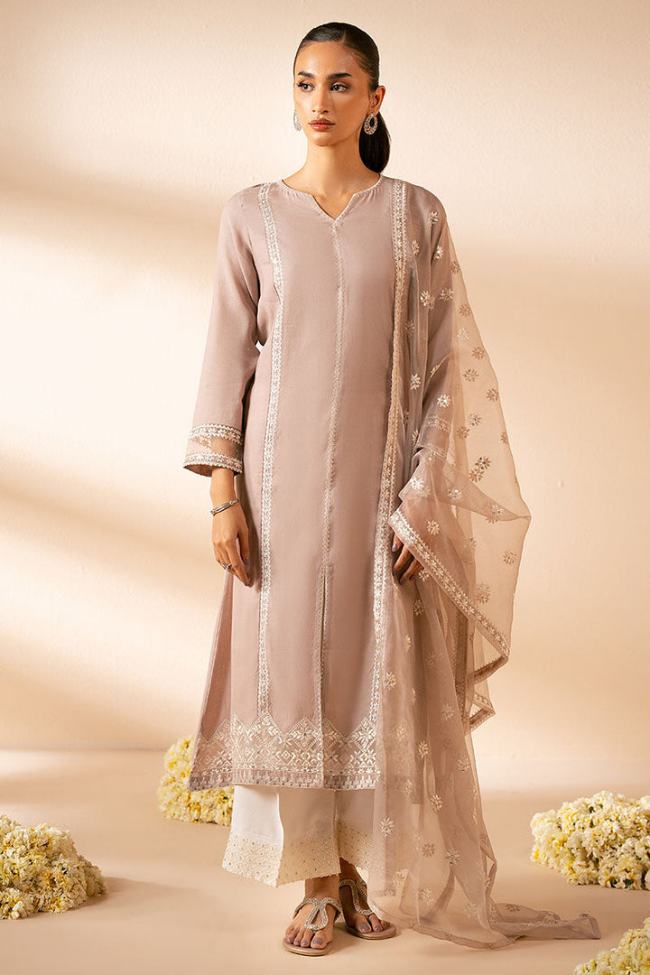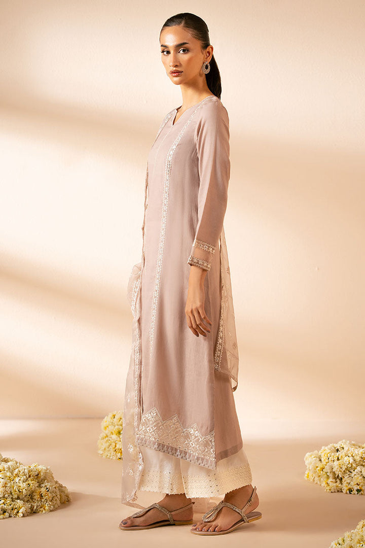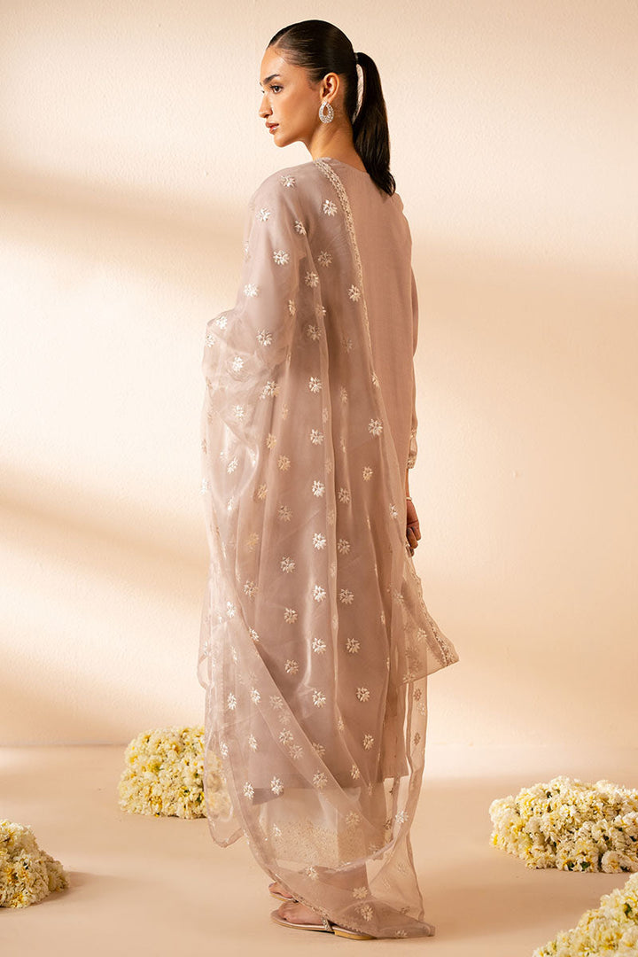 This ORCHID DUST-2PC set features a stylish A-line shirt with a front opening and embroidered panel and hem. The crew neck and straight sleeves also showcase elegant embroidery. The poly organza embroidered dupatta completes the look with a touch of sophistication. Enhance your wardrobe with this fancy yarn ensemble.