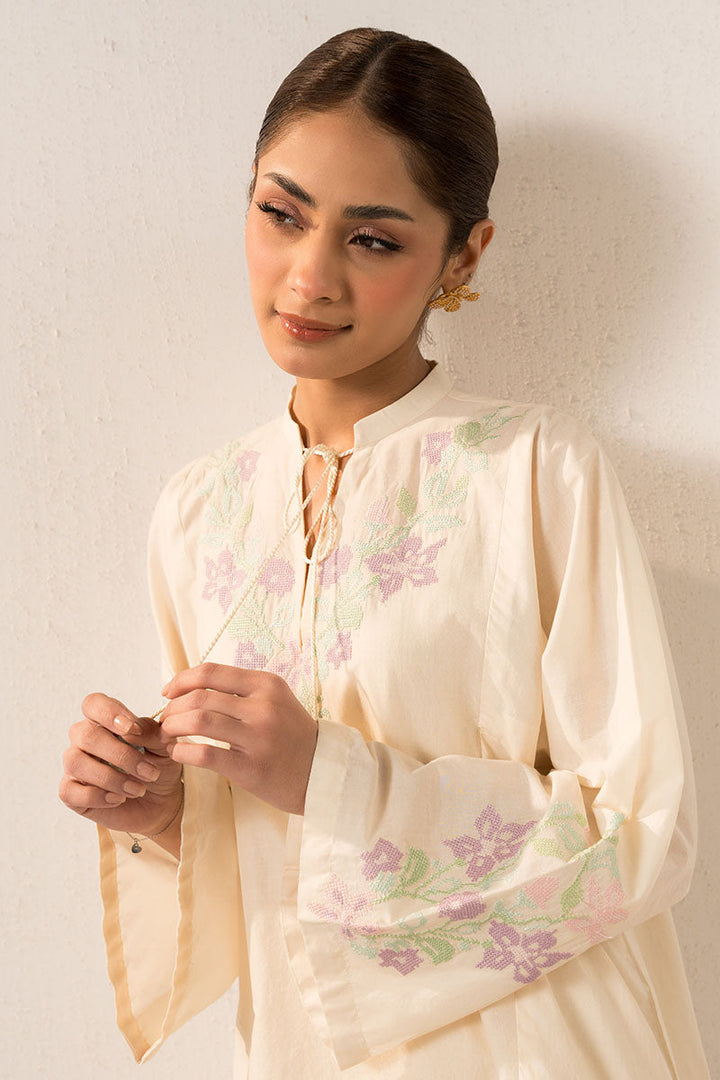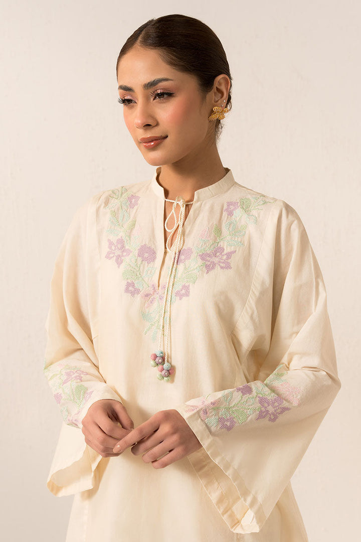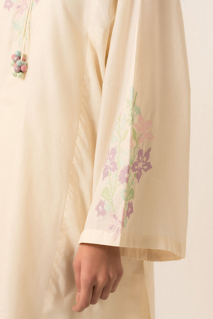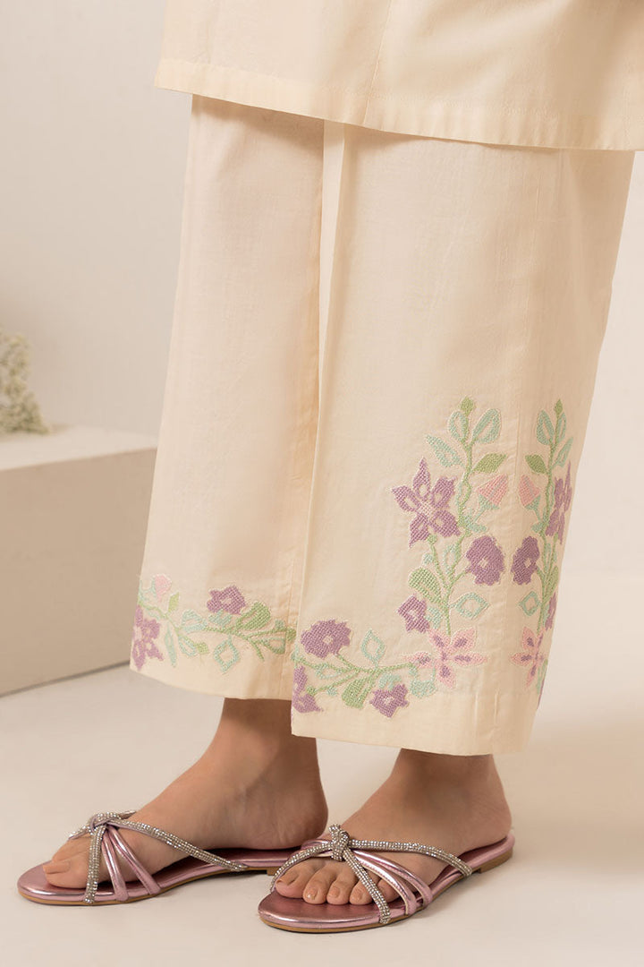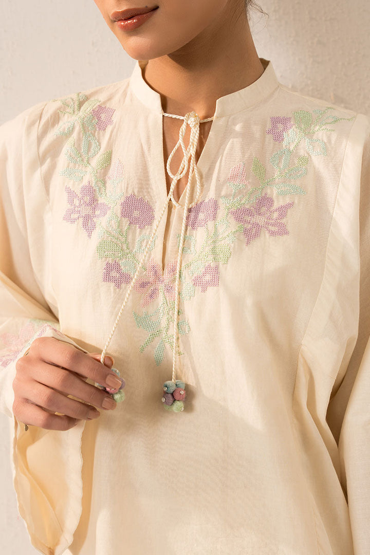 - The PEARLED IVORYY-2PC (SHIRT & TROUSER) is an elegant and versatile garment set. The shirt features a flattering boxy fit with a half band neckline, detailed with V embroidery and tassel. The box sleeves are adorned with delicate embroidery motifs. The trouser is crafted from cambric fabric with intricate embroidery on the hem, creating a stylish culotte silhouette. Perfect for any occasion.