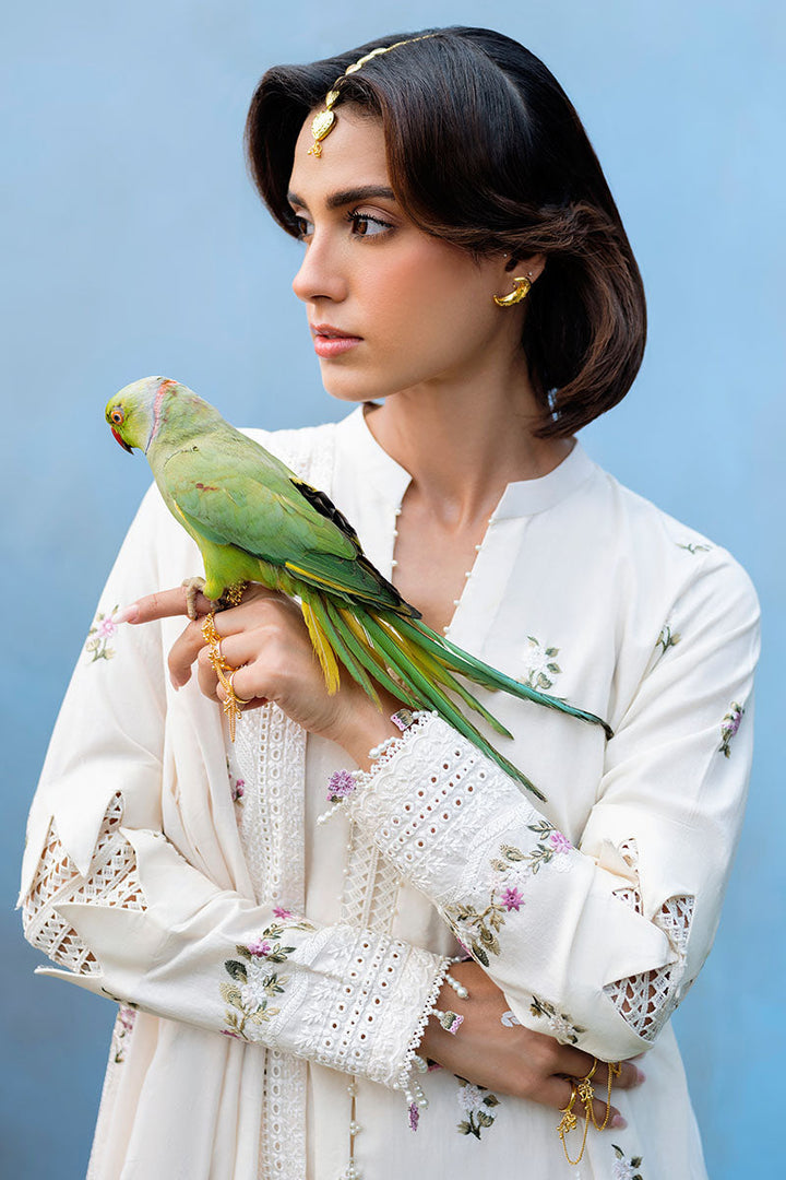 This elegant three-piece set features a lawn shirt with intricate embroidery on the front and sleeves, paired with a dyed cambric trouser for comfort and style. The accompanying lawn dupatta is also beautifully embroidered, completing a refined and cohesive look perfect for sophisticated occasions.