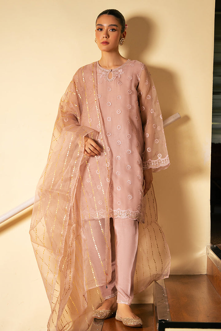 - ROSE GLEAM-3 PC set is a perfect fusion of elegance and style. The straight shirt is made of luxurious organza with intricate embroidery on the front and back, and a delicate round neck with button and keyhole detail. The tapered shalwar adds a touch of chic, while the organza foil printed dupatta completes the look with a hint of glamour.