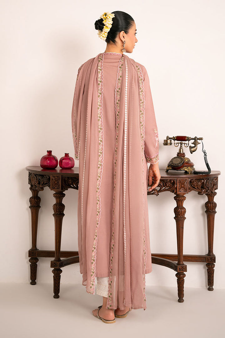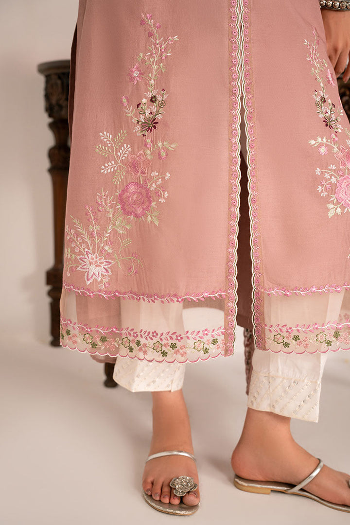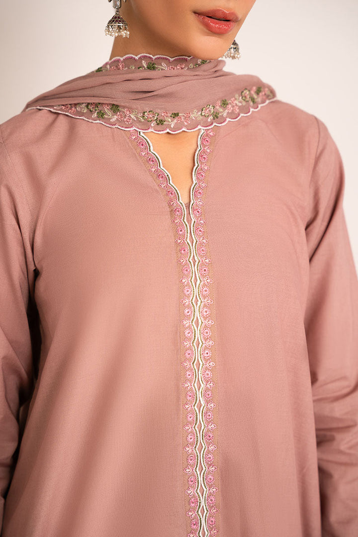 - Expertly crafted ROSEATE GARDEN 2PC ensemble featuring a straight front open shirt with intricate embroidery on the front contrasting with a plain dyed back. The neckline showcases sophisticated wrap-around embroidered detailing, while straight sleeves are adorned with embroidered borders and motifs. Complemented by a luxurious chiffon dupatta with elegant embroidery, creating a refined, coordinated look.