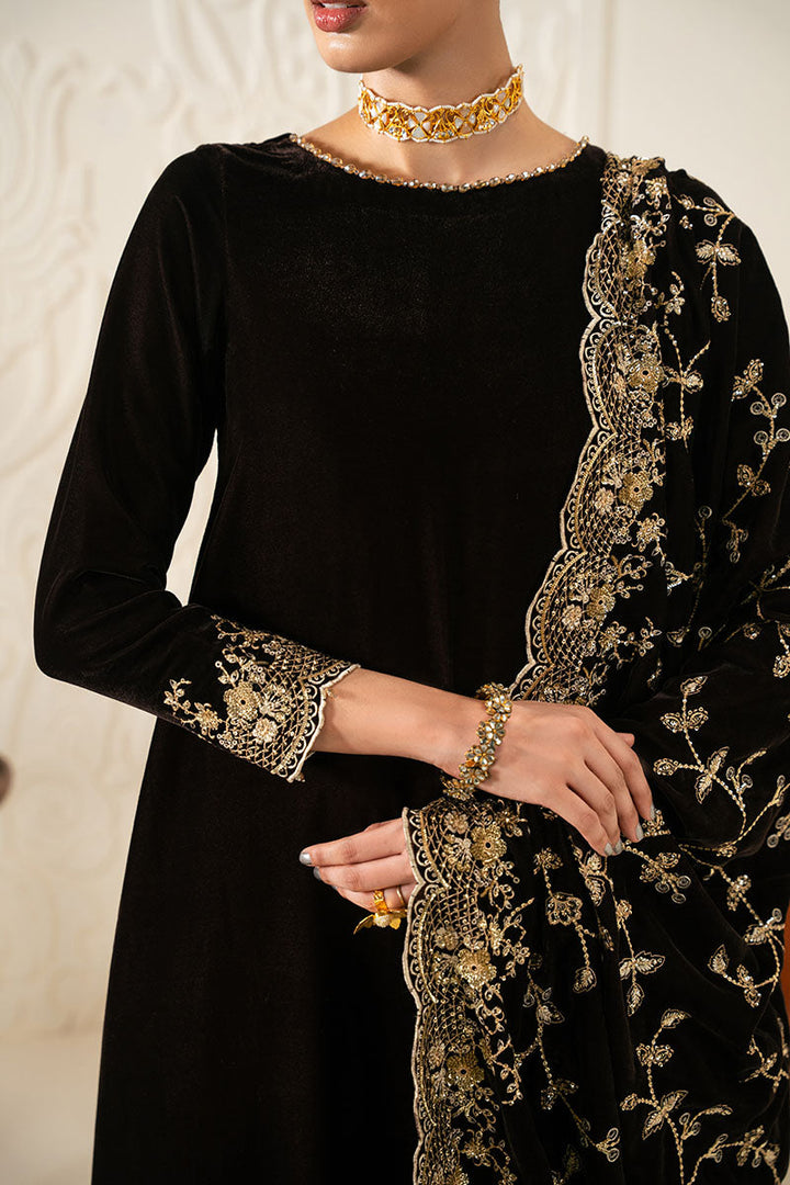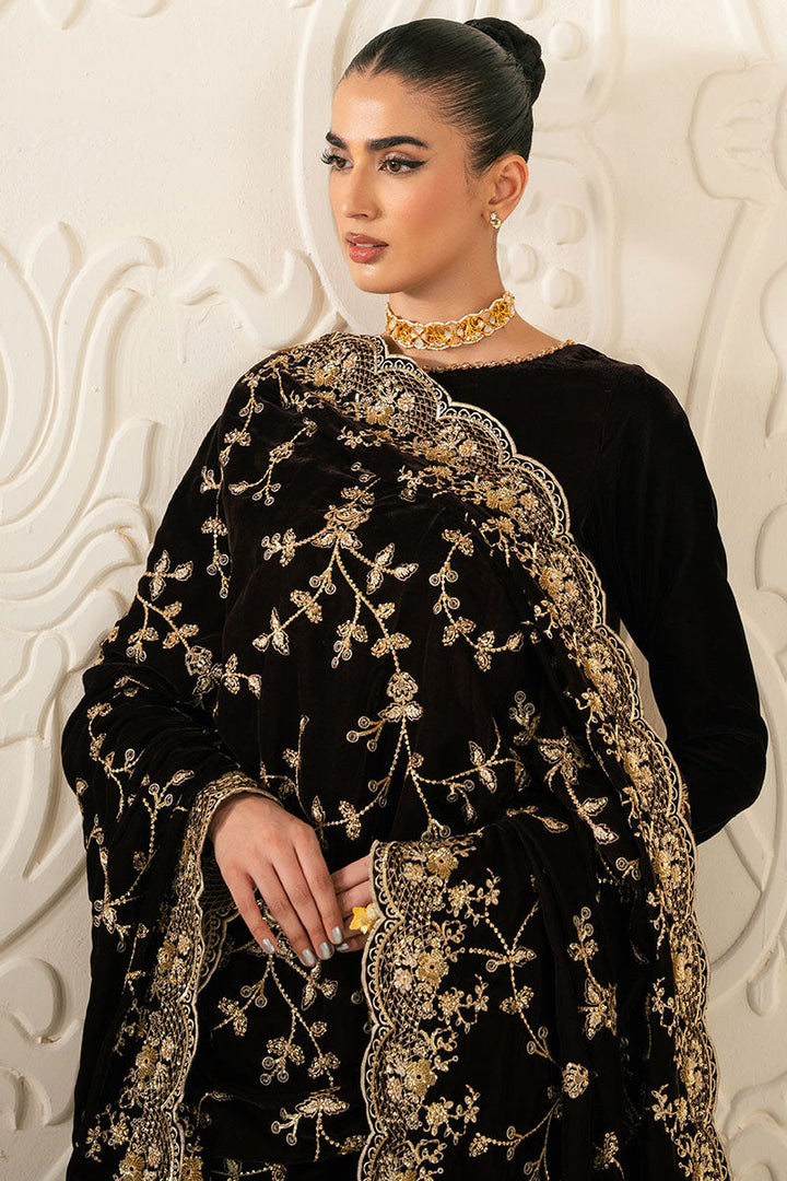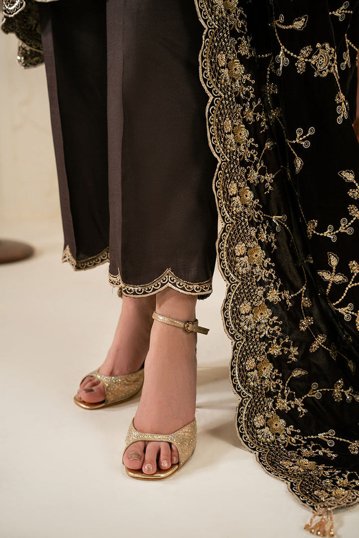 This Rustic Radiance 3-piece velvet embroidered pret features a flared shirt with detailed embroidery on the hem and adda work around the crew neck, creating a refined silhouette. Fitted sleeves with tasseling add a subtle touch of elegance. The silk box pants are both comfortable and stylish, dyed with embroidery to complement the shirt. A matching velvet dupatta with delicate tasseling completes the ensemble, offering a sophisticated blend of texture and craftsmanship ideal for formal occasions.