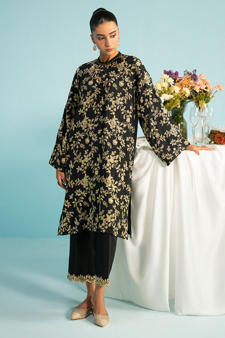 - Expertly crafted SABLE GLEAM 2PC ensemble featuring a loose-fit silk shirt with front dyed embroidery and back box pleat detailing. The sophisticated band collar is adorned with tasseling and loop buttons, while box-fit sleeves showcase intricate embroidery. Complemented by silk dyed and embroidered box pants for a refined, coordinated look.