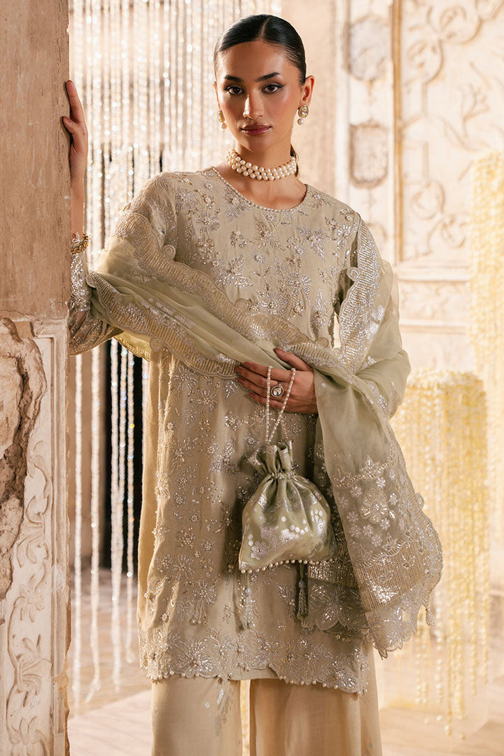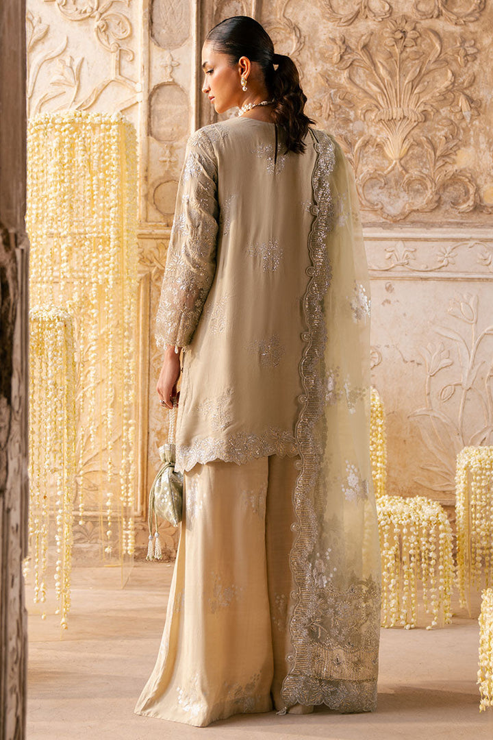 This Silver Mist 3PC Silk Embroidered Pret features a straight short silk shirt with intricate adda embroidery, taseling details, and a stylish back slit. The crew neck and regular sleeves are embellished with delicate taseling, enhancing its elegant design. Complemented by silk palazzo trousers dyed and foil printed for a modern touch. The ensemble is completed with a lightweight organza dupatta, adorned with foil-print embroidery and tassels, adding graceful movement and sophistication to your look. Perfect for those seeking refined texture and artisanal craftsmanship.
