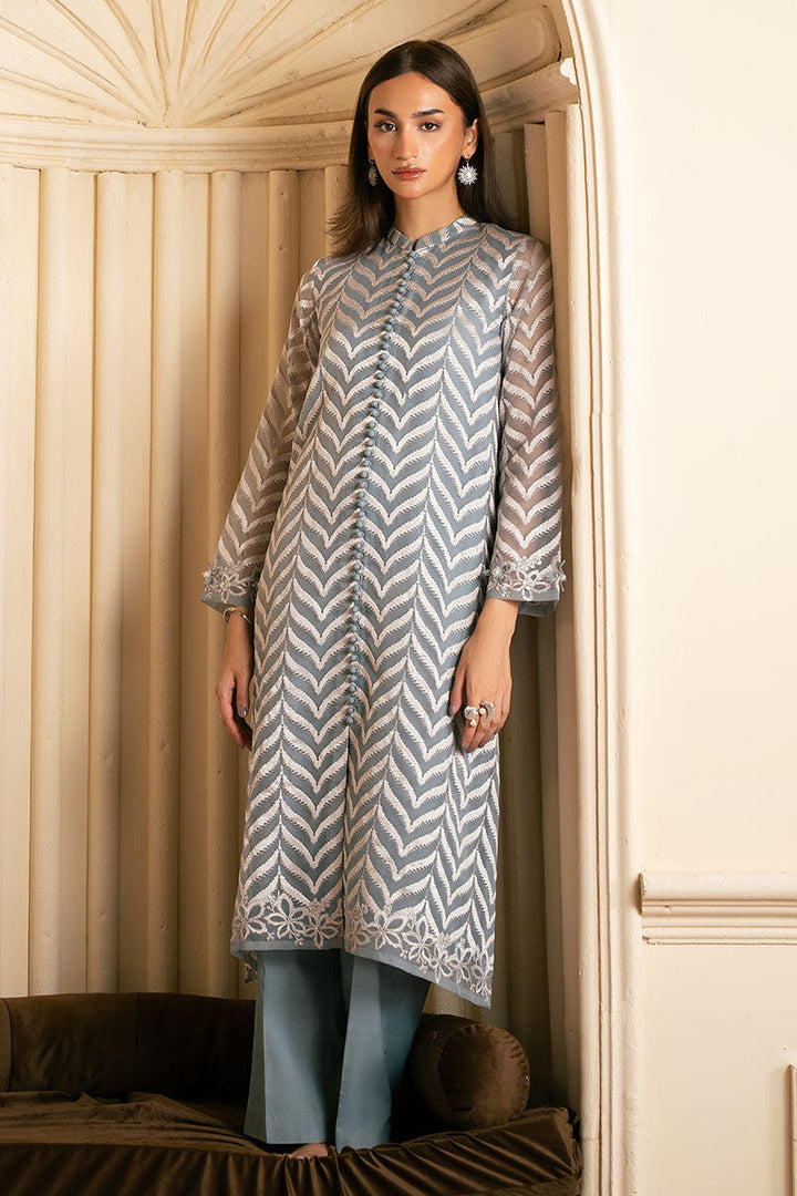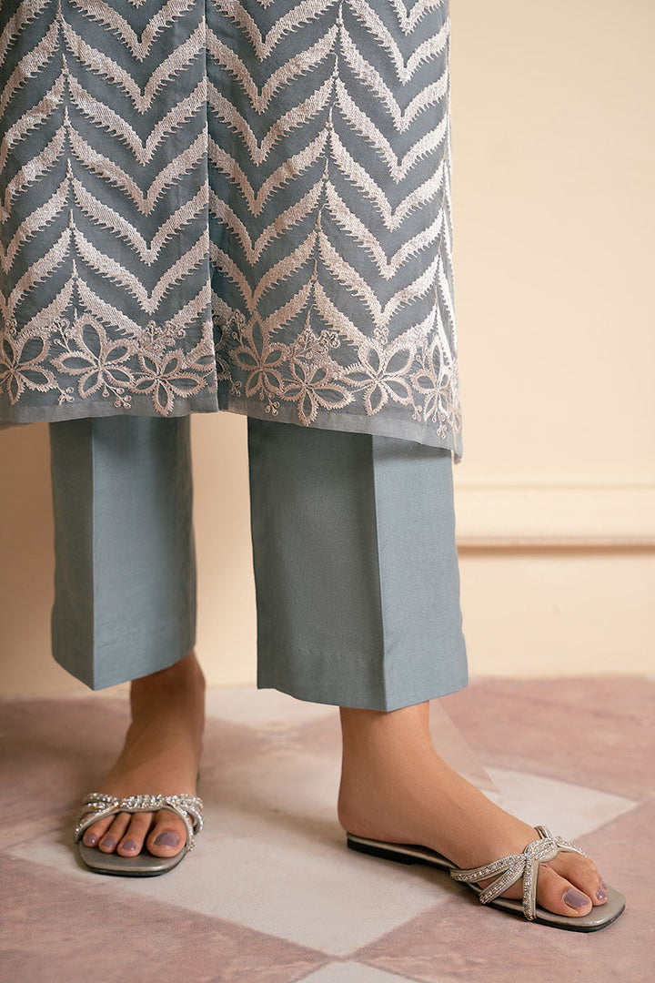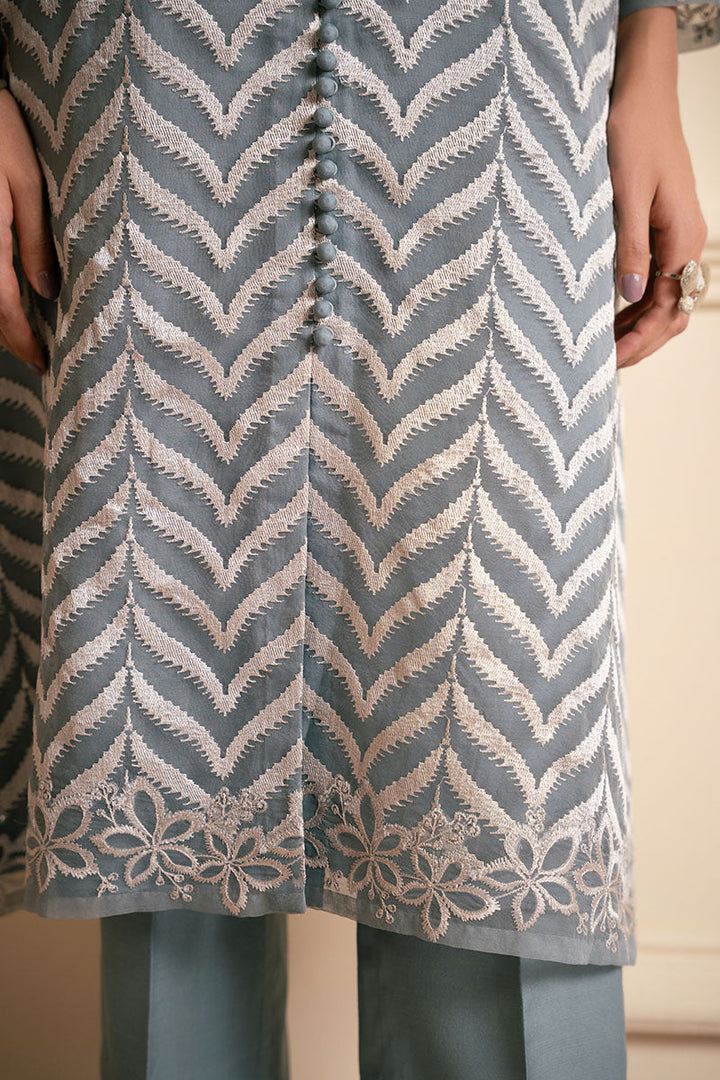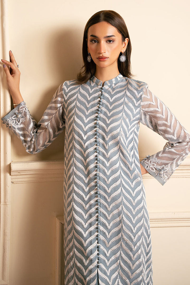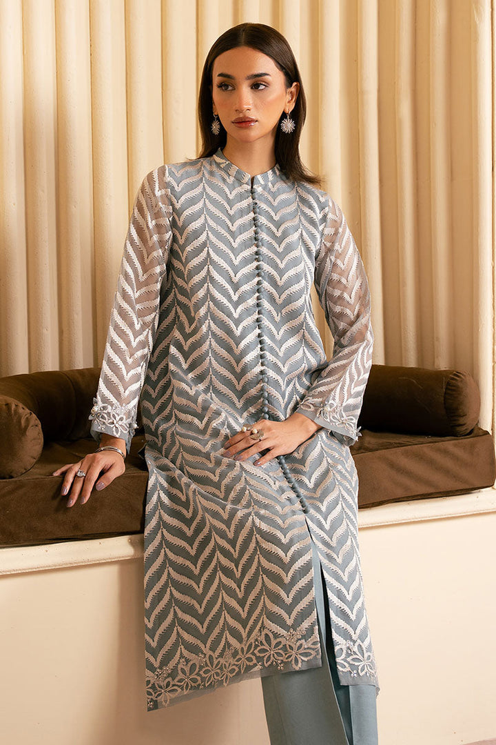The SHIRT boasts a straight front open design in organza, with intricate embroidery on the front and back. The neckline features a band neck with a loop button opening at the center, while the sleeves are adorned with elegant 3D embroidery on the border. The accompanying TROUSER is crafted from smooth silk, in a plain dyed style with box pants that exude sophistication.