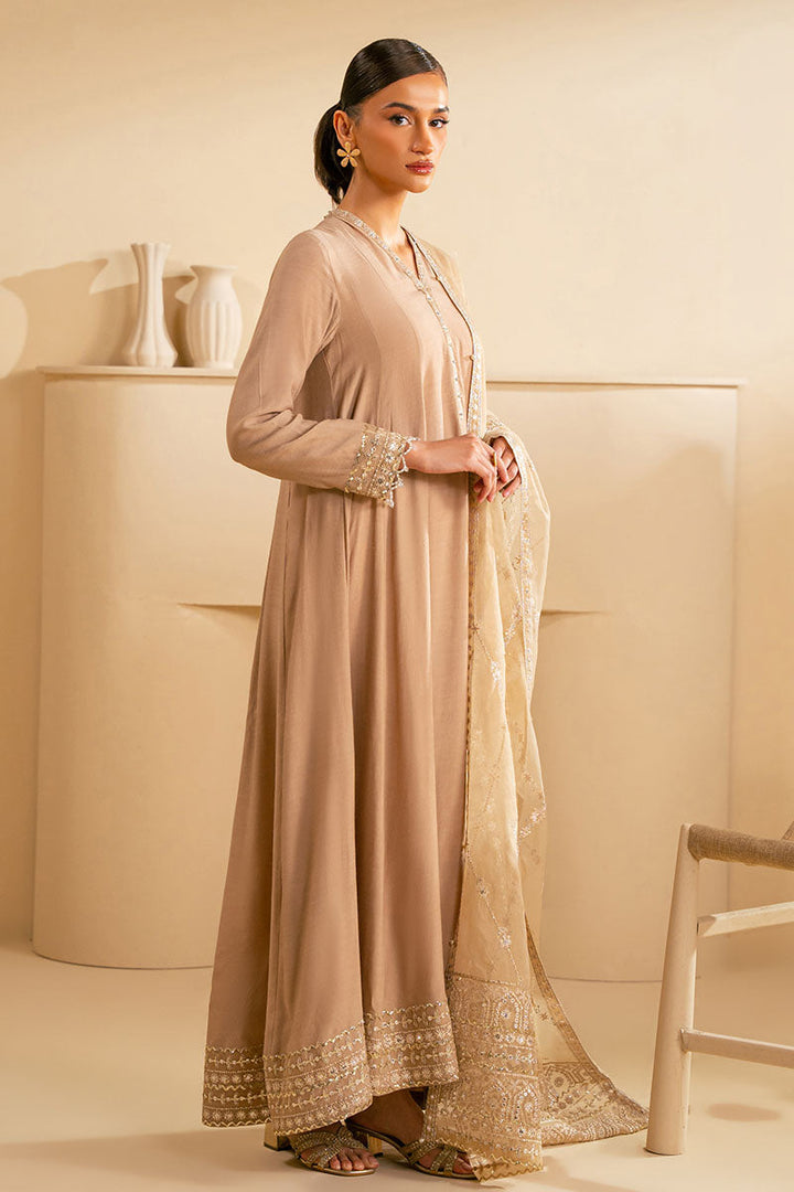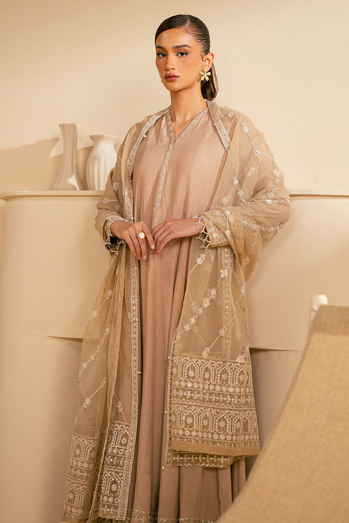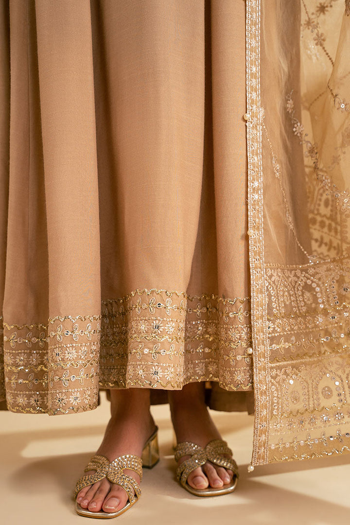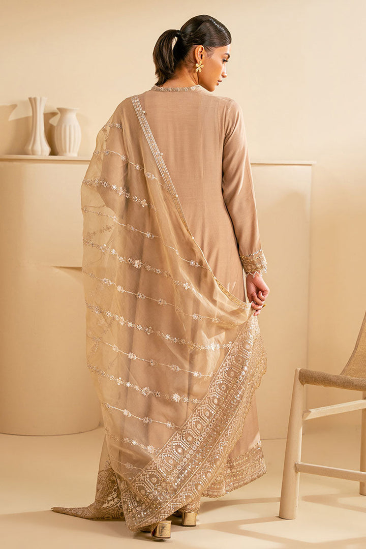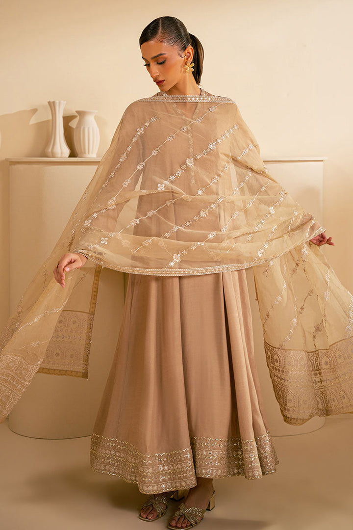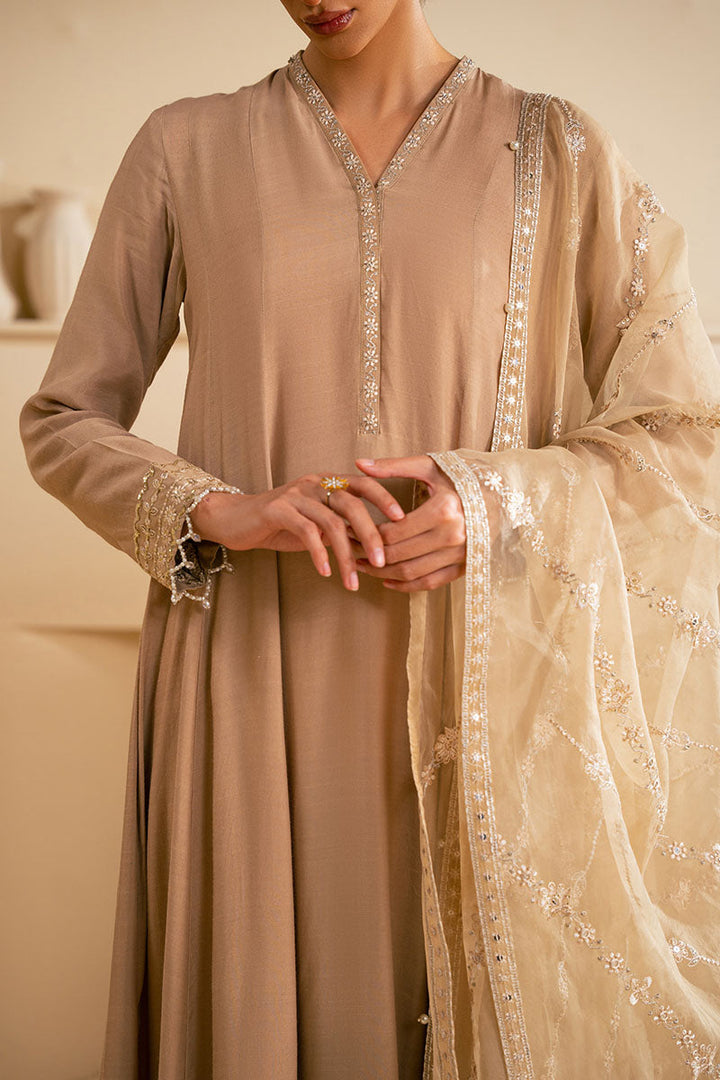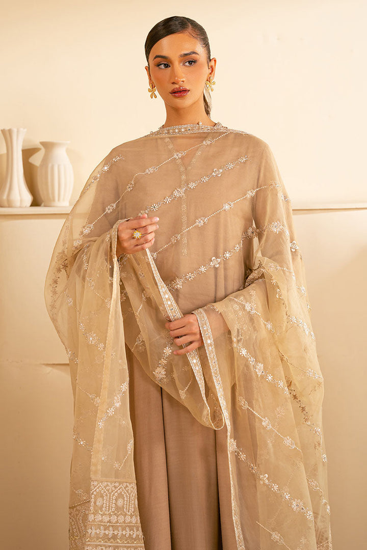 Introducing our Soft Beige Shirt, the perfect blend of style and elegance. The panelled pishwas crafted from luxurious silk is adorned with delicate sequin embroidered borders, while the neckline features hand embellishments. The dyed sleeves and poly organza dupatta with sequin embroidered borders add a touch of opulence.