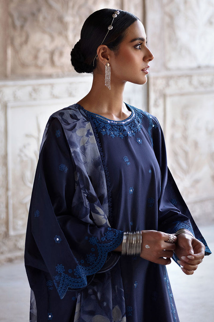 - This elegant three-piece set features a lawn shirt adorned with intricate embroidery on the front, back, sleeves, and neckline, complemented by an embroidered patti for added detail. The cambric trouser is dyed and decorated with embroidered patches, enhancing its refined look. Completing the ensemble is a chiffon dupatta with a delicate printed design, offering a perfect balance of comfort and style for sophisticated occasions.