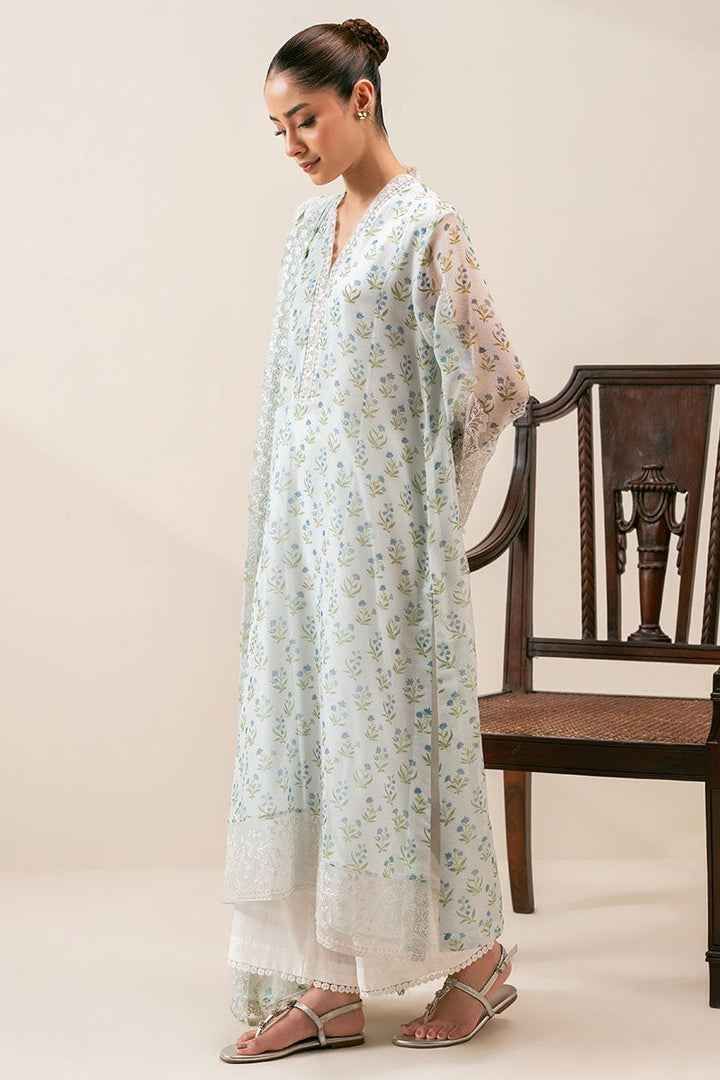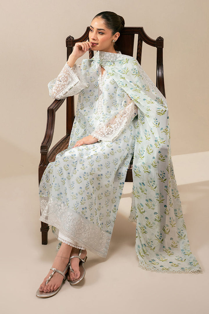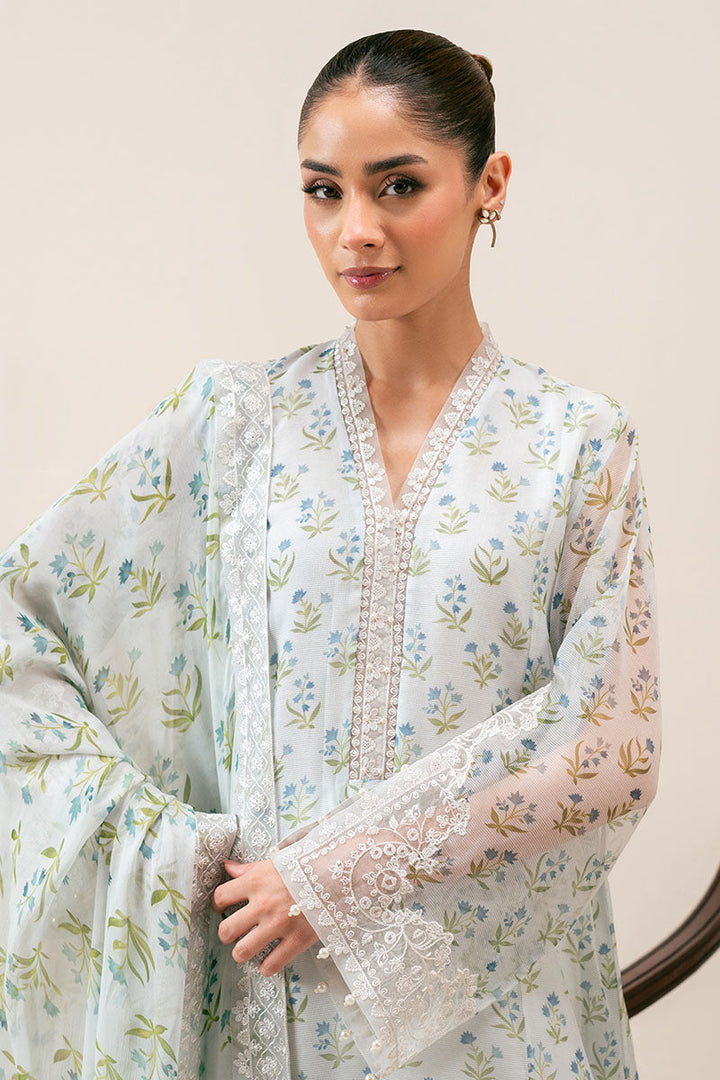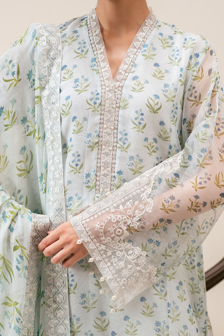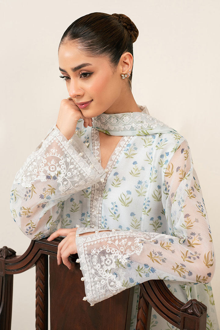 - This elegant two-piece ensemble features a cotton net paneled shirt with a beautifully printed front and back, enhanced by intricate embroidery on the neckline, hem, and wrap-around neck detail. The sleeves combine printed fabric with refined embroidered cutwork, adding texture and sophistication. Complementing the shirt is a chiffon dupatta, richly printed and embroidered, finished with delicate lace patches for a graceful touch. Ideal for formal occasions, this set blends traditional craftsmanship with modern design for a timeless appeal.