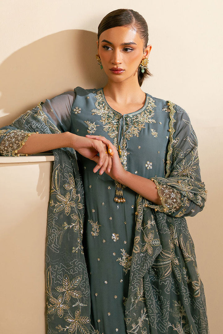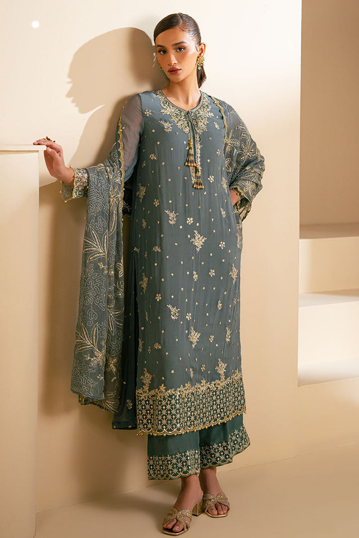 Introducing the TRIBAL MOSS-3PC set, featuring a straight style chiffon shirt with front and back sequin embroidery. Neckline is adorned with hand embellished tassel details, while the sleeves also feature sequin embroidery. Accompanied by matching silk culottes with sequin embroidery and a chiffon dupatta with delicate sequin accents. Elevate your wardrobe with this stunning ensemble.