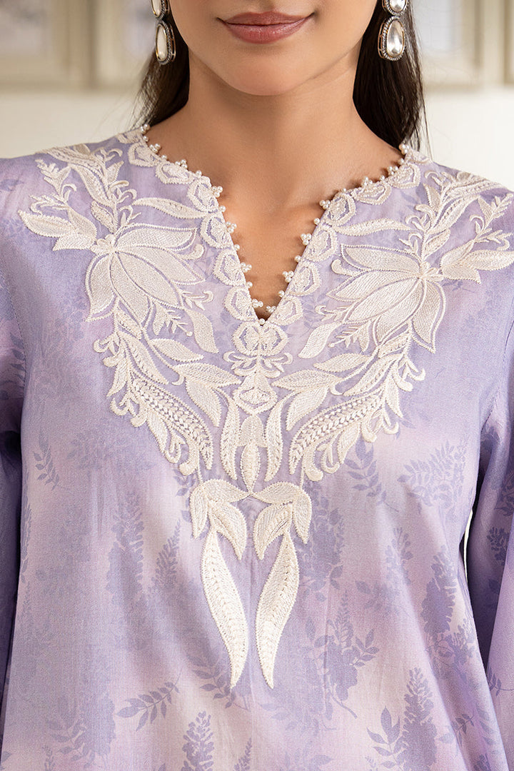 - This straight shirt is both stylish and comfortable. Made with lawn fabric, it features a unique front and back print. The neckline is embellished with an embroidered crew neck and v-slit, adorned with delicate pearls. The flared sleeves are detailed with embroidery and pearls as well.