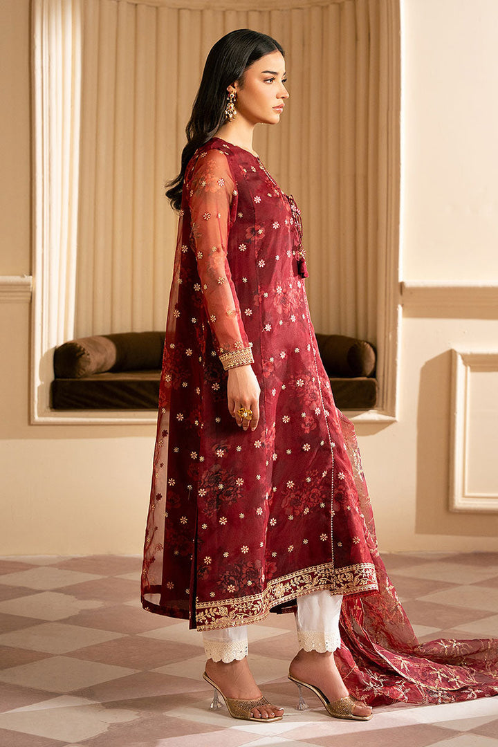 Expertly crafted, this long A-line pishwas (organza) shirt features a stylish printed design on the front and back. Adding to its sophisticated look is delicate lace detailing and tassel accents on the neckline. The fitted sleeves and embroidered organza dupatta complete the elegant ensemble.