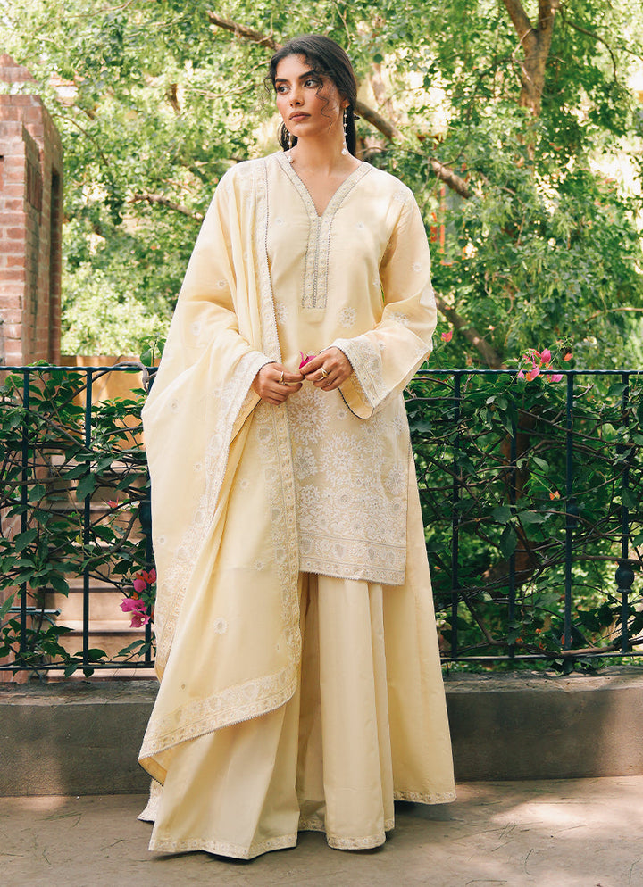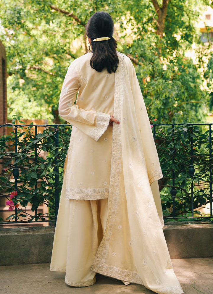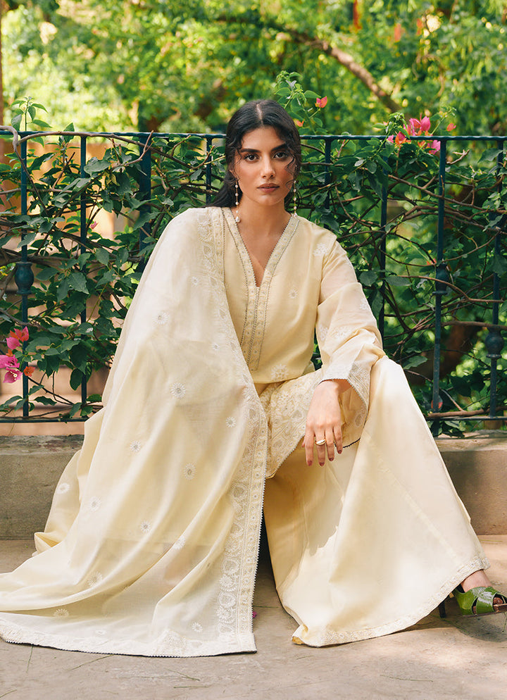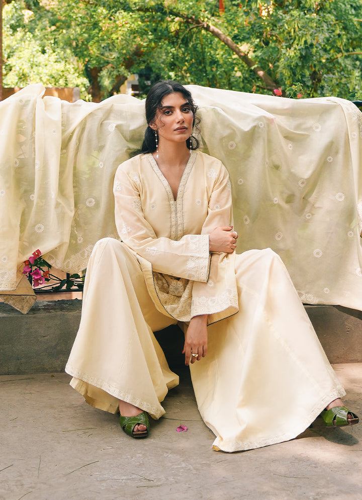 Ruhina in Kora from our Summerkari '25 Collection. An embroidered pure cotton voile 3-piece outfit paired with embroidered trousers & dupatta.