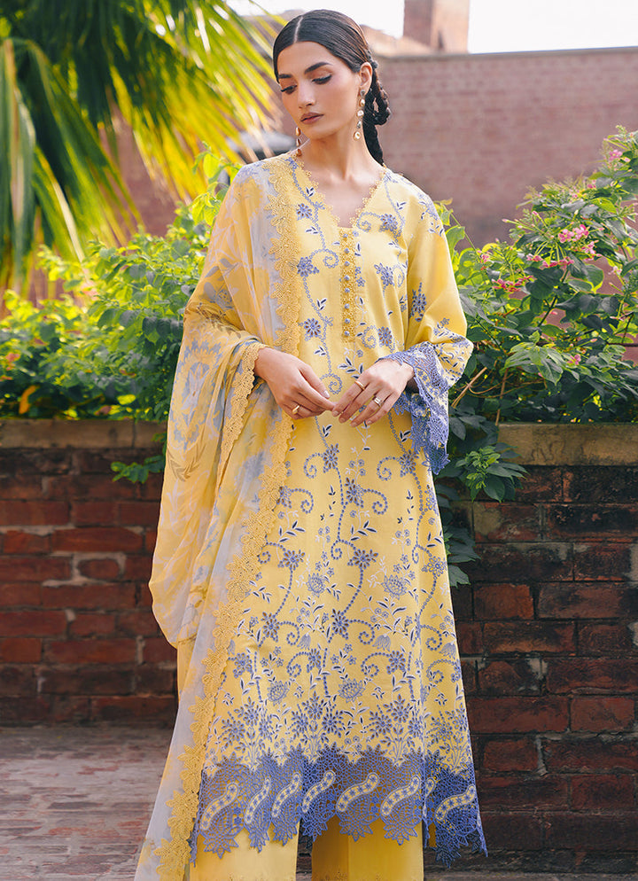 Sanae in Yellow from our Summerkari '25 Collection. An embroidered cotton lawn 3-piece outfit paired with cotton cambric trousers & digital printed chiffon dupatta.