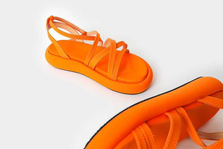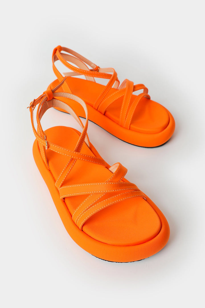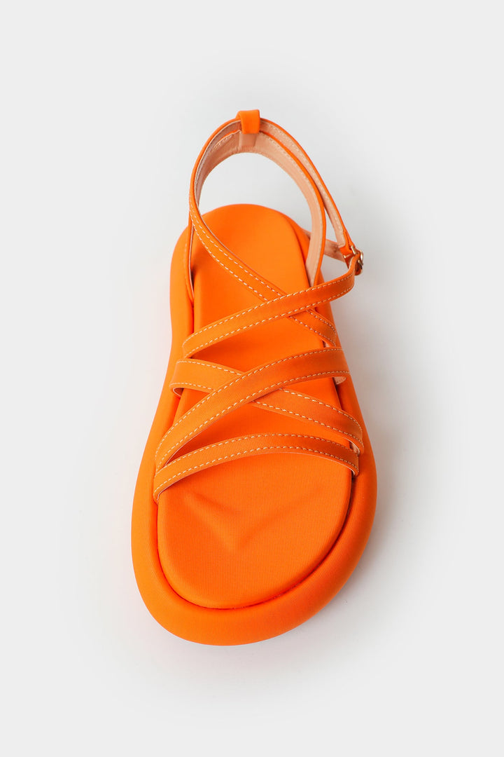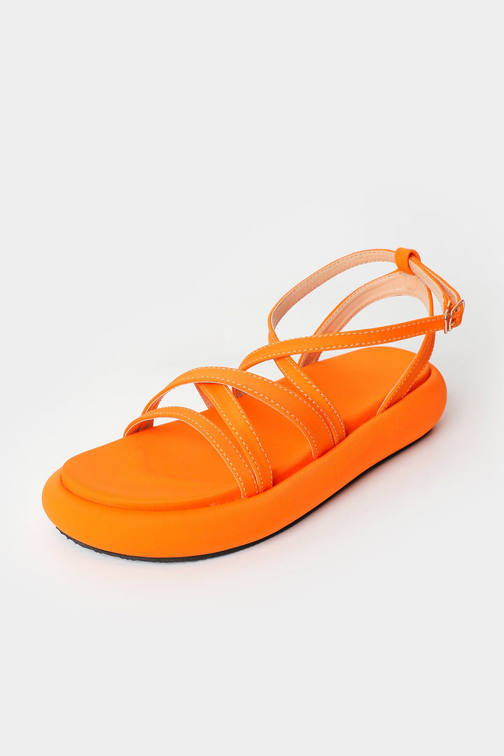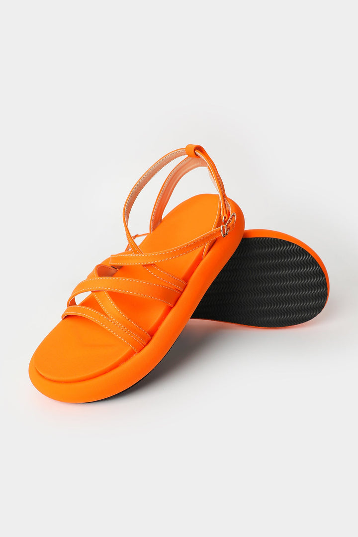 A chic and trendy design is layered over this gleaming orange shade sandal. Adorned with criss cross strap design, this exquisite sandal is a great option to style with trendy outfits.