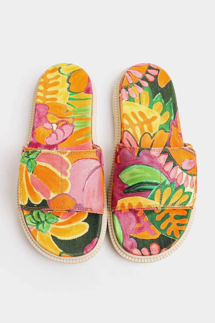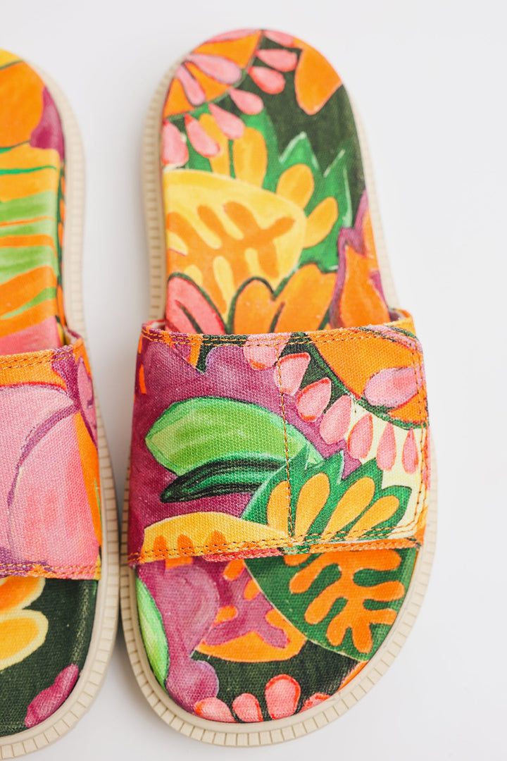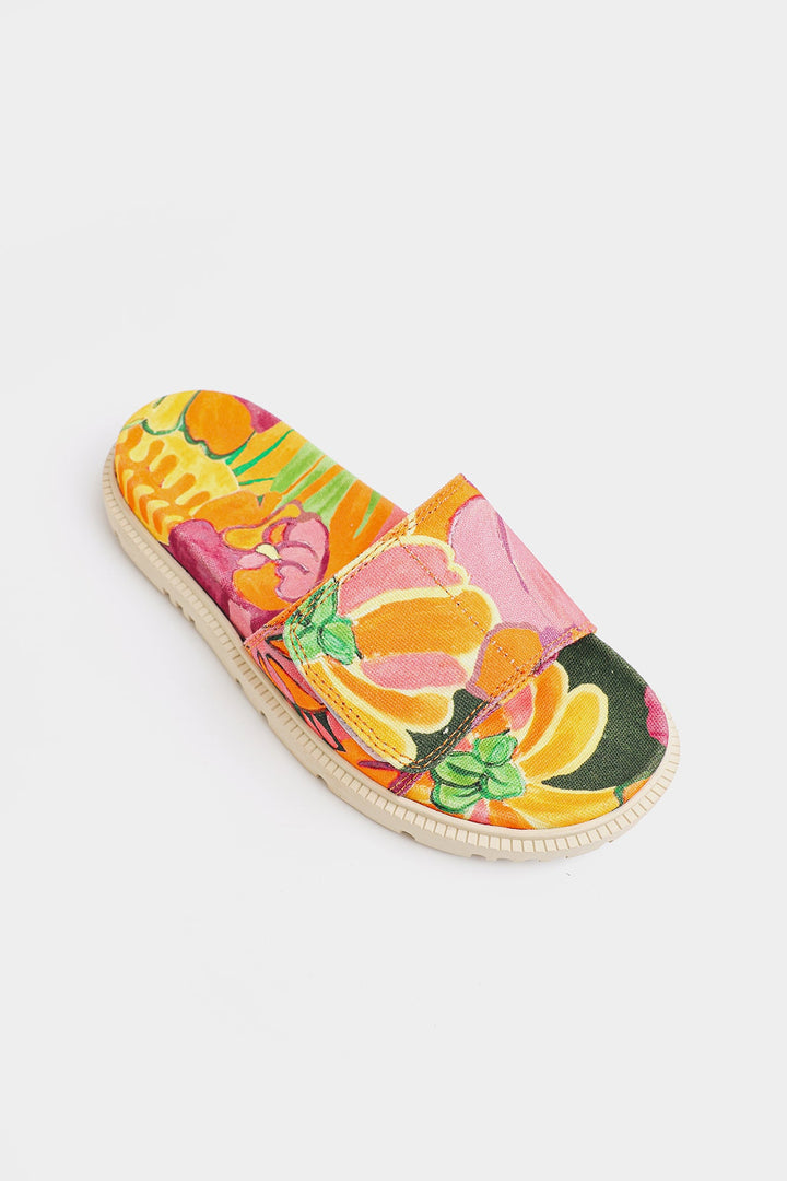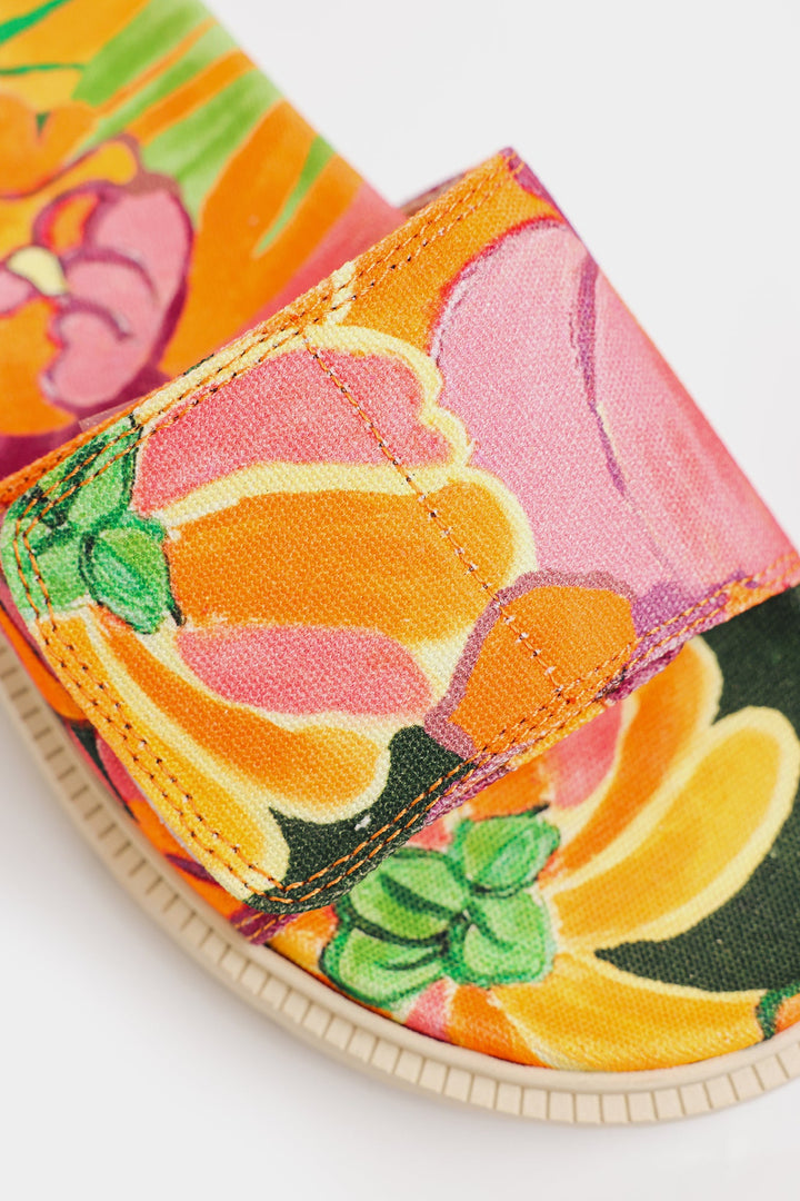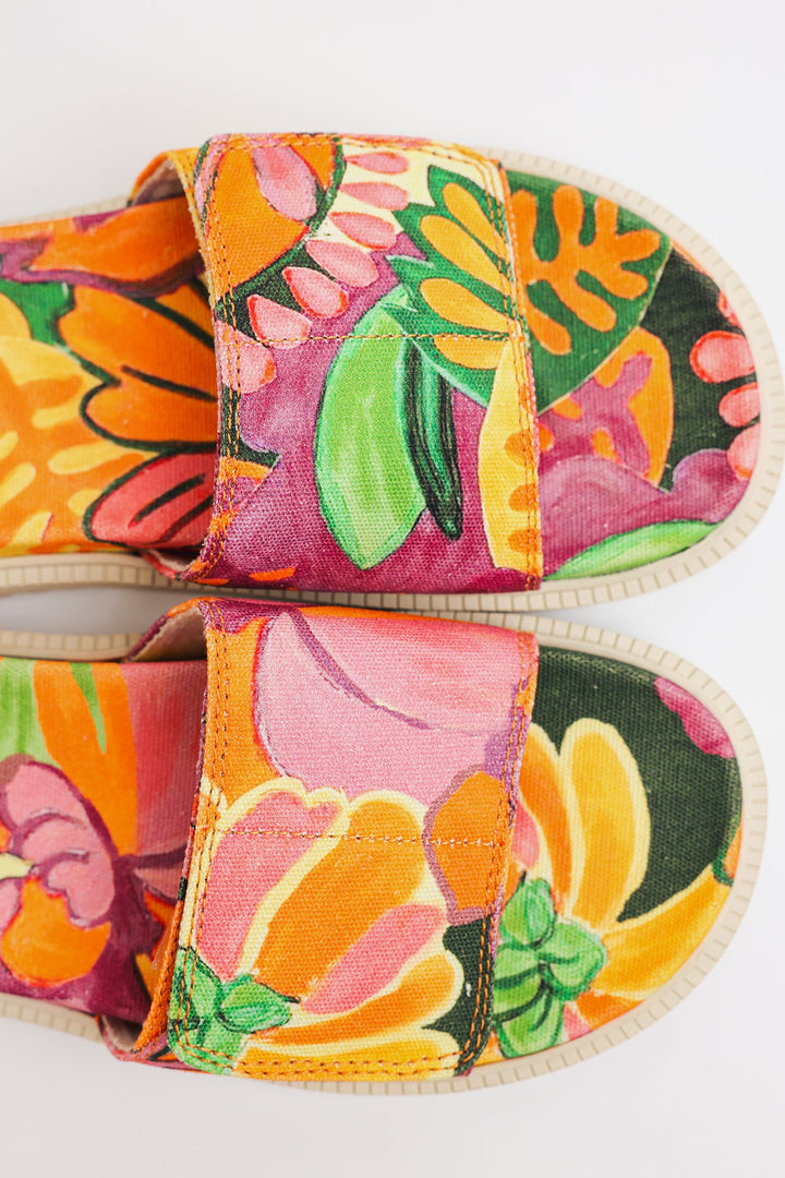A pair of colorful slide sandals with a bold floral print. The pattern includes bright shades of orange, pink, yellow, and green, featuring large abstract flowers and leaves. The sandals have a thick, cushioned sole and a single wide strap across the top. The style suggests a casual, summery look, perfect for warm weather.