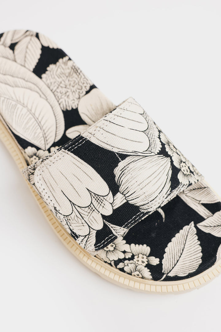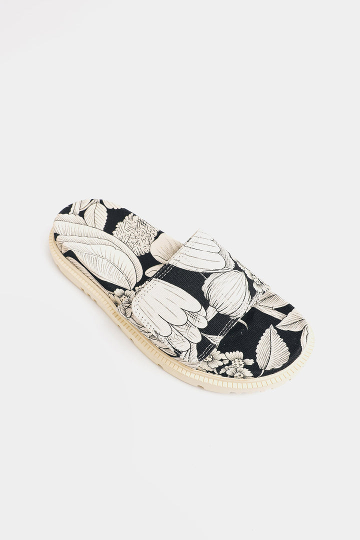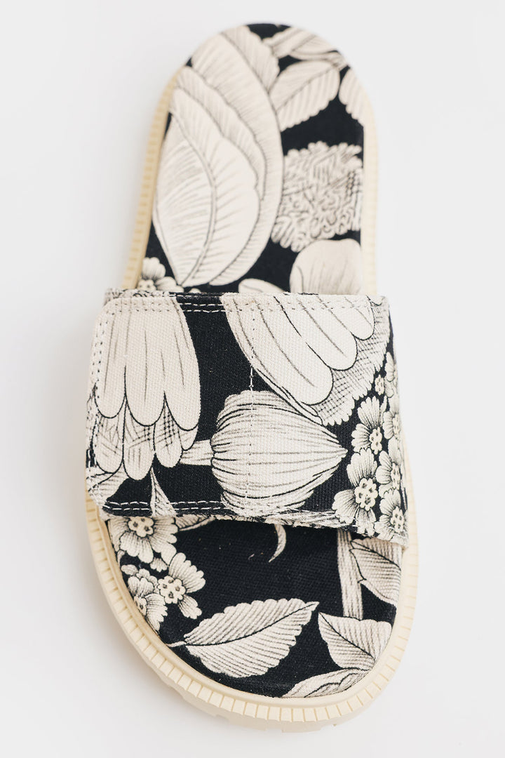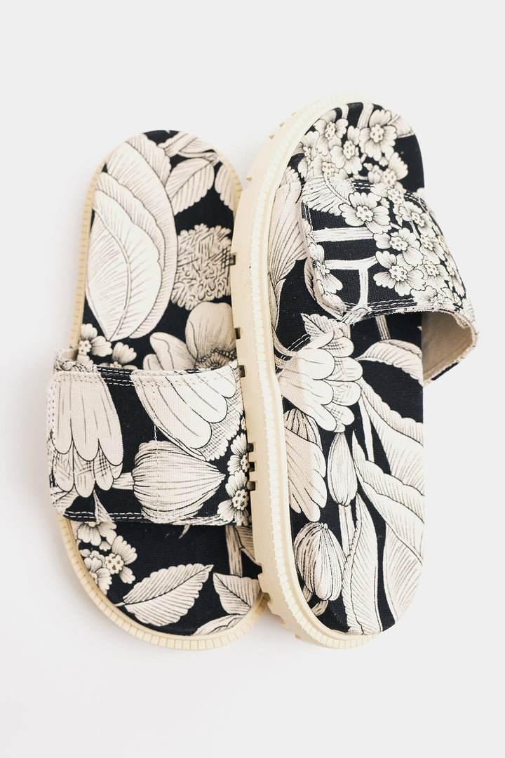 A pair of colorful slide sandals with a classy floral print. The pattern includes monochromatic shades of white and black, featuring large abstract flowers and leaves. The sandals have a thick, cushioned sole and a single wide strap across the top. The style suggests a casual, summery look, perfect for warm weather.