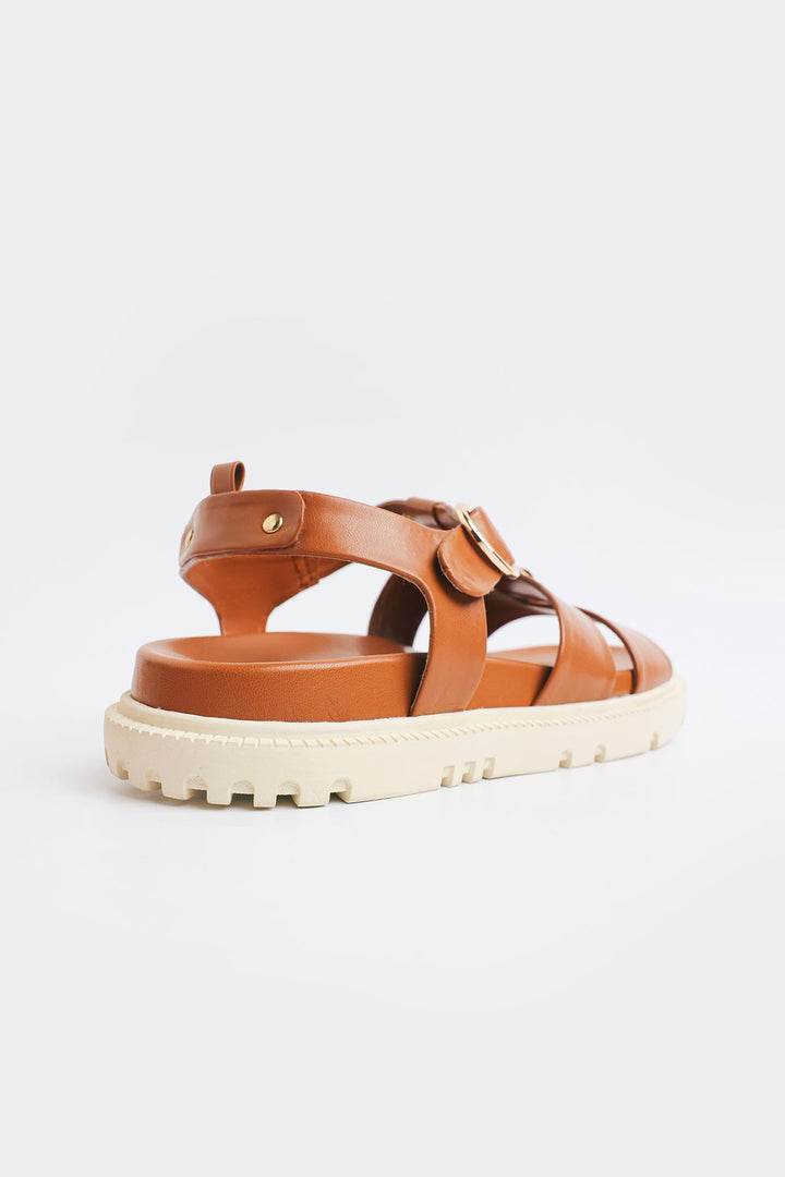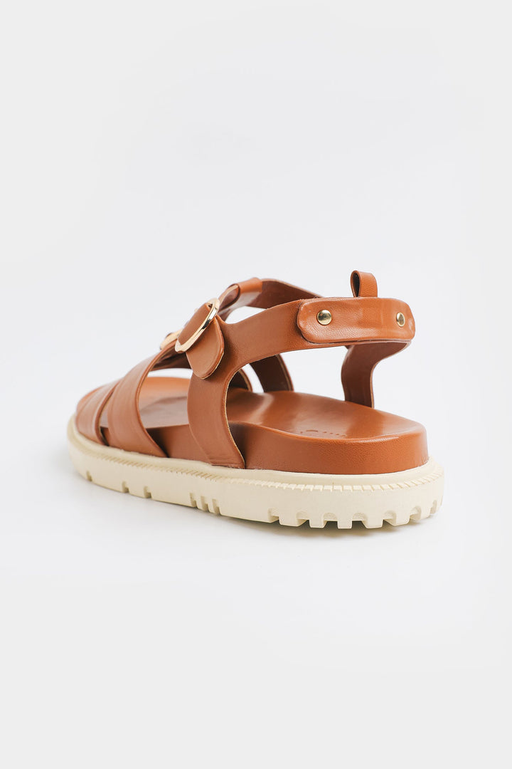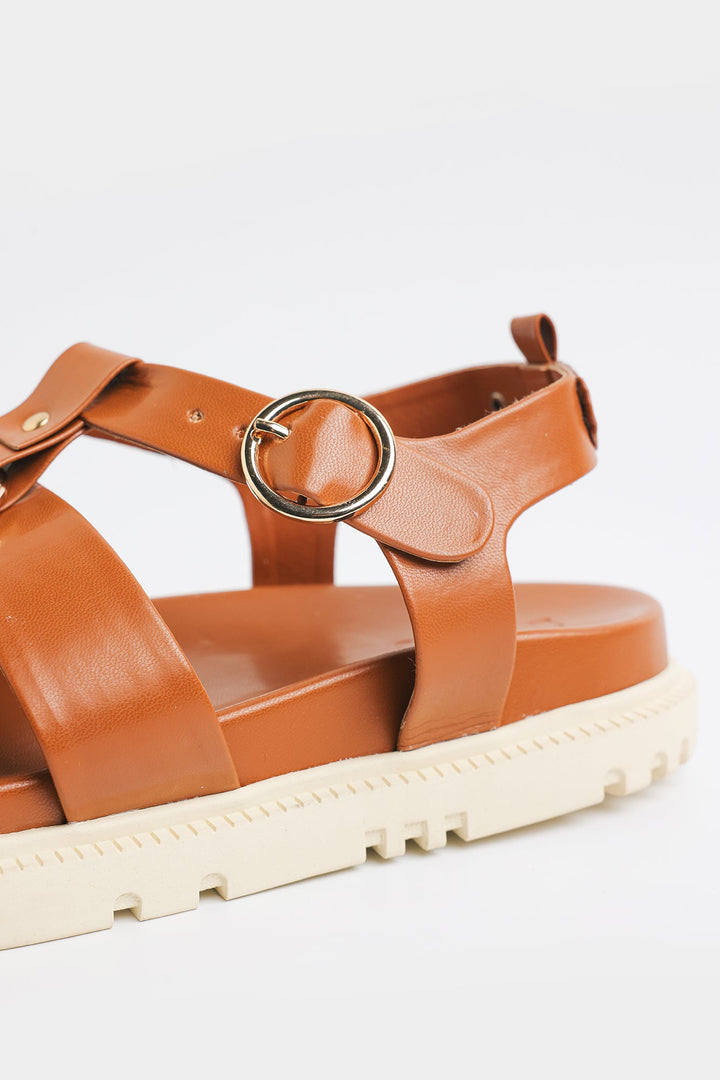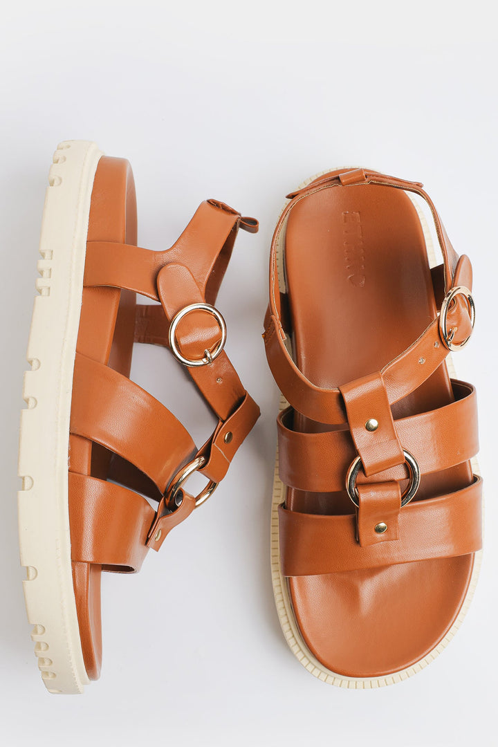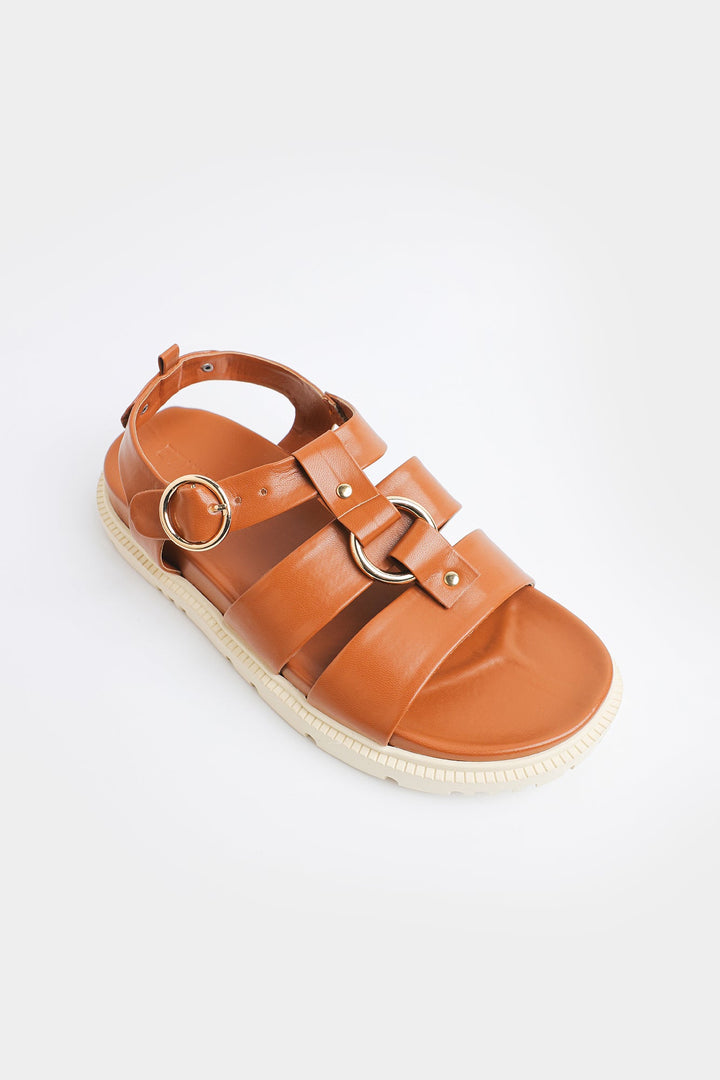 This brown sandal features three strips attached with golden circles, providing stylish support and comfort. this sandal adds a touch of elegance to any outfit. Perfect for a day out or a night on the town, this sandal is a versatile and trendy addition to any wardrobe.