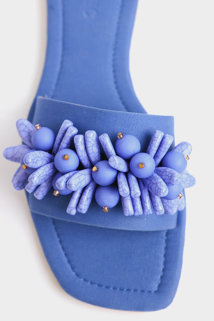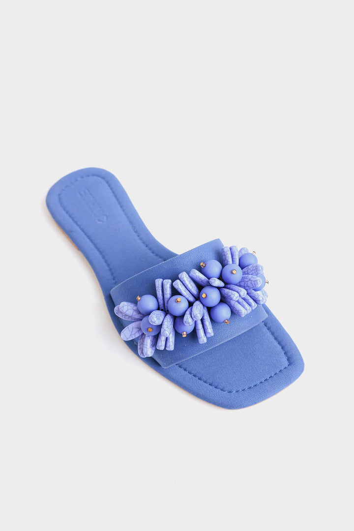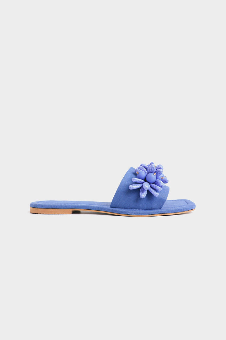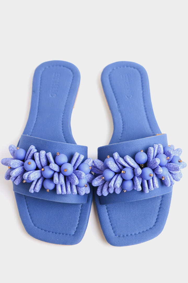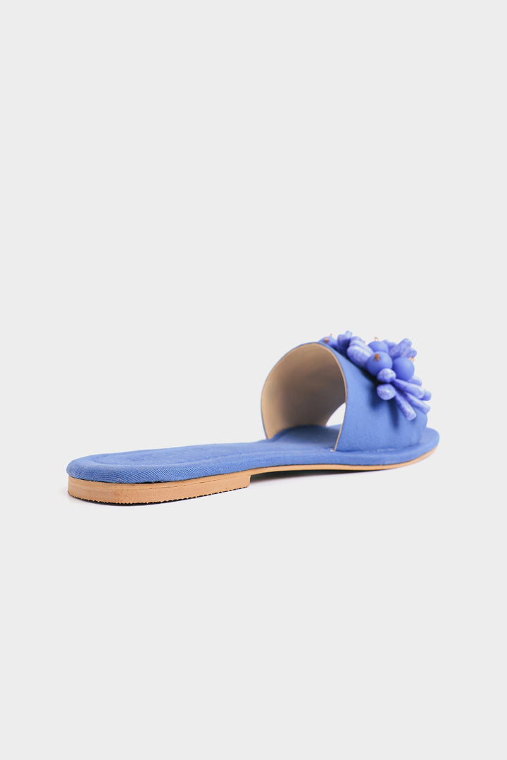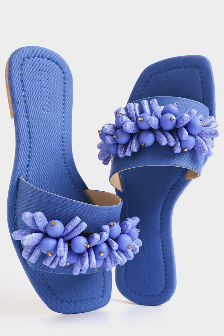 The deep blue textured base harmonizes with the meticulously arranged fabric petals and bead accents, creating a captivating blend of sophistication and artisanal charm. Designed for both comfort and style, they are the perfect statement piece for any refined ensemble.