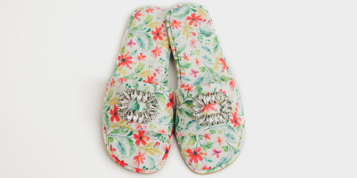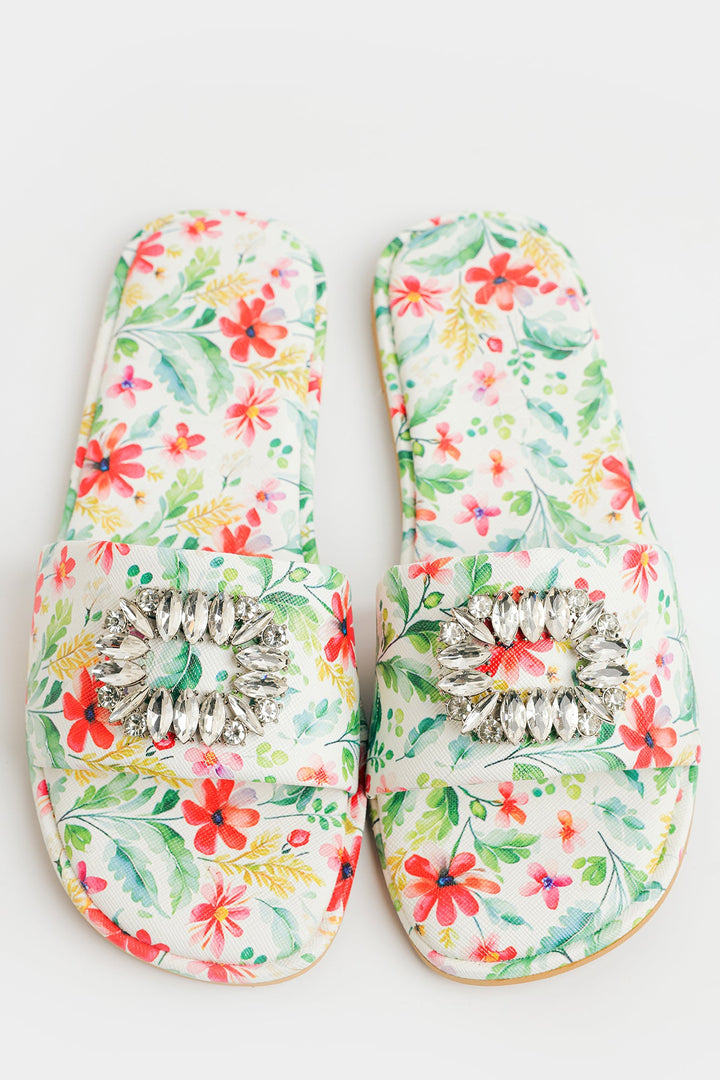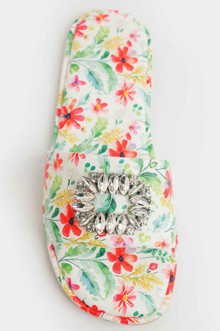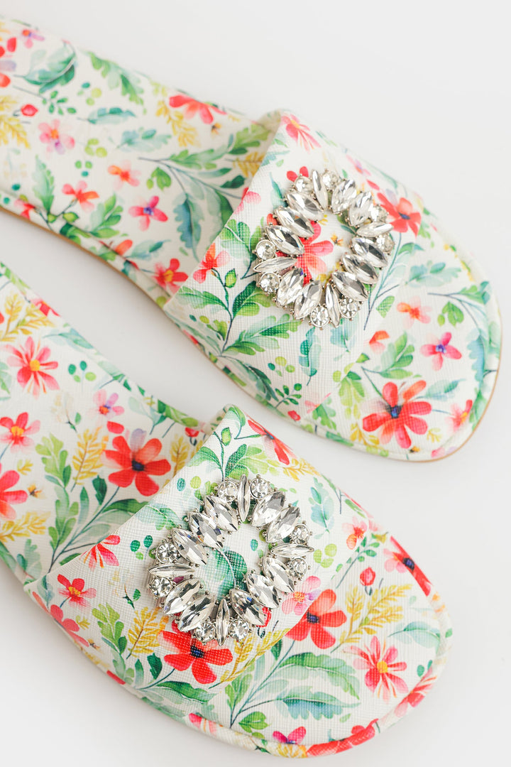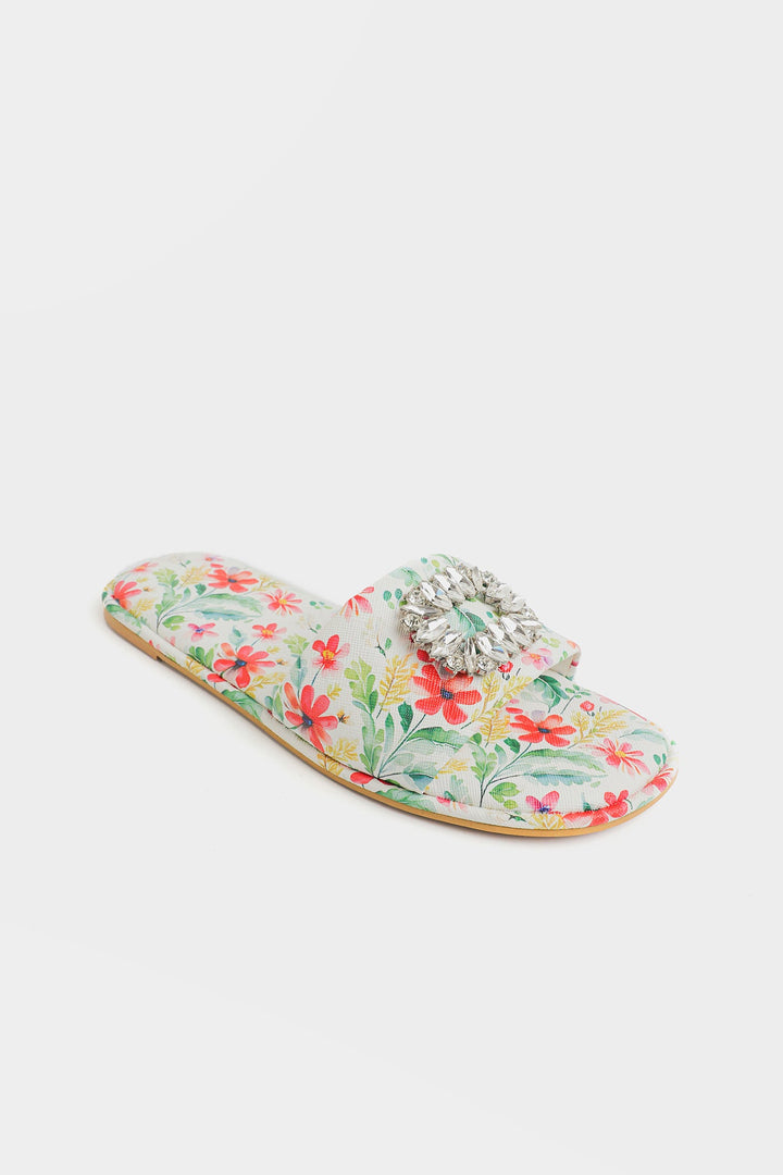 This elegant sandal features a classy design illustrating beautiful floral composition in mesmerizing hues. Adorned with wide strap design with dazzling plaque on top. The beautiful unique design and quality materials make it a must-have for any fashion-savvy individual.