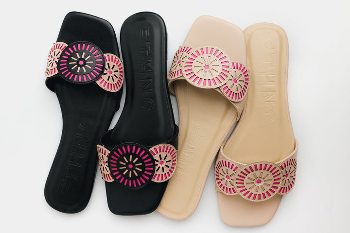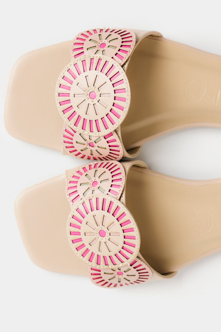Elevate your style with these chic slip-on sandals featuring intricate embroidered accents in vibrant pink and cream tones. The circular patterns on the strap add a playful yet sophisticated touch, making them perfect for casual outings or adding a pop of personality to your everyday look. Designed for comfort and flair, these sandals are a must-have addition to your footwear collection.