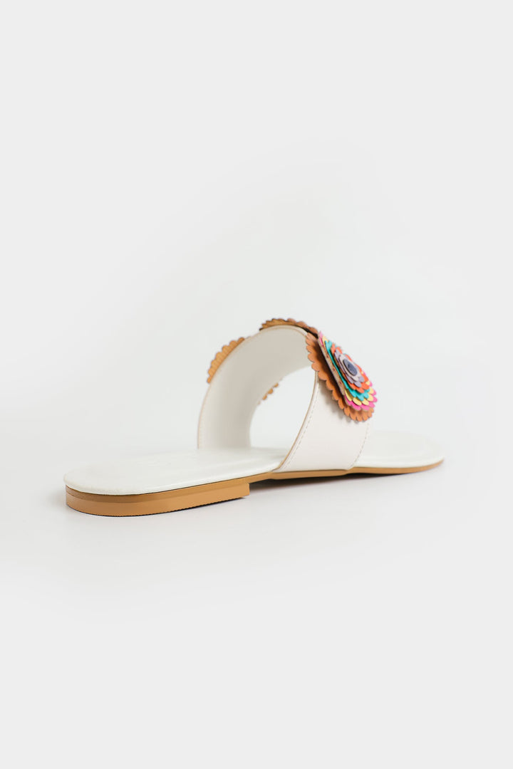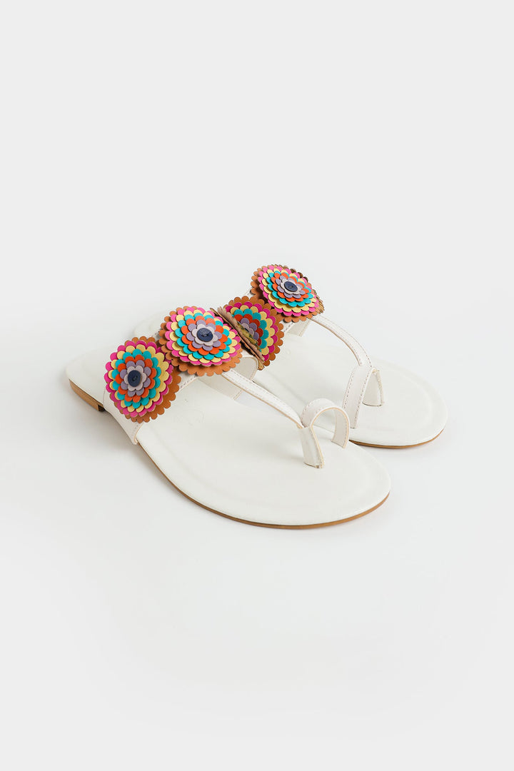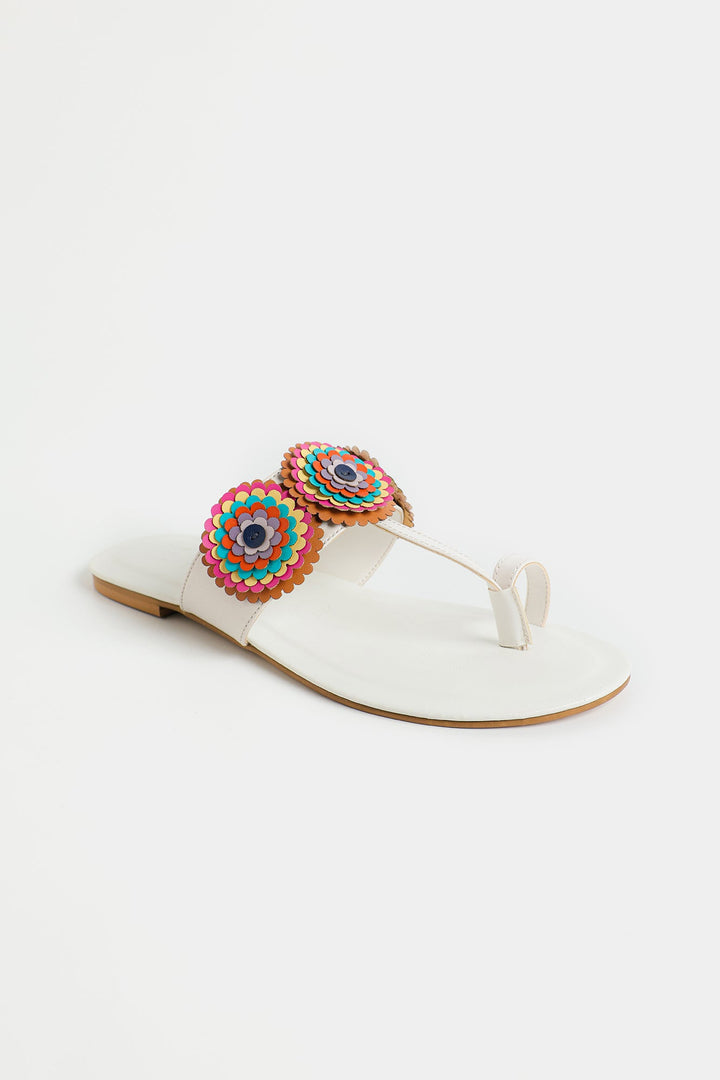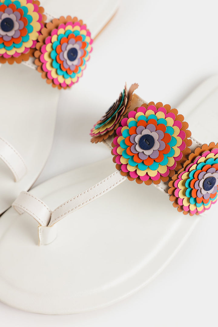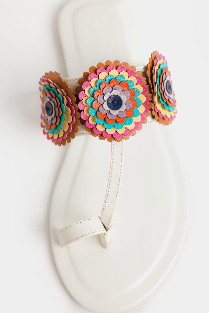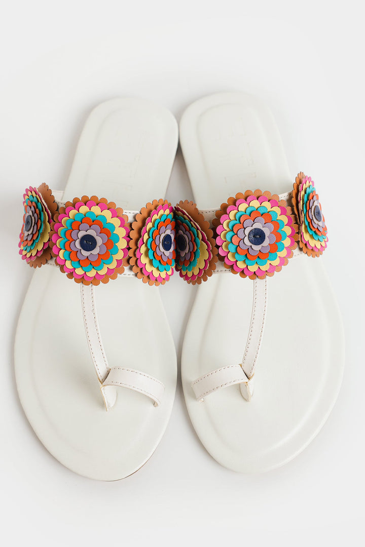 A burst of color to your wardrobe with these celestial white toe-post sandals. Featuring multi-layered floral embellishments in bold and cheerful hues, these sandals exude playful elegance. The intricate detailing on the strap makes them a statement piece, perfect for pairing with casual or festive outfits. Comfortable and stylish, they are designed to keep you effortlessly chic all day long.