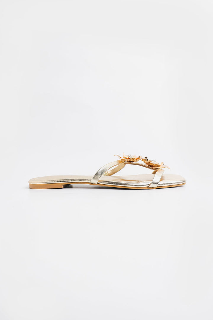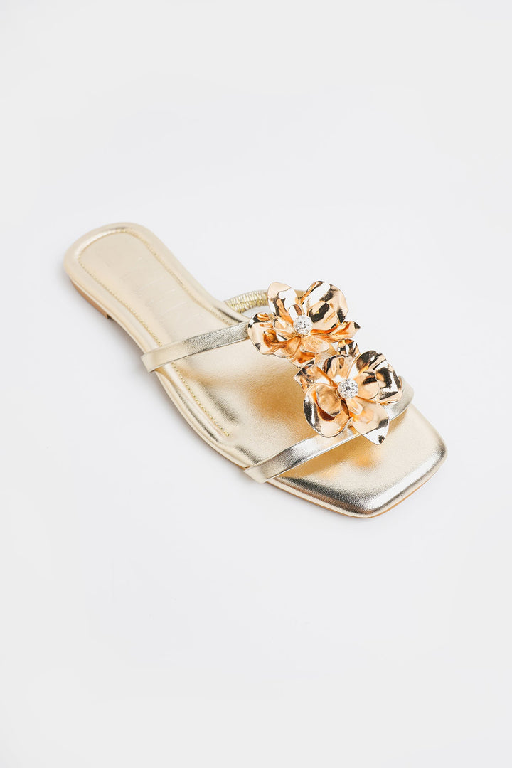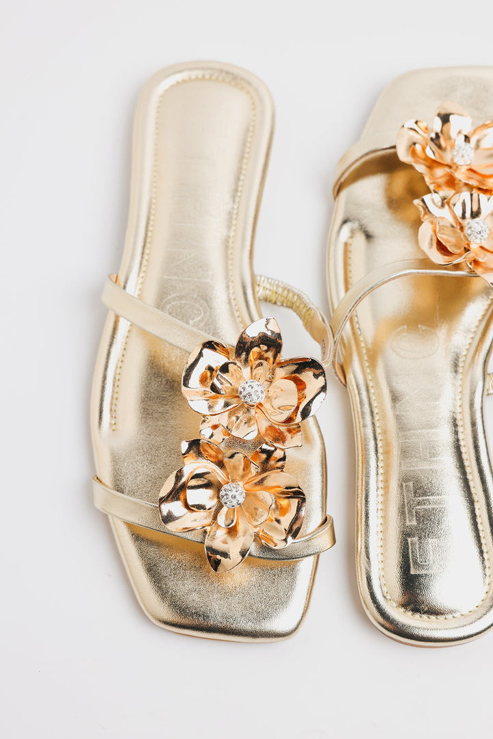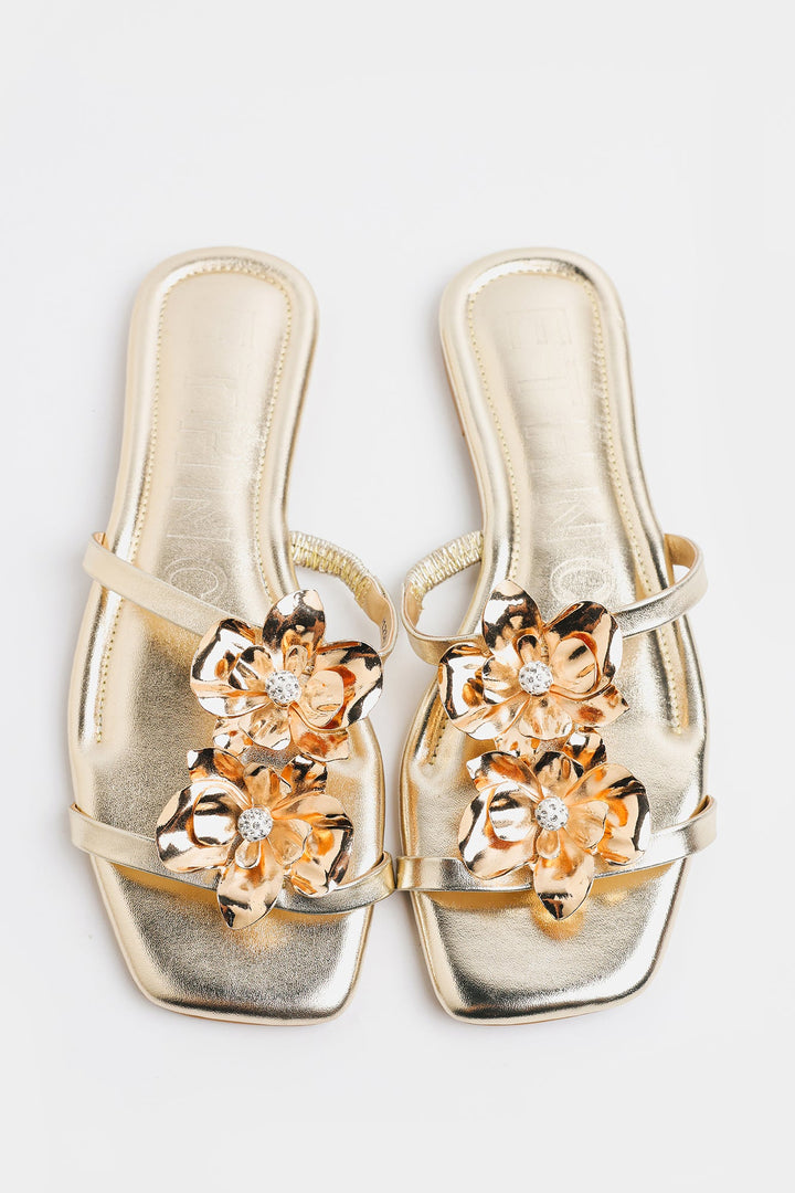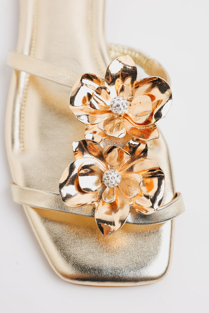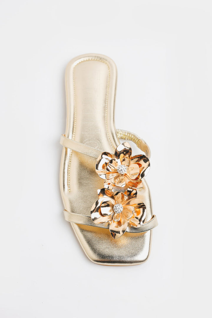 Luxurious golden sandal featuring dual straps, each adorned with an intricately crafted 3D golden flower embellishment. This sophisticated sandal exemplifies superior craftsmanship through its dimensional floral detailing, creating a statement piece for occasions demanding exceptional style.