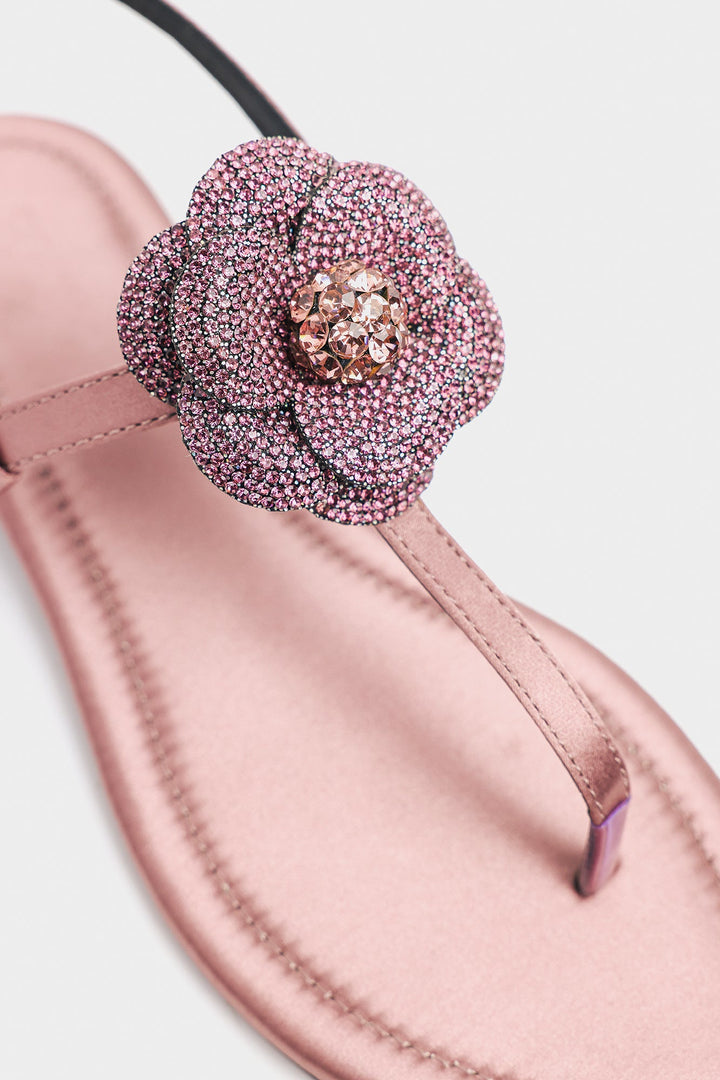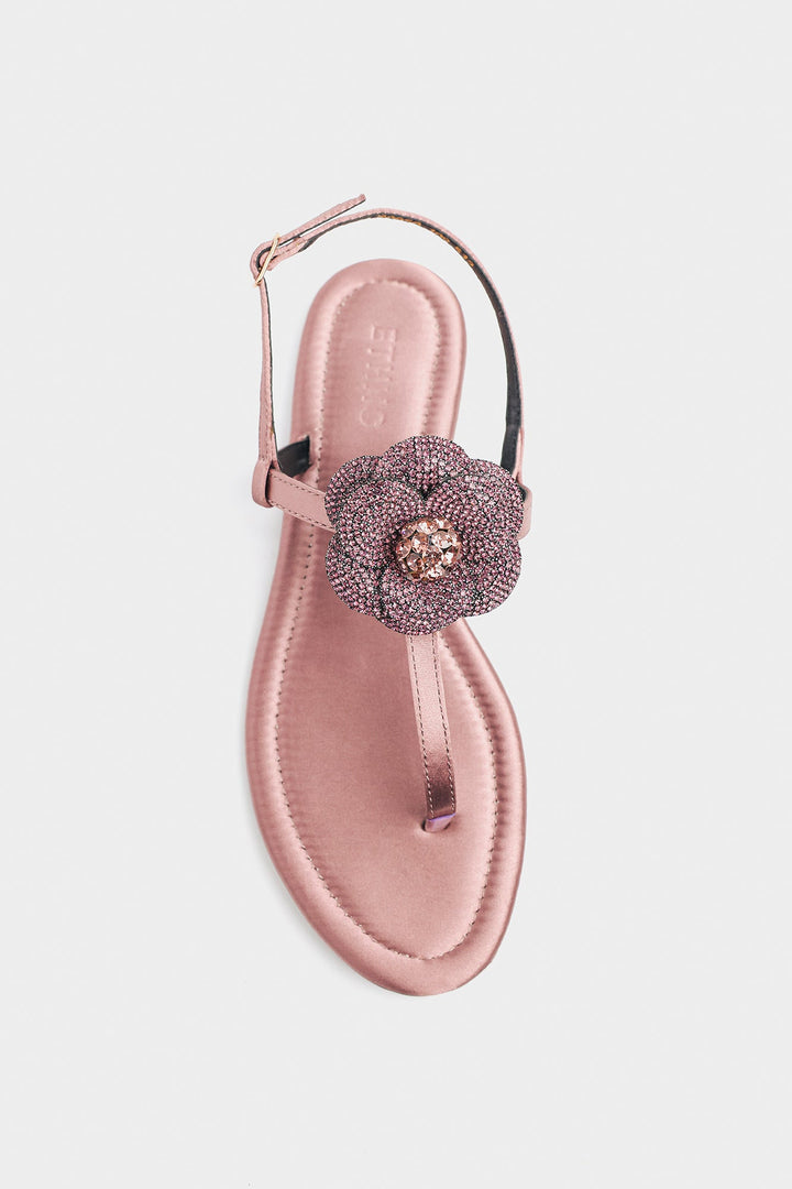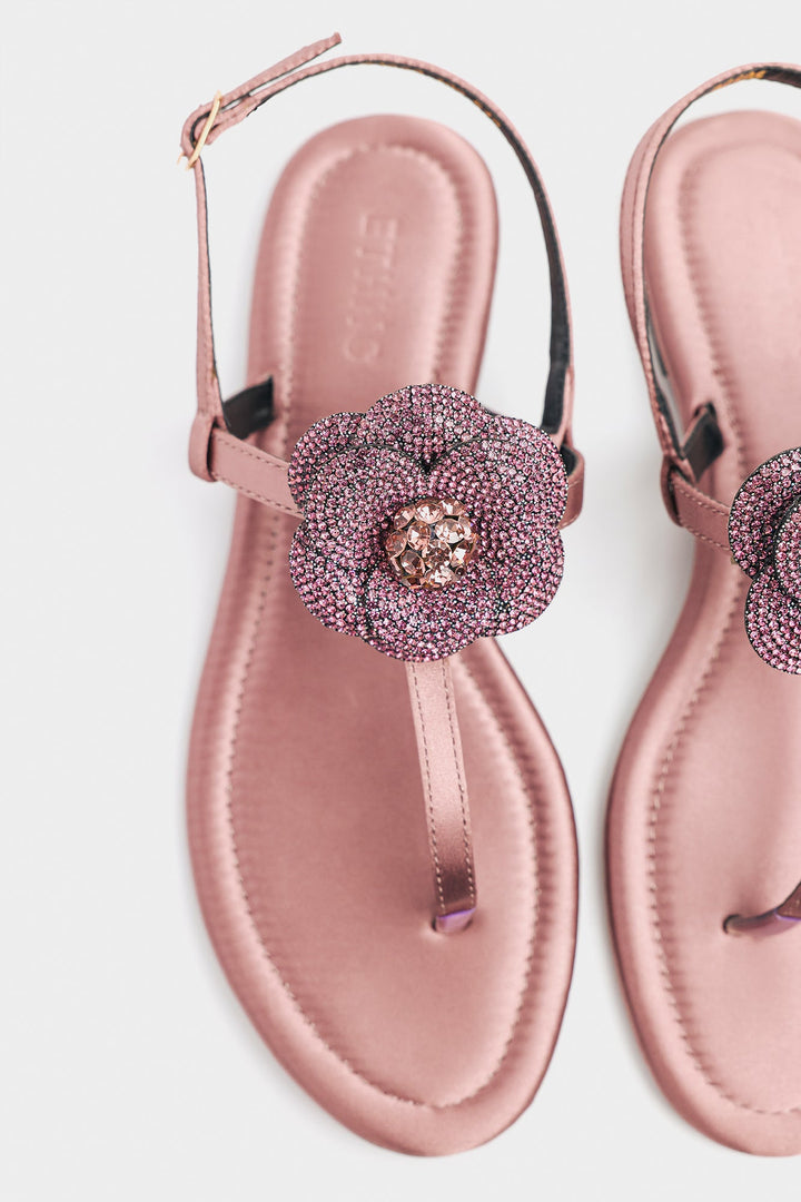 Step into dazzling elegance with these exquisite smoky grape hued thong sandals, featuring a mesmerizing large floral embellishment meticulously encrusted with shimmering rhinestones and sparkling gems. The delicate ankle strap provides both grace and perfect grip, making these the perfect choice for adding a touch of opulent glamour to your festive celebrations or summer soirees.