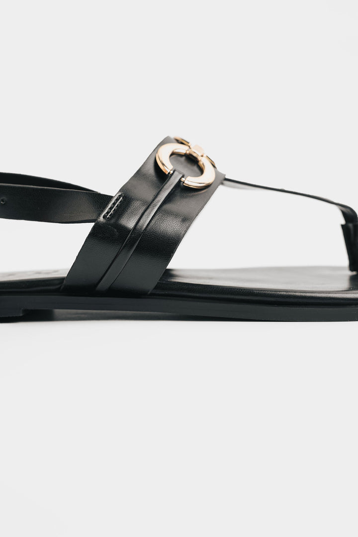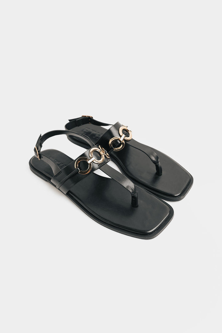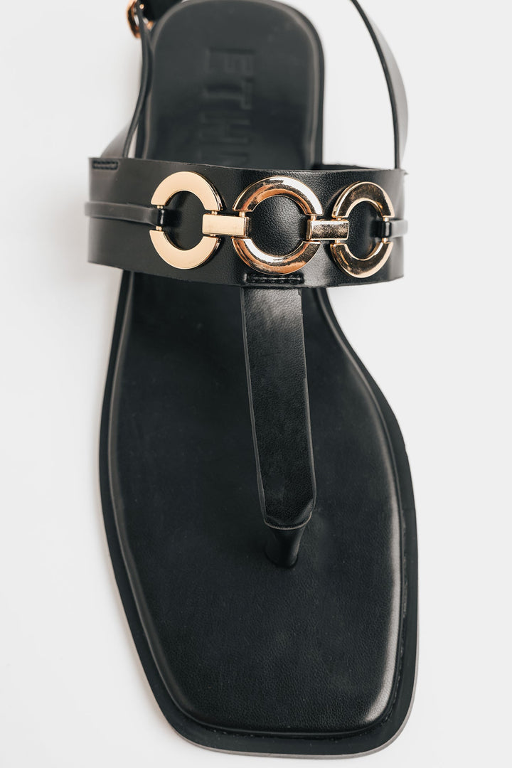 Discover understated elegance with these chic black flat sandals, featuring a sleek T-strap design adorned with striking gold-toned interlocking rings. The classic silhouette combined with modern metallic accents offers a versatile and sophisticated look, perfect for elevating your everyday style with effortless grace.