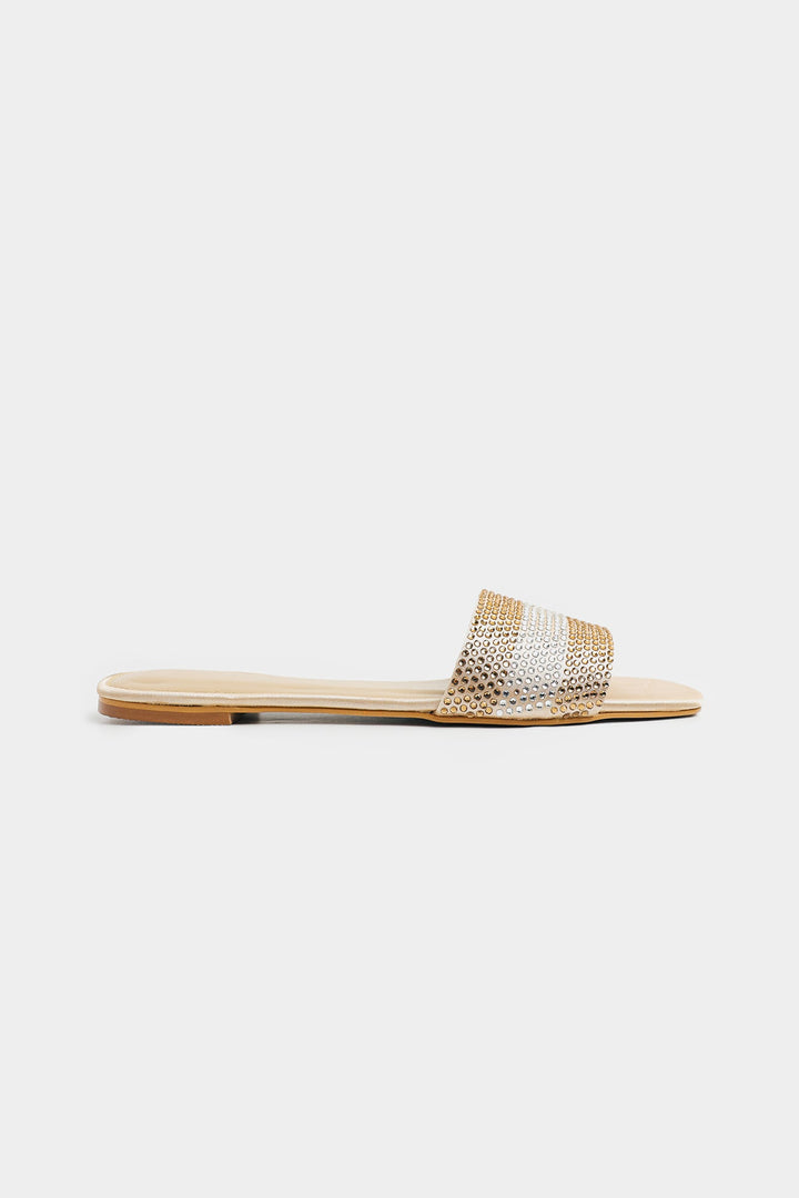 Radiate subtle glamour with these chic, champagne-toned slide sandals. Featuring two toned shimmering strap adorned with delicate gold and silver accents, they offer an effortless touch of elegance.