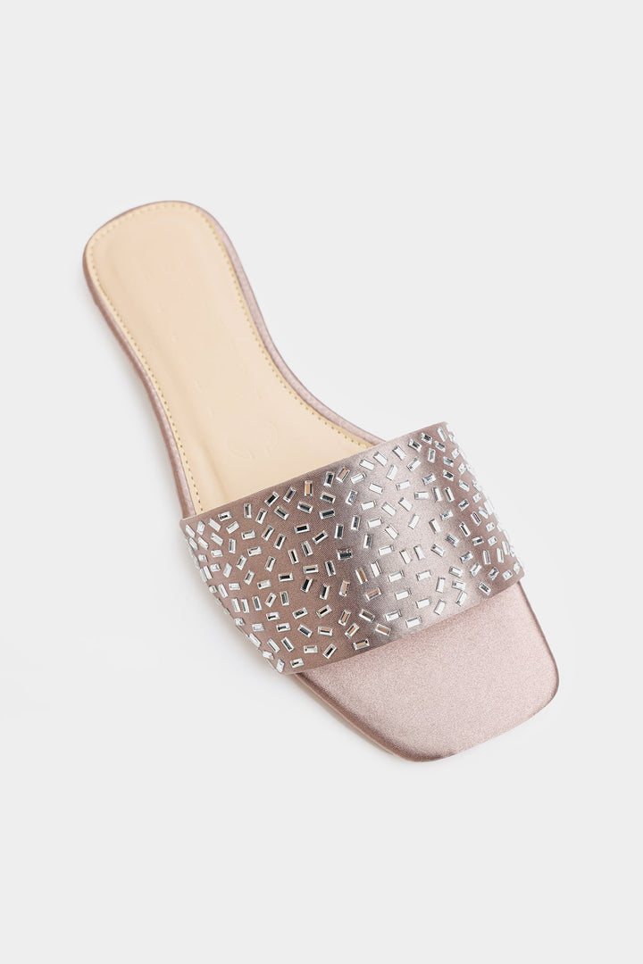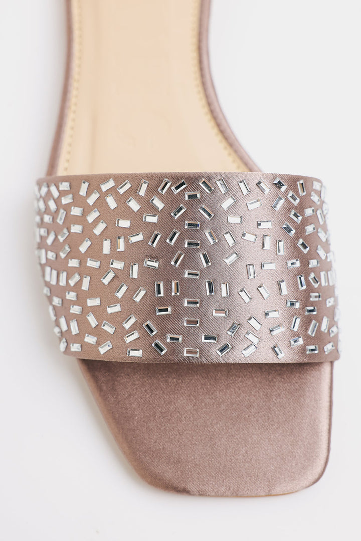 Shimmer and shine with every step in these elegant champagne-hued slides, featuring a wide strap lavishly adorned with glittering rectangular rhinestones. The subtle metallic sheen of the satin material perfectly complements the sparkling embellishments, making these the ideal choice for adding effortless glamour to any ensemble, from a casual chic look to a festive occasion.