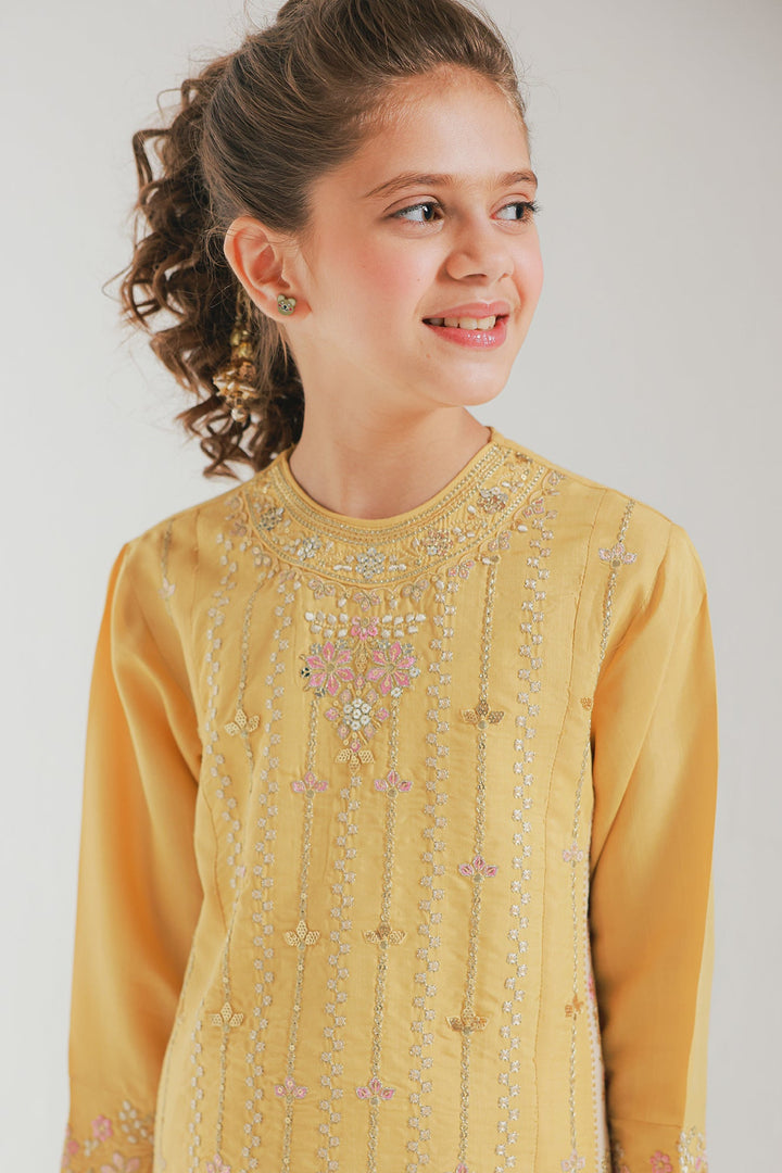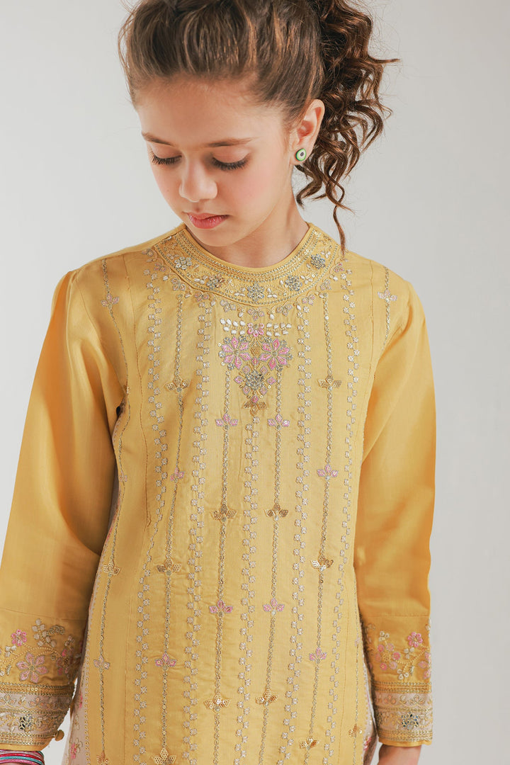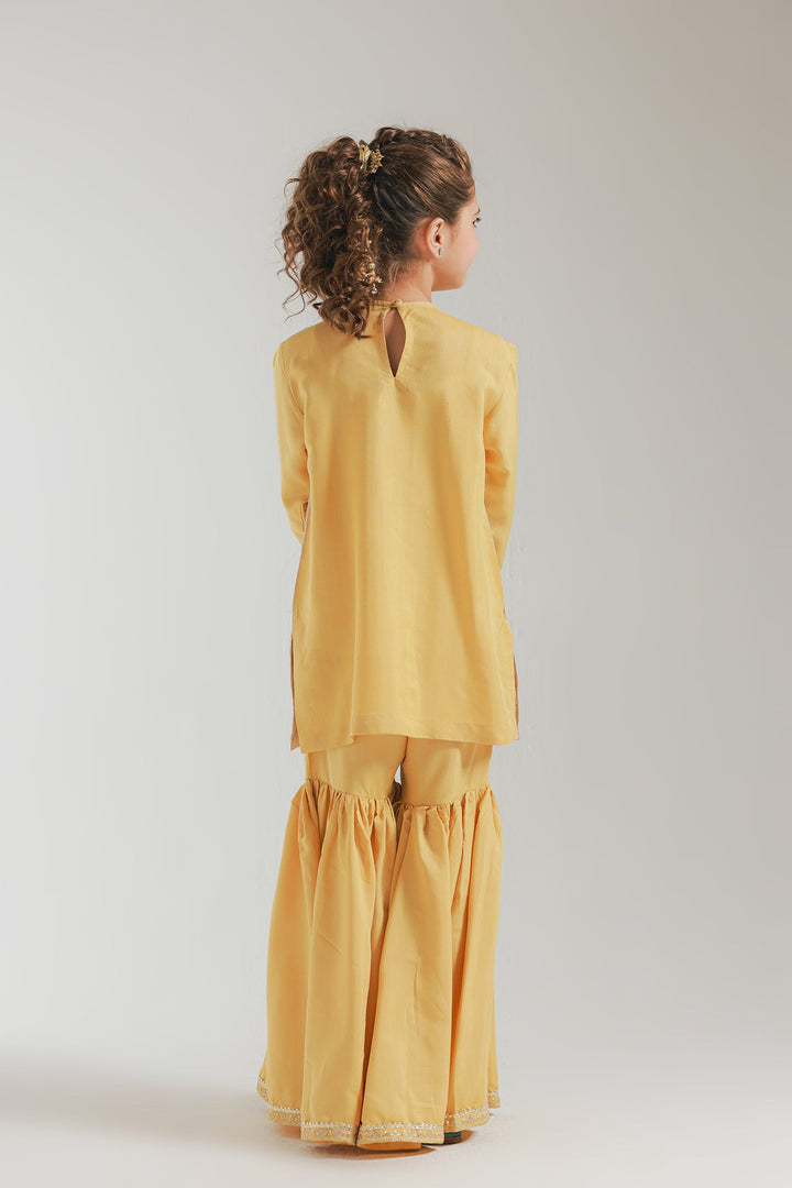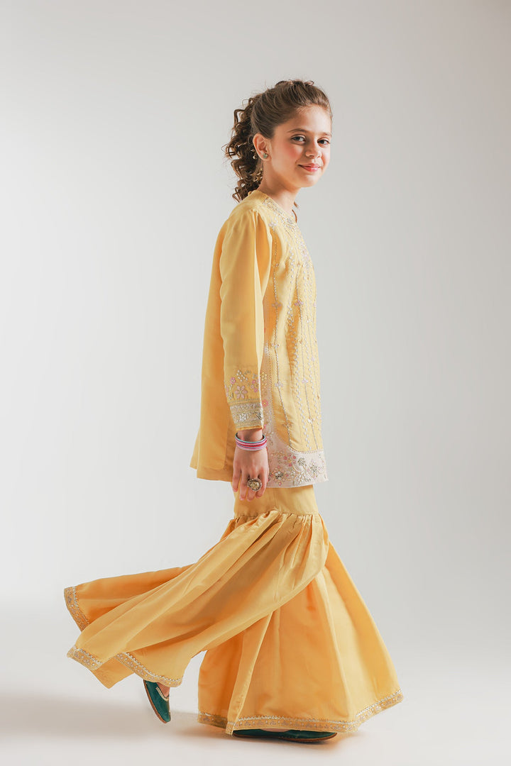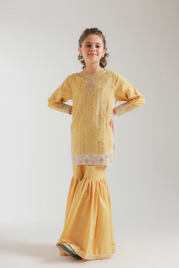 A contemporary composition crafted in a graceful silhouette shirt beautifully adorned with captivating floral designs embroidered in vibrant colors and enhanced with dazzling embellishments. Paired with a mesmerizing gharara enriched with captivating floral embroidery and scintillating embellishments, this style statement outfit is a perfect option for your girls to embrace at festive occasions.