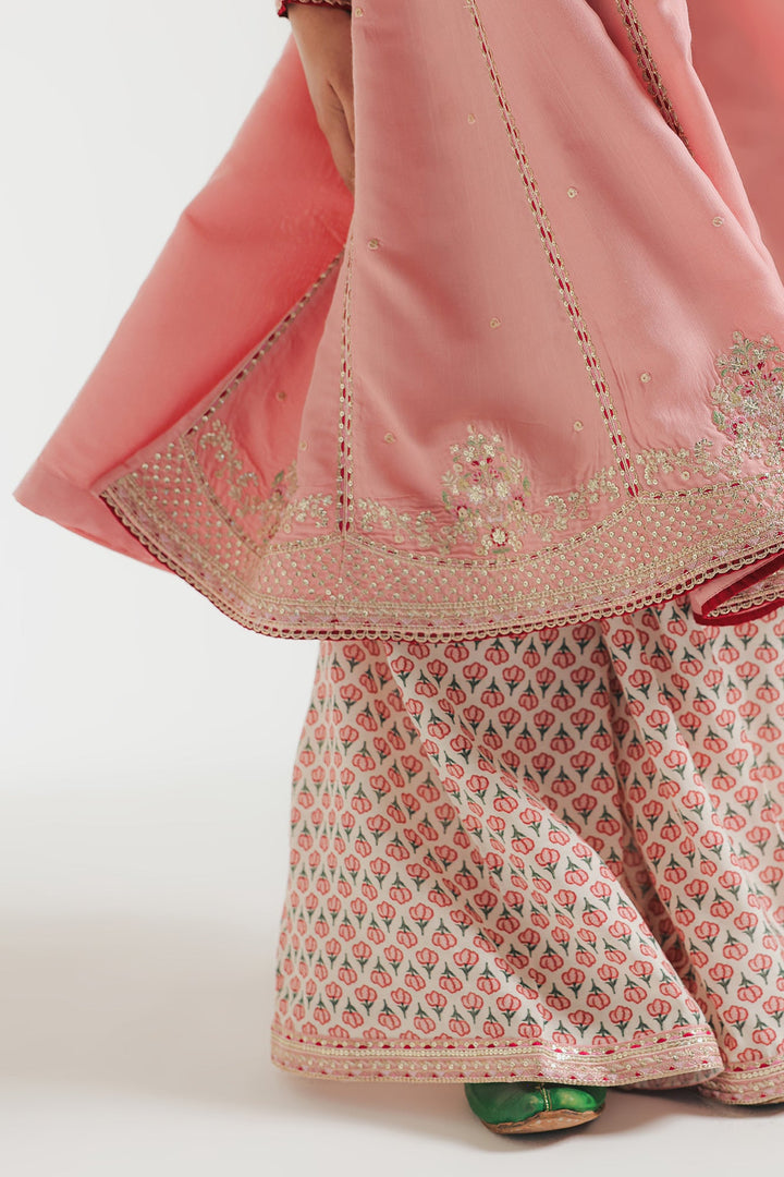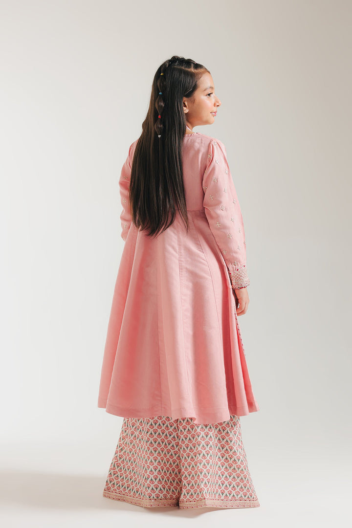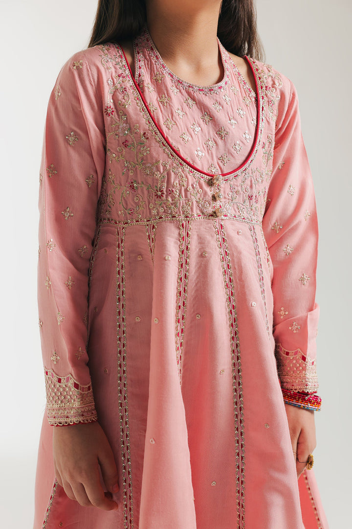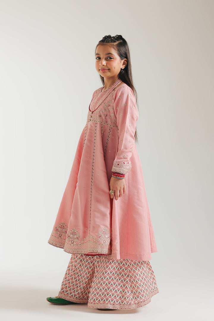 Dress your little one in enchanting elegance with this beautiful pink festive outfit. The flared pishwas features a charming blend of traditional and contemporary design, adorned with delicate silver embroidery and intricate embellishments that catch the light with every twirl. The rich pink fabric is complemented by a subtle contrasting trim around the neckline, in deep maroon, adding a touch of depth. The ensemble is completed with a matching flapper, featuring an all-over print that perfectly harmonizes with the pishwas. Pair it with traditional sandals for a complete, delightful look.