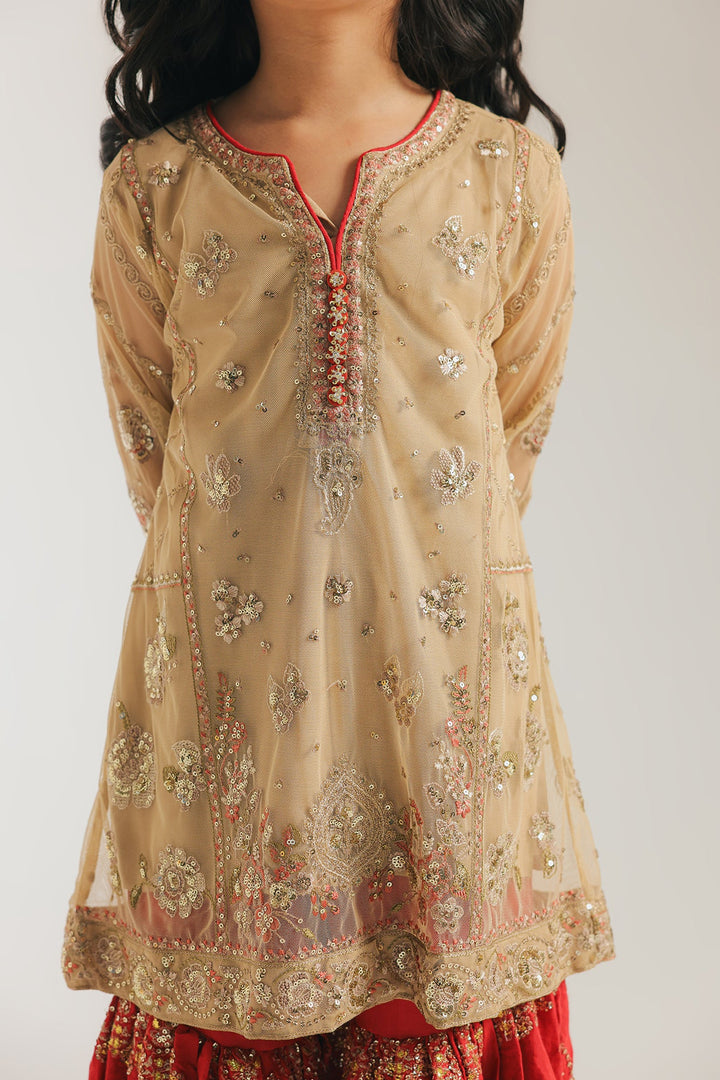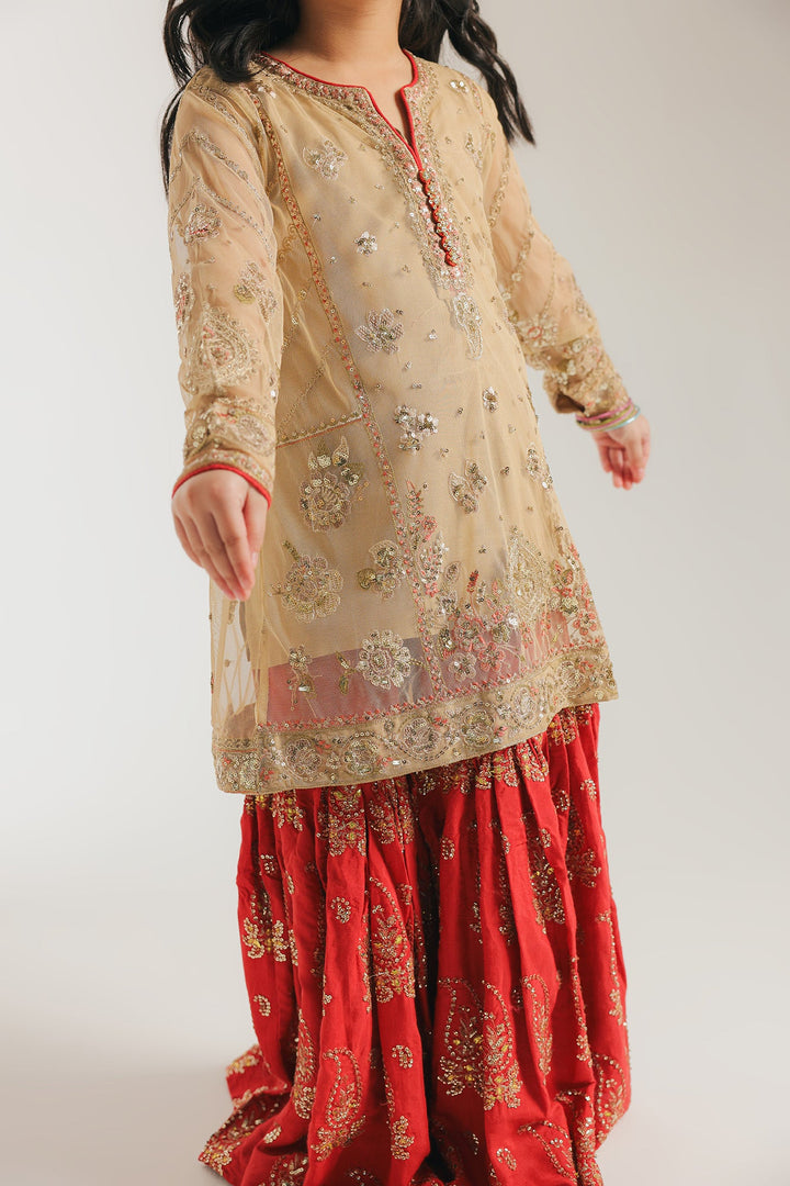 A truly enchanting ensemble, this three-piece suit is designed for celebrations. The graceful frock is crafted from a sheer, delicate fabric in a soft, golden beige, shimmering with all-over sequin work and intricate embroidery. A vibrant red trim at the neckline and a matching embroidered border along the hem add a beautiful pop of color. The frock is perfectly complemented by the flowing, ruby-red gharara, which is adorned with its own delicate patterns. A matching slip is included to complete this elegant and festive look.