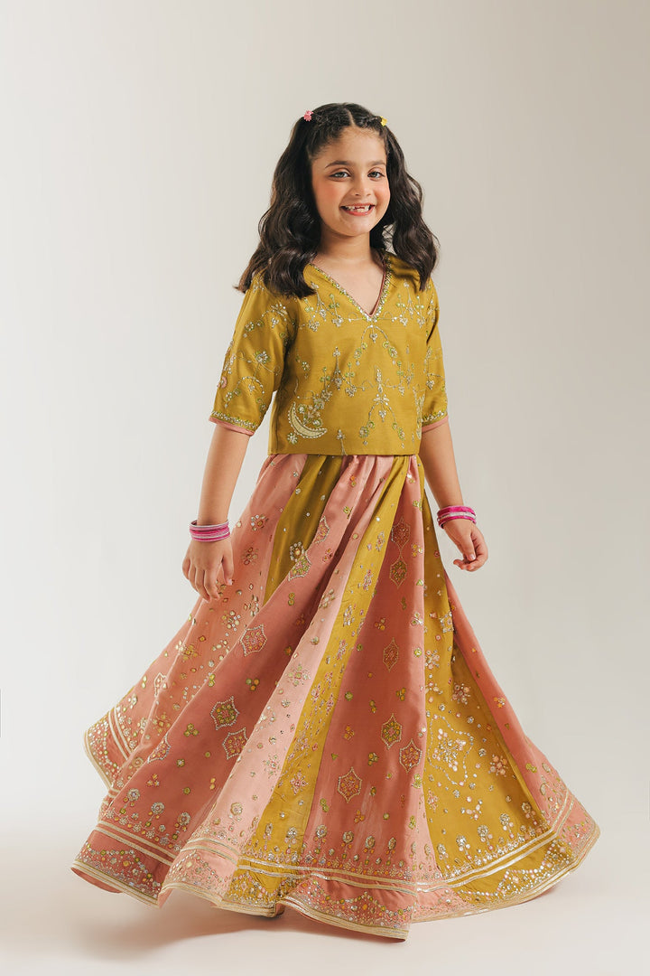 Unveil a vision of festive charm with this magnificent embroidered choli and lehenga set for your little one. The short-sleeved choli in a rich, mustard-gold fabric features delicate embroidery across the front and sleeves, adding a subtle sparkle. The look is completed by a stunning, full lehenga in a vibrant design. The flowing skirt features panels of mustard-gold, heavily adorned with gold floral embroidery, interspersed with striking vertical panels of soft blush pink and an intricately detailed, elaborate border at the hem. This suit is the perfect choice for making a dazzling and unforgettable statement at any grand celebration.