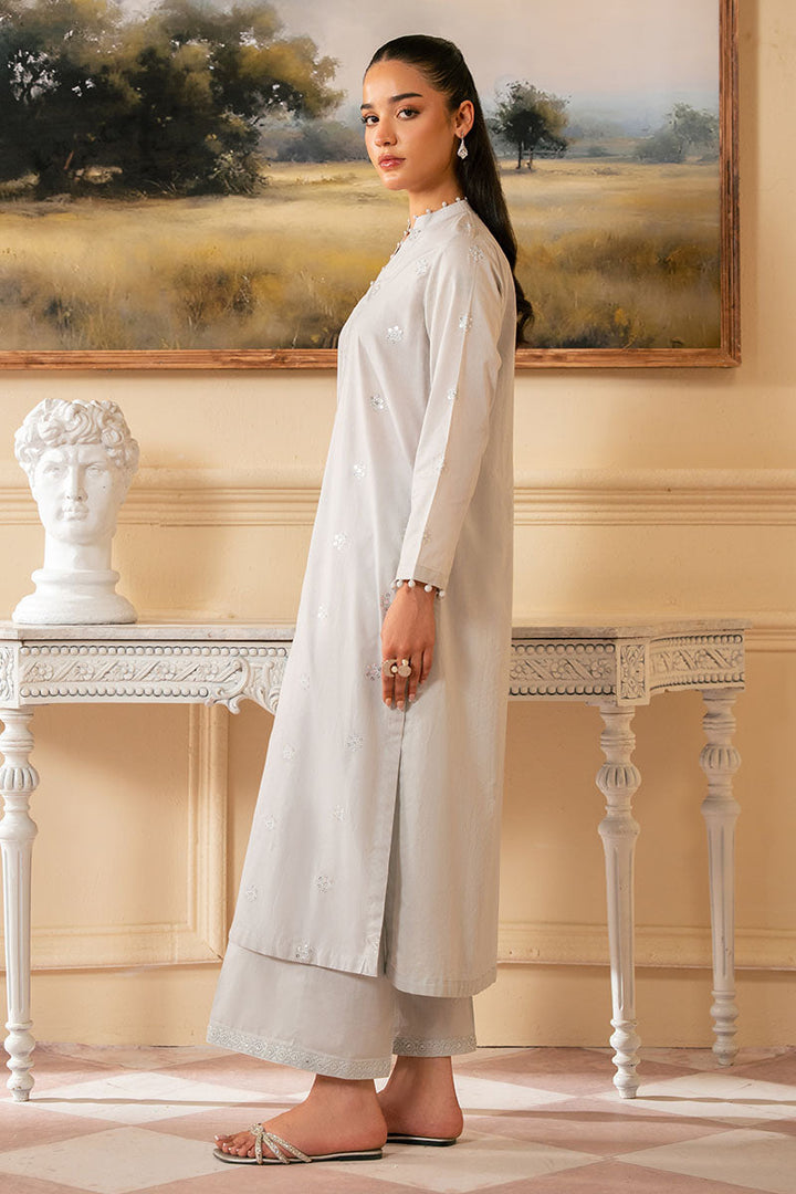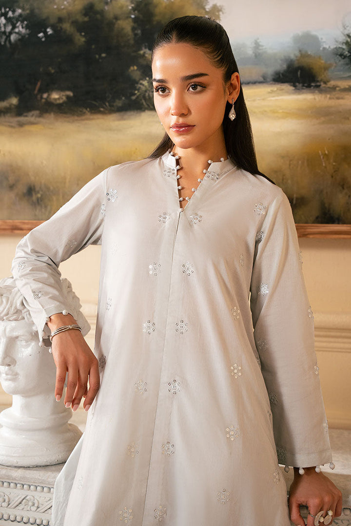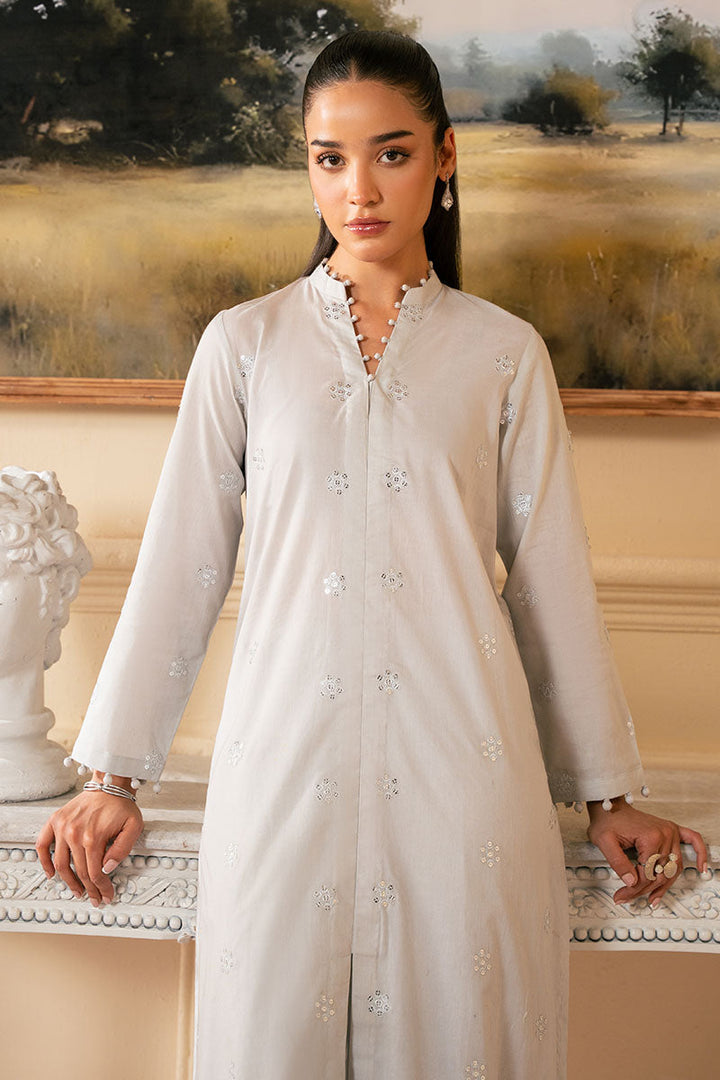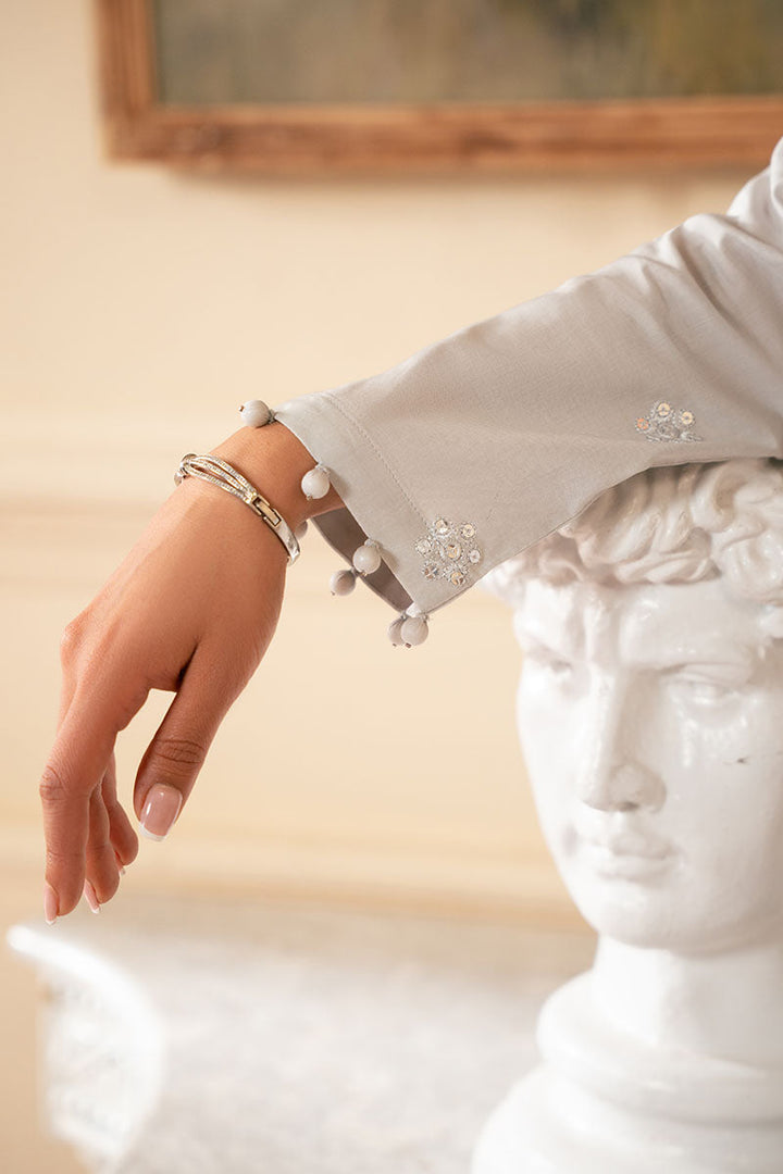 - Step out in style with our SERENE HAZE-2PC (SHIRT & TROUSER) set. The SHIRT features a straight front open style with front sequin embroidery and a half band neckline with a V-slit. The TROUSER is crafted from cambric culottes with elegant embroidery on the hem. Perfect for a classy and sophisticated look.