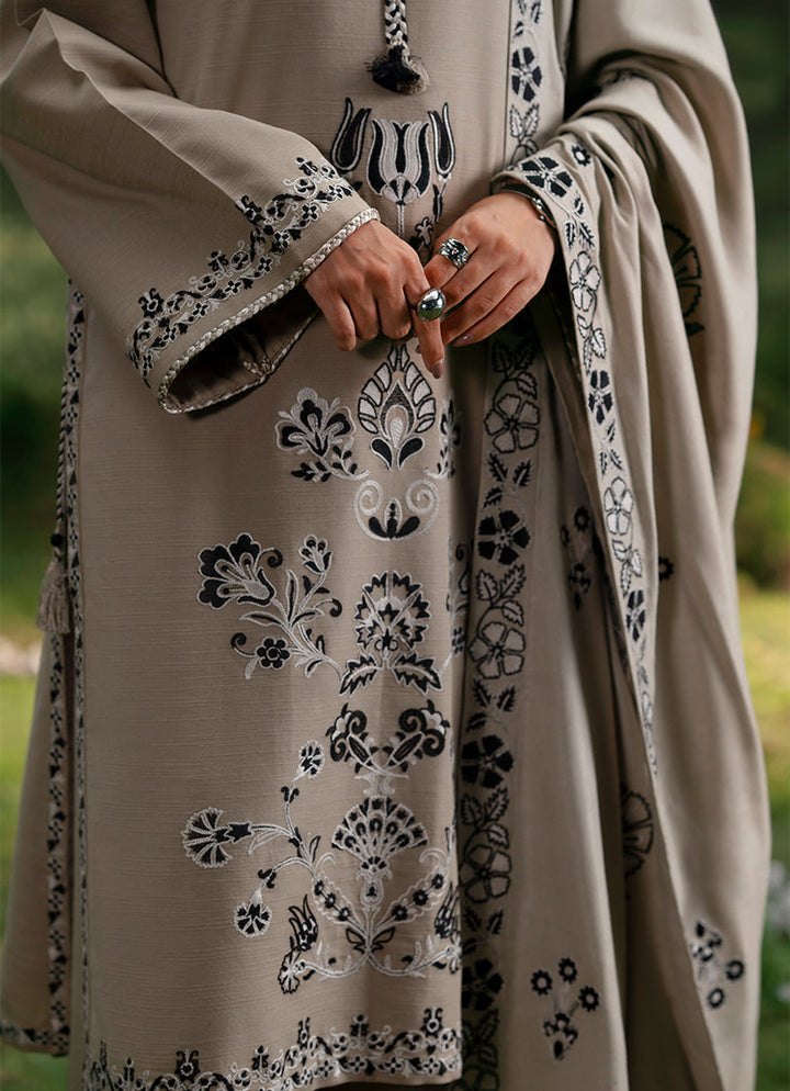 Shehrzad in Sand Beige/Beige from our Winterkari '25 Collection. An embroidered khaddar 3pc unstitched outfit paired with khaddar trousers & an acrylic shawl.