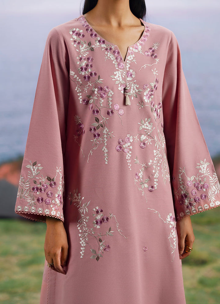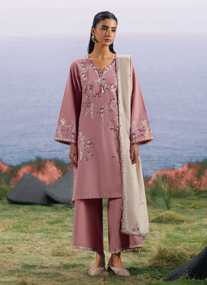 Shireen in Coral Pink/Beige from our Winterkari '25 Collection. An embroidered khaddar 3pc unstitched outfit paired with khaddar trousers & an acrylic shawl.