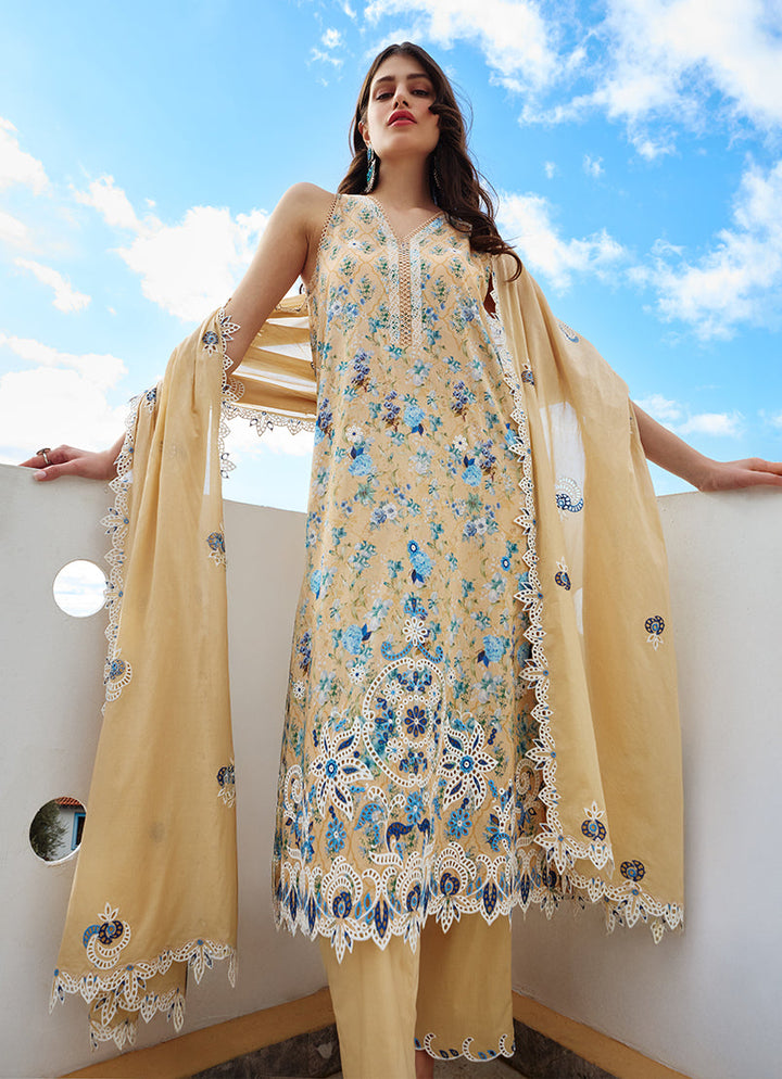 Simaaya in Beige from our Spring Printkari '25 Collection. A printed cutwork embroidered cotton 3-piece outfit paired with dyed voile embroidered dupatta.