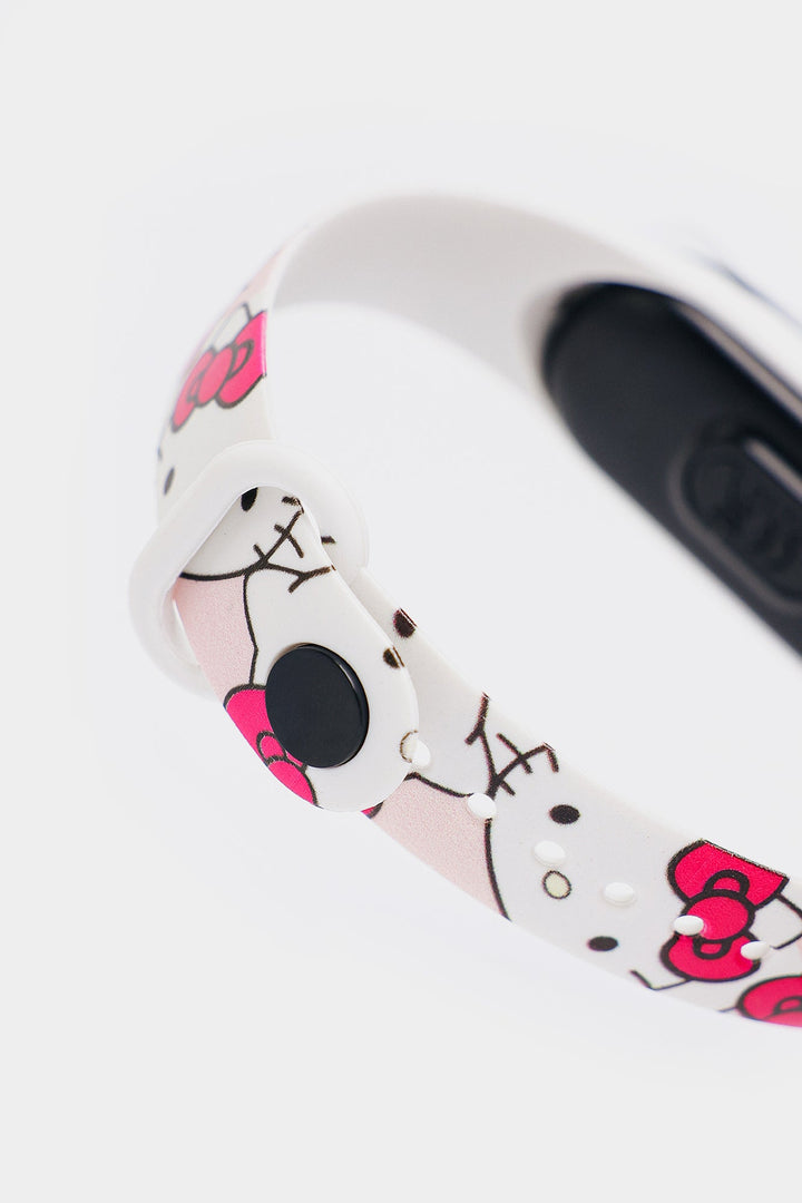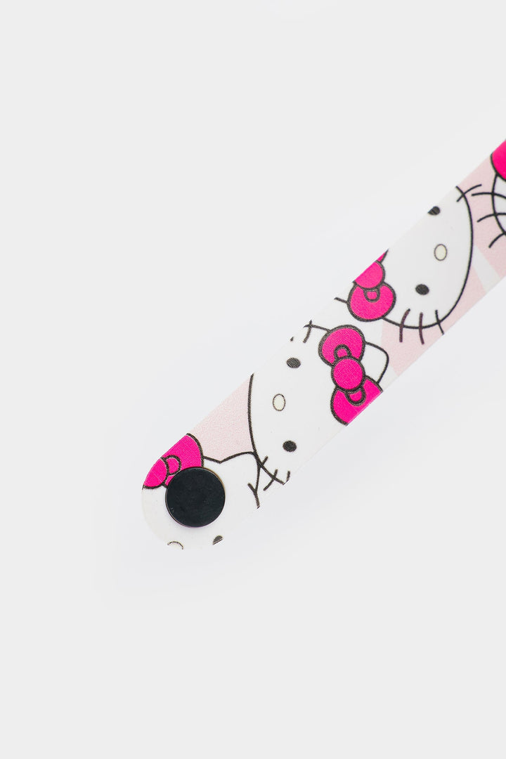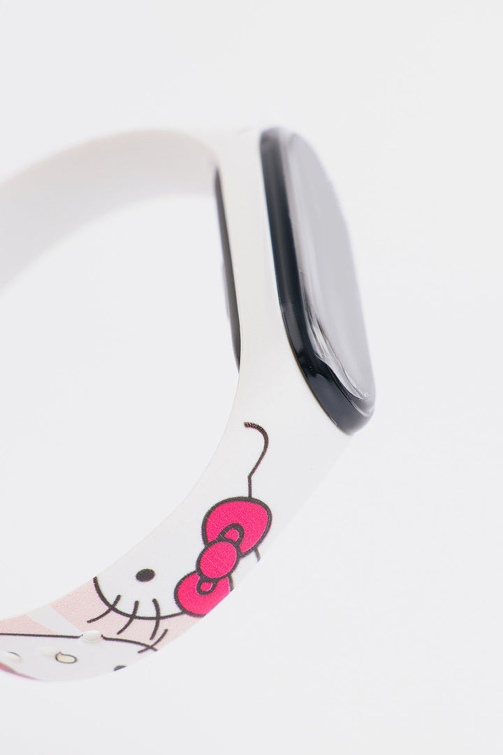 A trendy yet fashionable digital watch for your girls with an oval shaped digital screen showcasing a classic design with modern functionality. Portraying adorable hello kitty illustrations on strap rendered in coconut milk shade, Let your girls add this perfect accessory to their statement look.