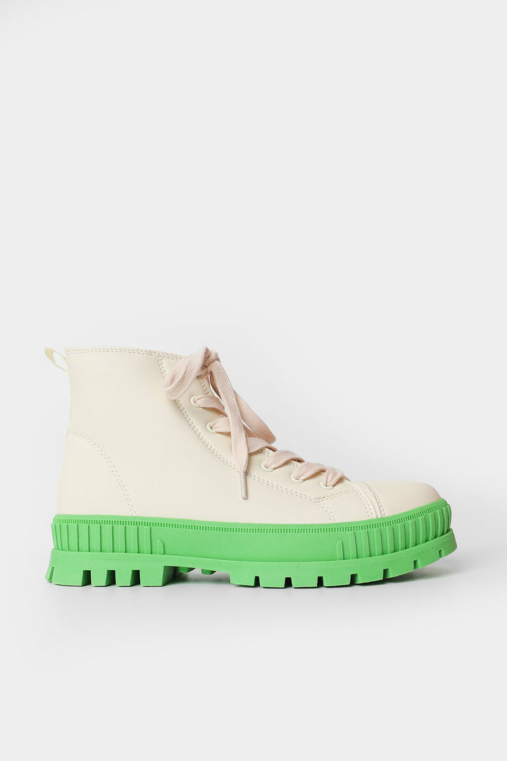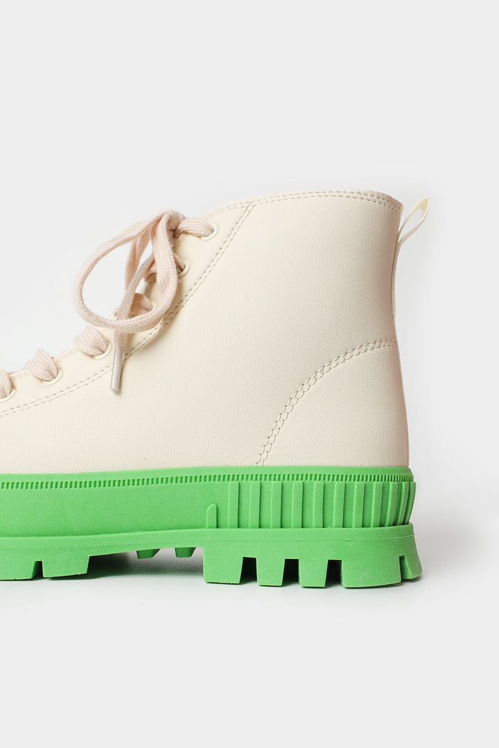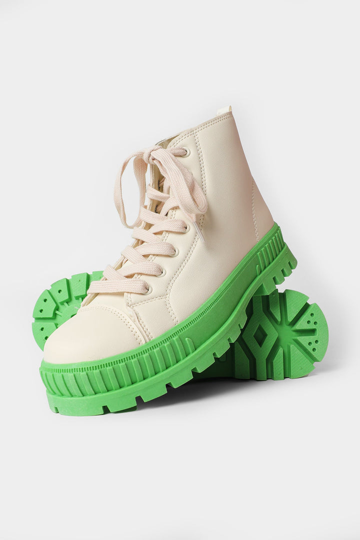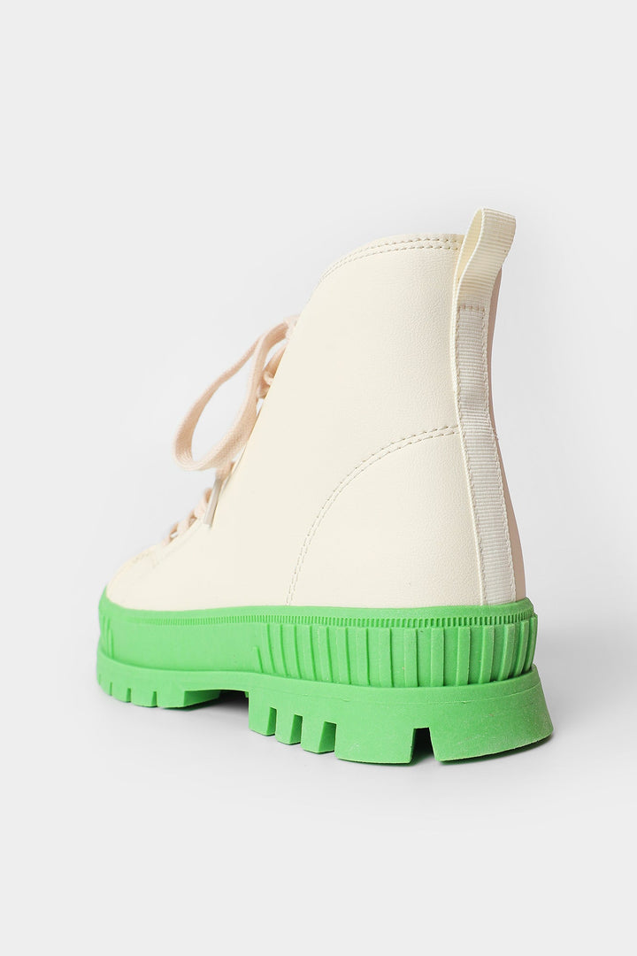 A dazzling composition is portrayed on these trendy sneakers. Rendered in a classic off white shade and enriched with experimental design with contrasted green sole, style this fashion forward sneakers with gleaming outfits this season.