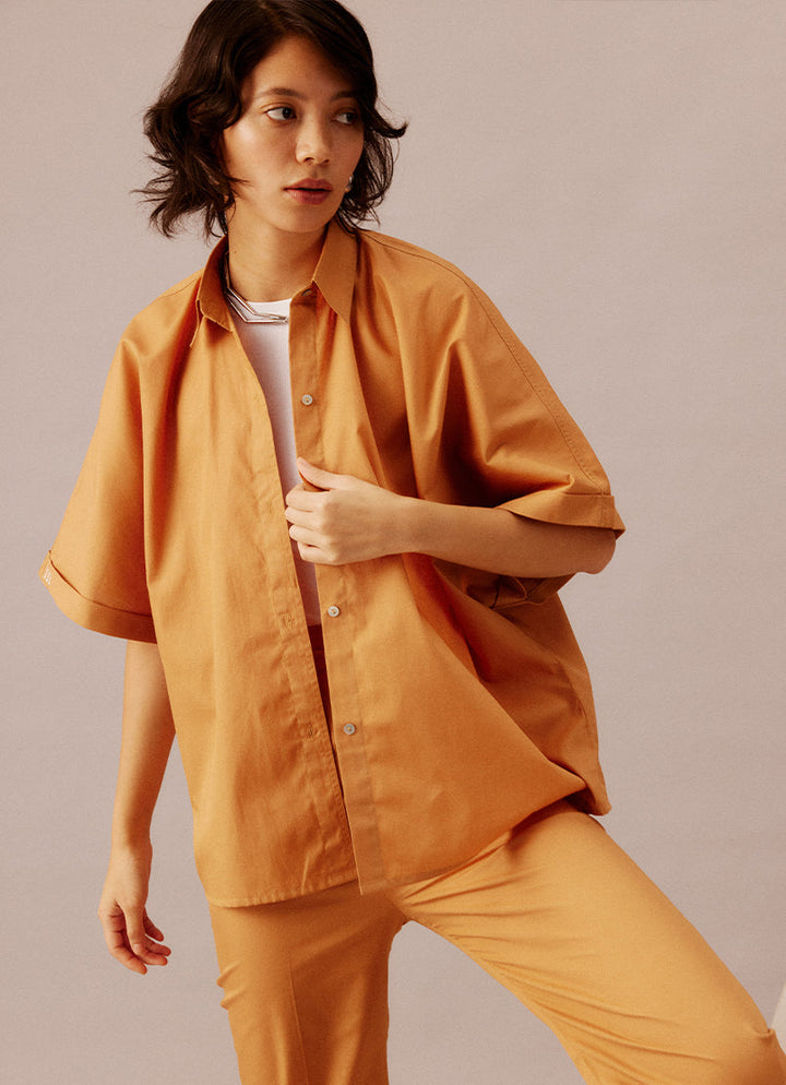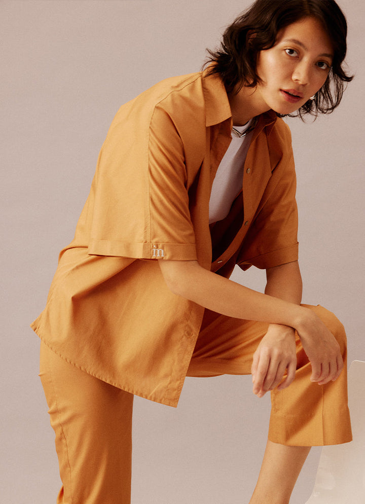 In a lively tangerine hue, this co-ord set adds a pop of colour to your wardrobe, perfect for brightening up your day. The button-down shirt features a classic collared design, along with three-quarter relaxed-fit sleeves. Paired with the relaxed-fit trousers, this set epitomizes easy elegance.
