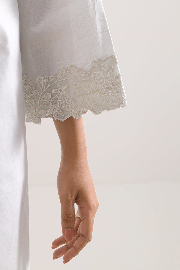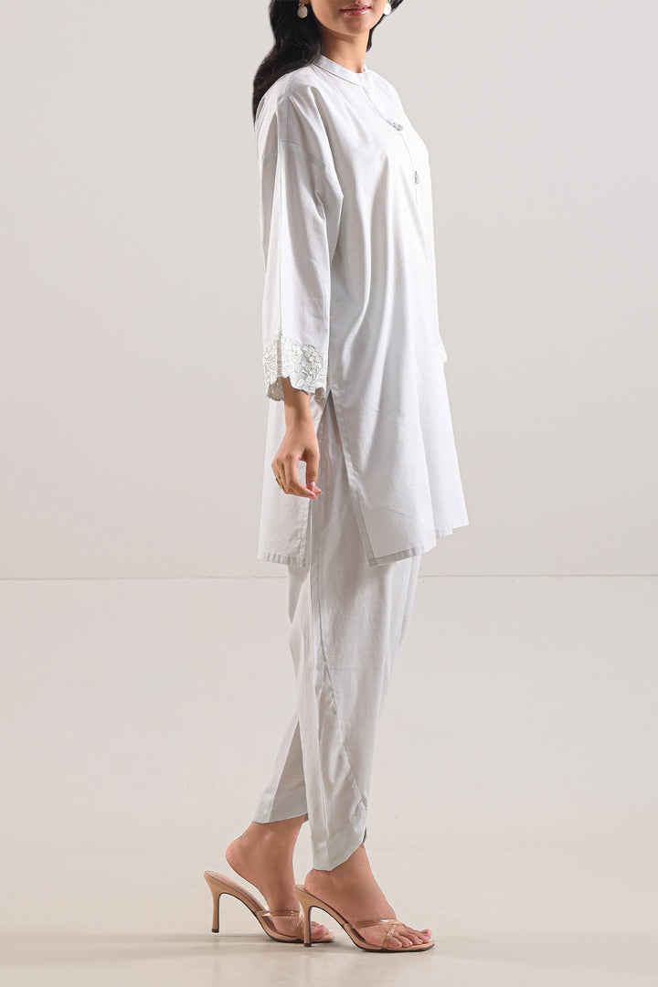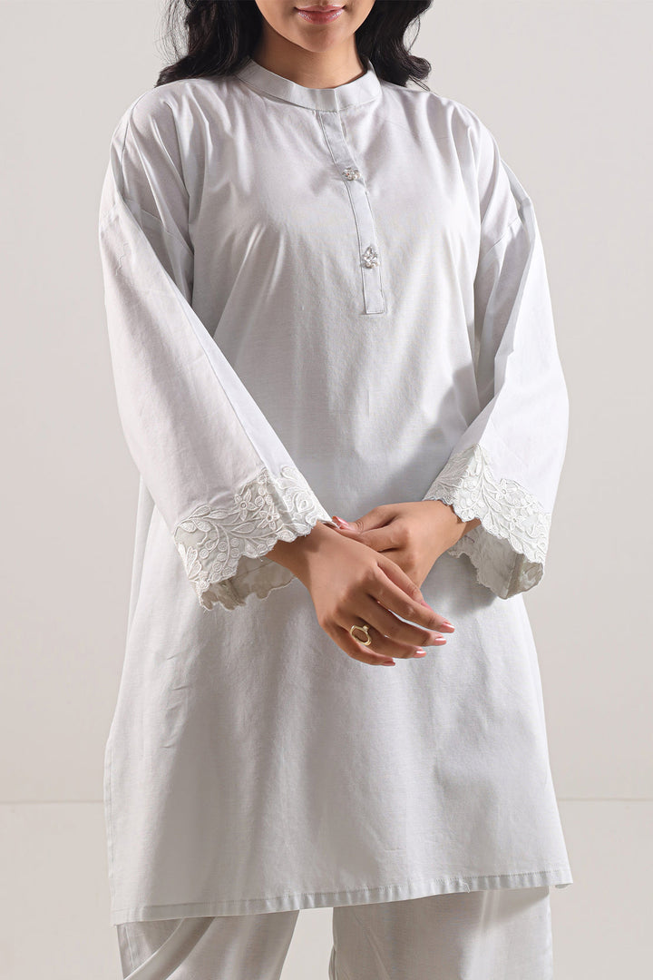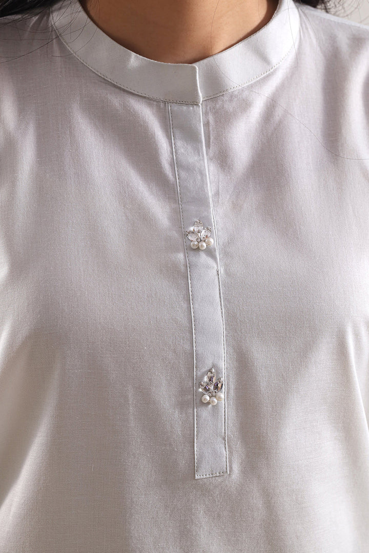 Greyish White Solid Embroidered Cambric Two-Piece From SAYA Includes A Ready-To-Wear Shirt And Trouser Crafted In Soft, Durable Cambric Fabric. Shirt Features Delicate Tonal Embroidery On A Clean Solid Base, With Classic Collar And Neat Stitching For A Polished Look. Trouser Mirrors The Shirt’s Tone For A Coordinated Ensemble That Exudes Minimalist Elegance. Perfect For Office Wear, Day Events, Or Stylish Everyday Outings Where Subtle Sophistication Matters.