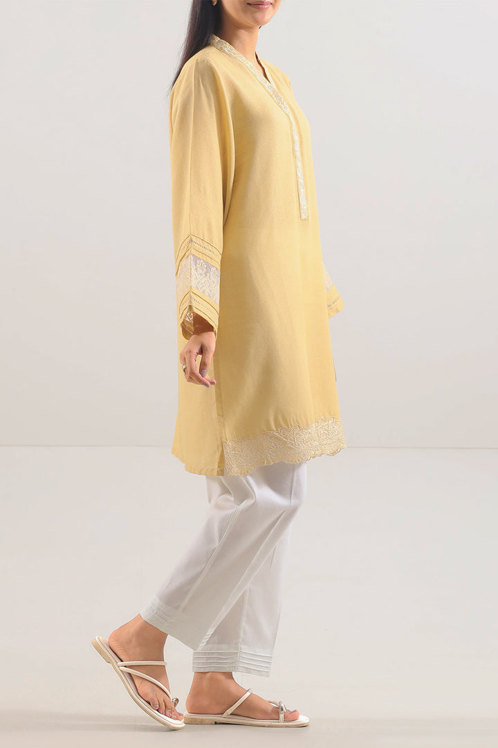 Solid Embroidered Karandi Stitched Shirt By SAYA Crafted From Premium Karandi Fabric — A Thick, Textured Cotton Blend Known For Its Warmth And Luxurious Feel. The Yellow Hue Brings A Bright, Cheerful Vibe, While The Delicate Tonal Embroidery Adds A Touch Of Sophistication Without Overpowering. Tailored With Clean Seams, A Sharp Collar, And A Smooth Finish, This Shirt Balances Practicality And Style With Poise. A Must-Have Piece That Elevates Your Look In Cooler Seasons With Distinct Elegance.